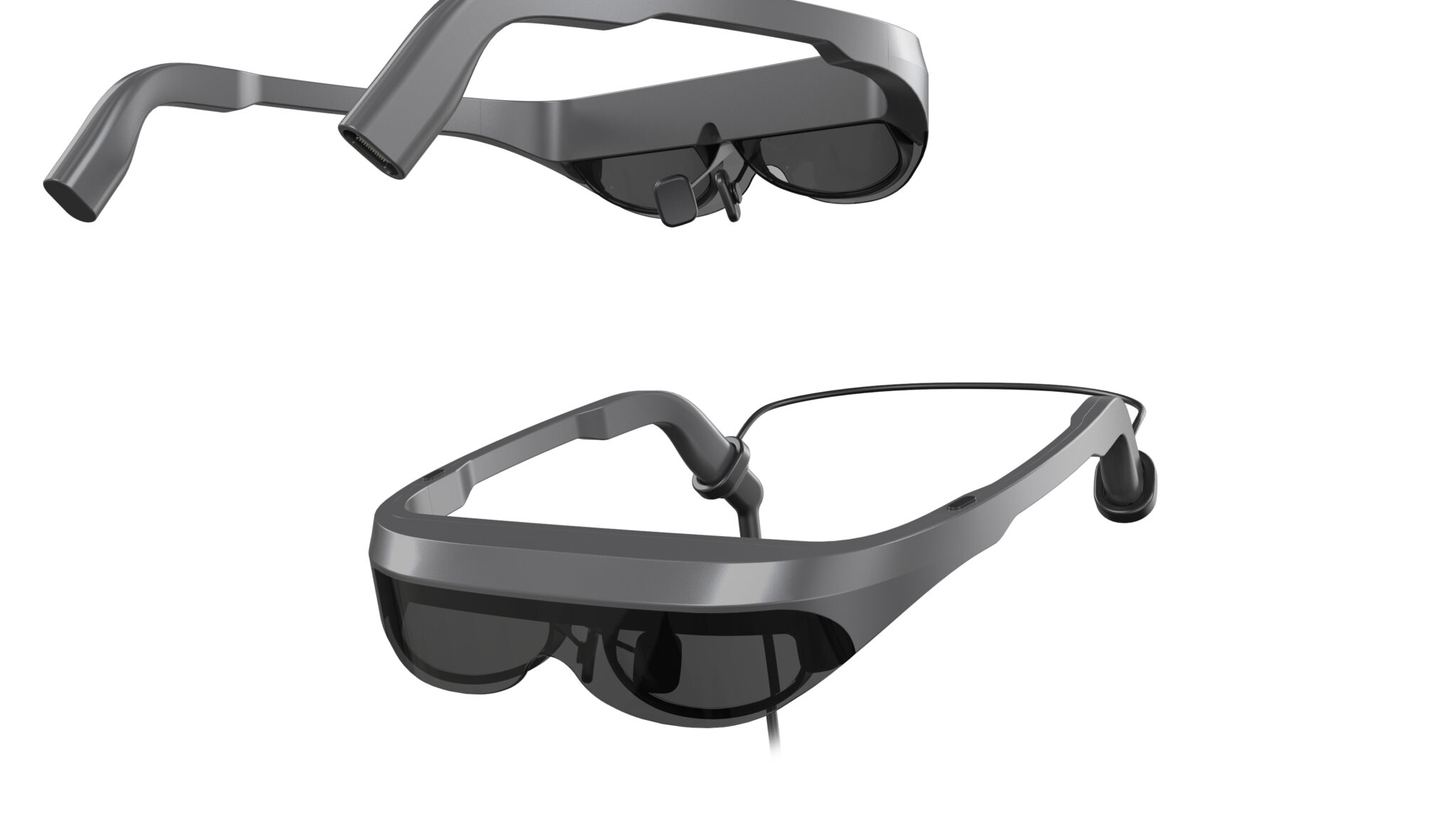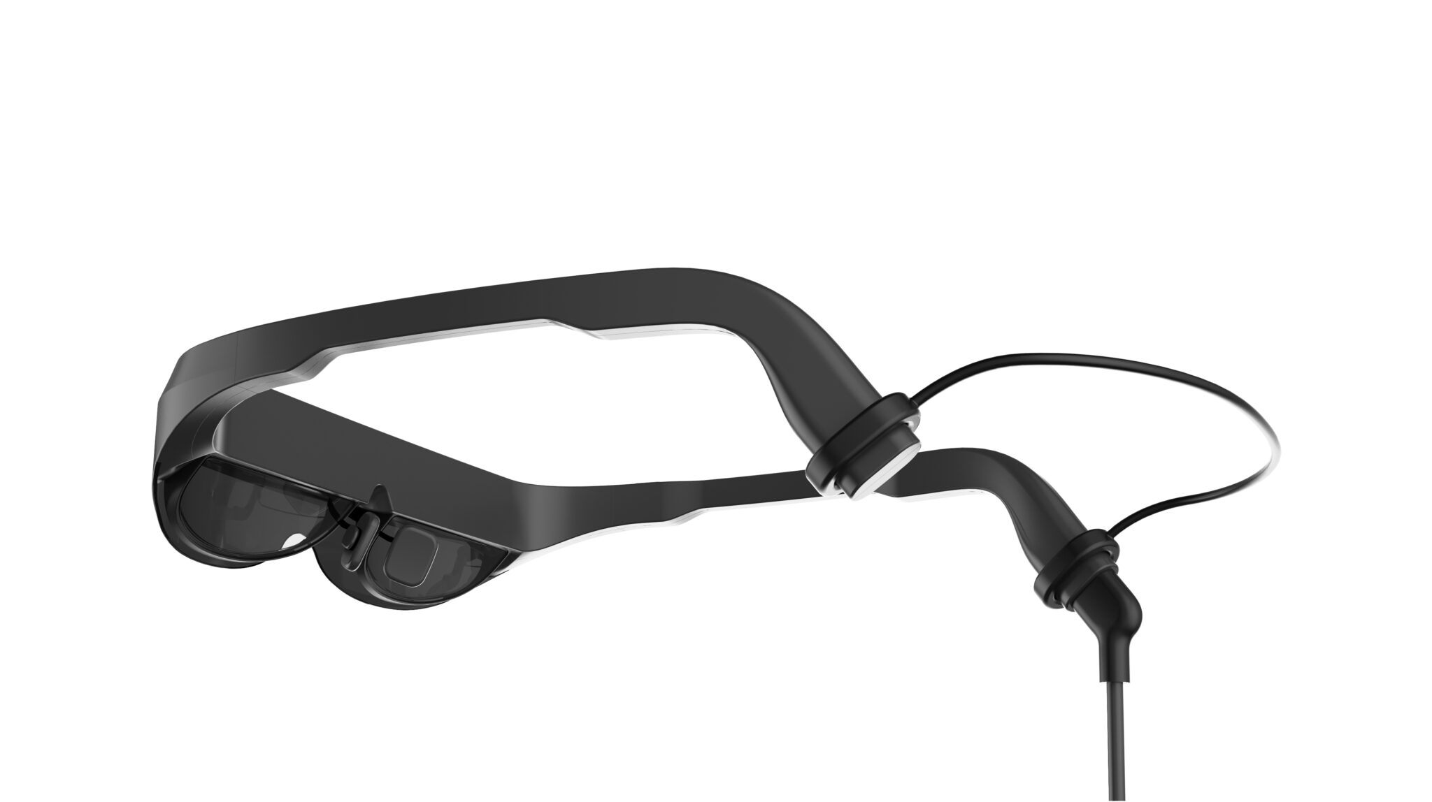 The silhouette is based on a standard eyewear form but features structural volumes that clearly identify it as function-oriented medical equipment. The thickness at the top and sides of the frame is a rational result of accommodating internal optical modules and electronic components, where functional necessity is expressed directly through form. The matte gray-toned frame conveys the reliability and calmness required of medical devices, while the lower dark lenses block visual noise to enhance concentration.