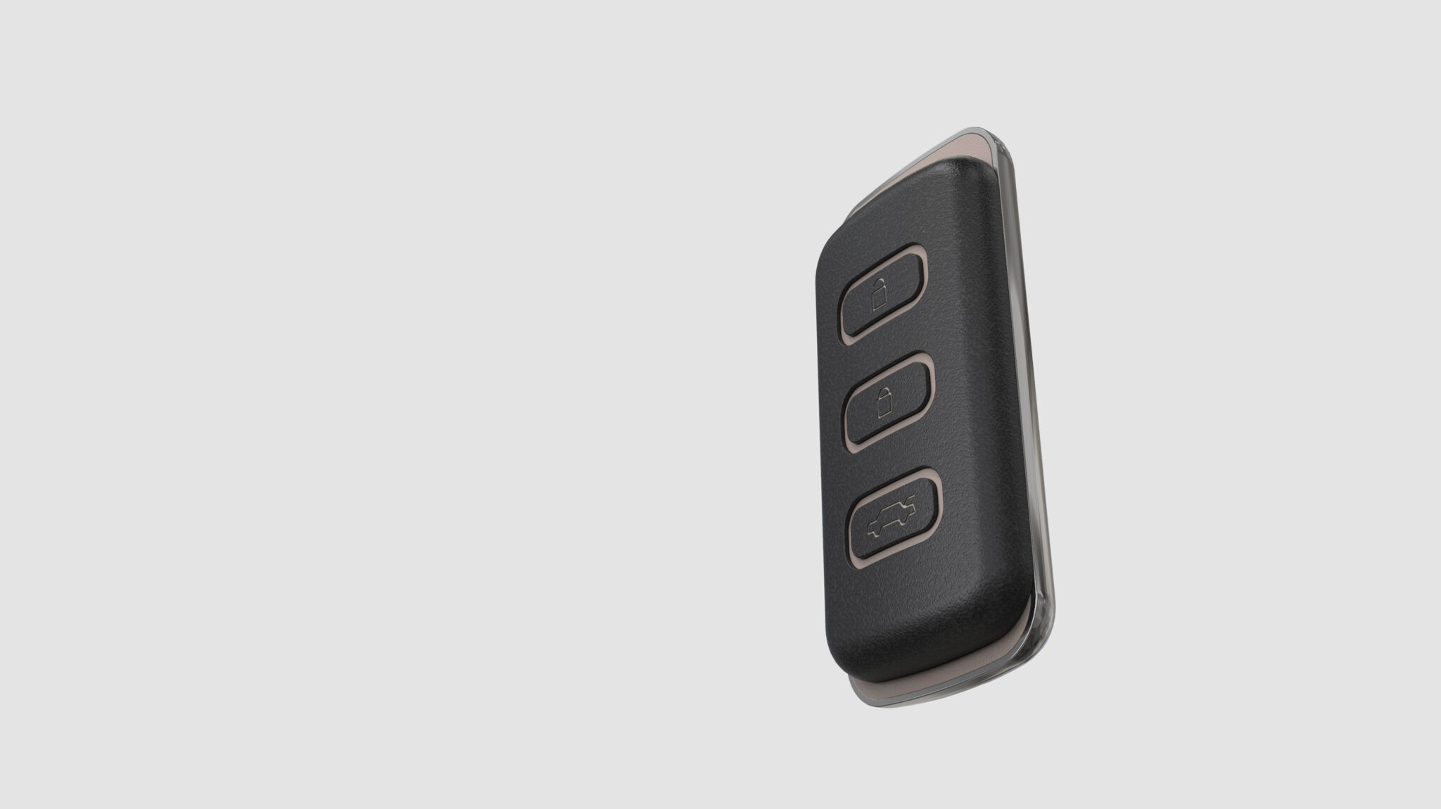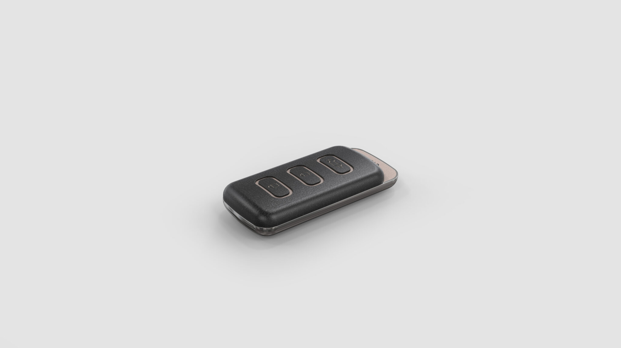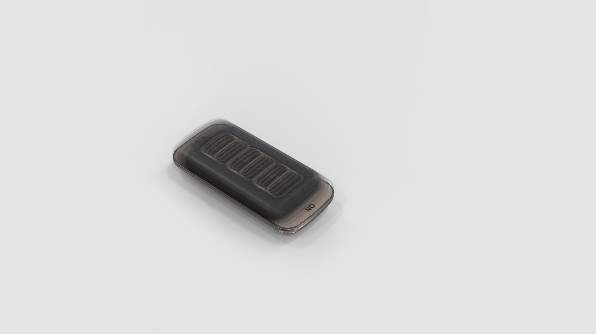 The overall silhouette is designed in a soft rectangle form, providing a comfortable grip and the stable feel characteristic of vehicle smart keys. The front buttons are aligned within the same rounded square frame to form an intuitive UI that reduces operational errors, with icon sizes, spacing, and visual contrast all organized into the smallest units for rapid recognition. The color point area at the bottom provides a visual anchor while clearly highlighting the important function of the trunk button (HOLD). The toned-down metal beige color maintains a luxurious feel while harmonizing naturally with the overall black and dark gray body.
