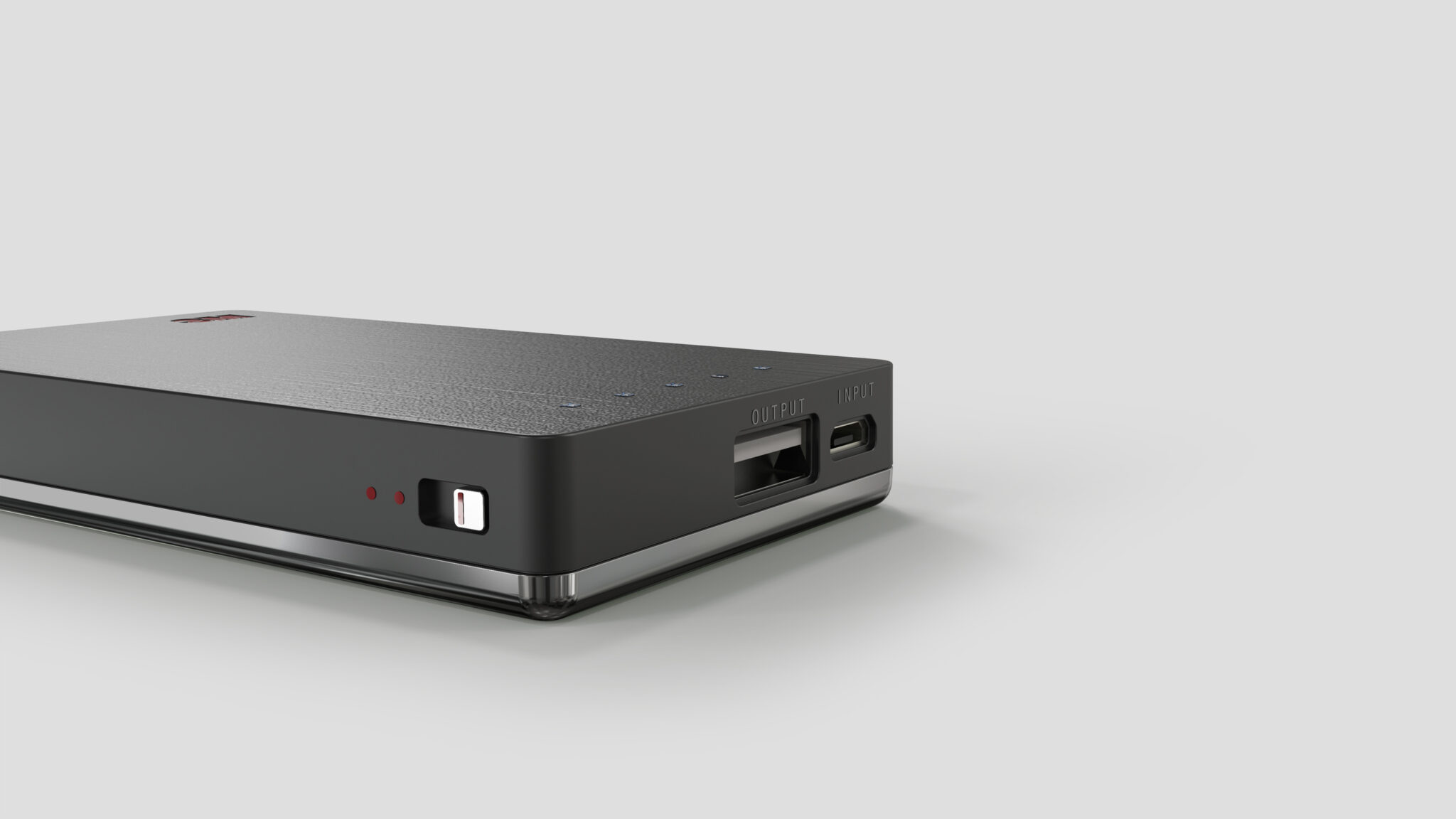 The overall form is based on a sharply restrained Slim Rectangular Body, and the Brushed Metal Texture on the top surface displays delicate textural changes depending on the direction of light, expressing the reliability of a small but powerful Function-Oriented Product.