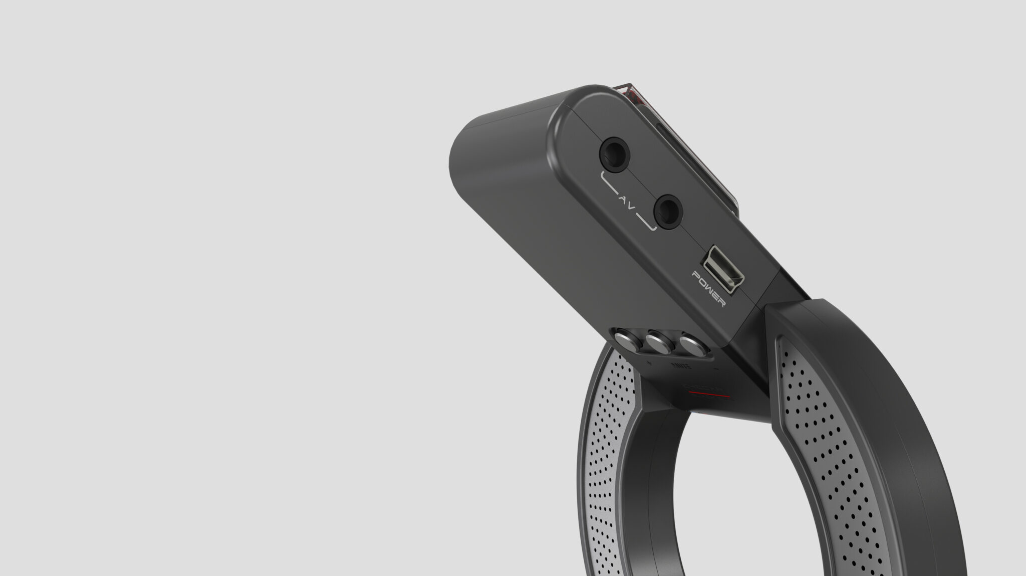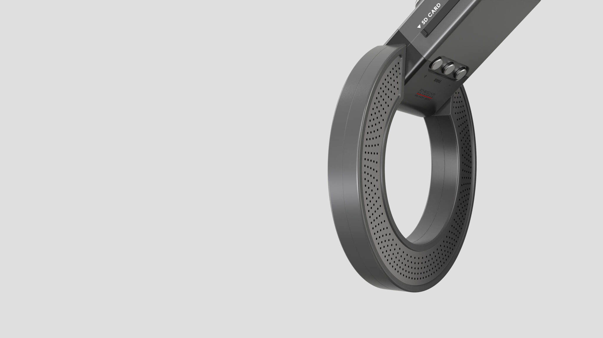 상단부의 모듈은 카메라·저장·전원 등 핵심 기능을 집중 배치한 헤드 유닛으로 원형 프레임과 대비되는 직선형 볼륨을 사용하여 기능적 구획을 명확하게 드러낸다.