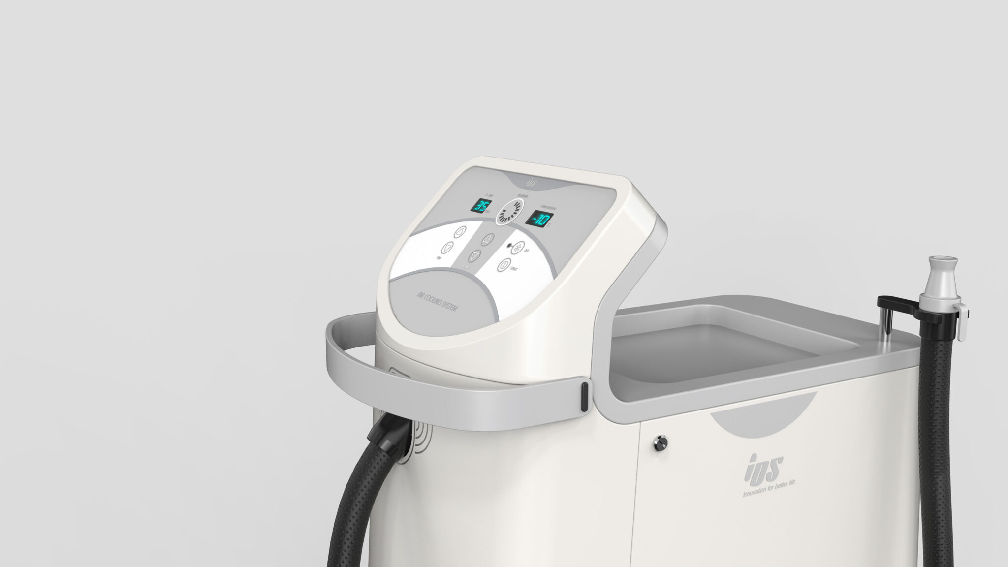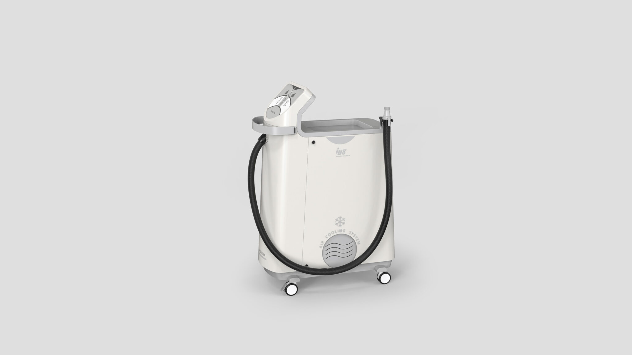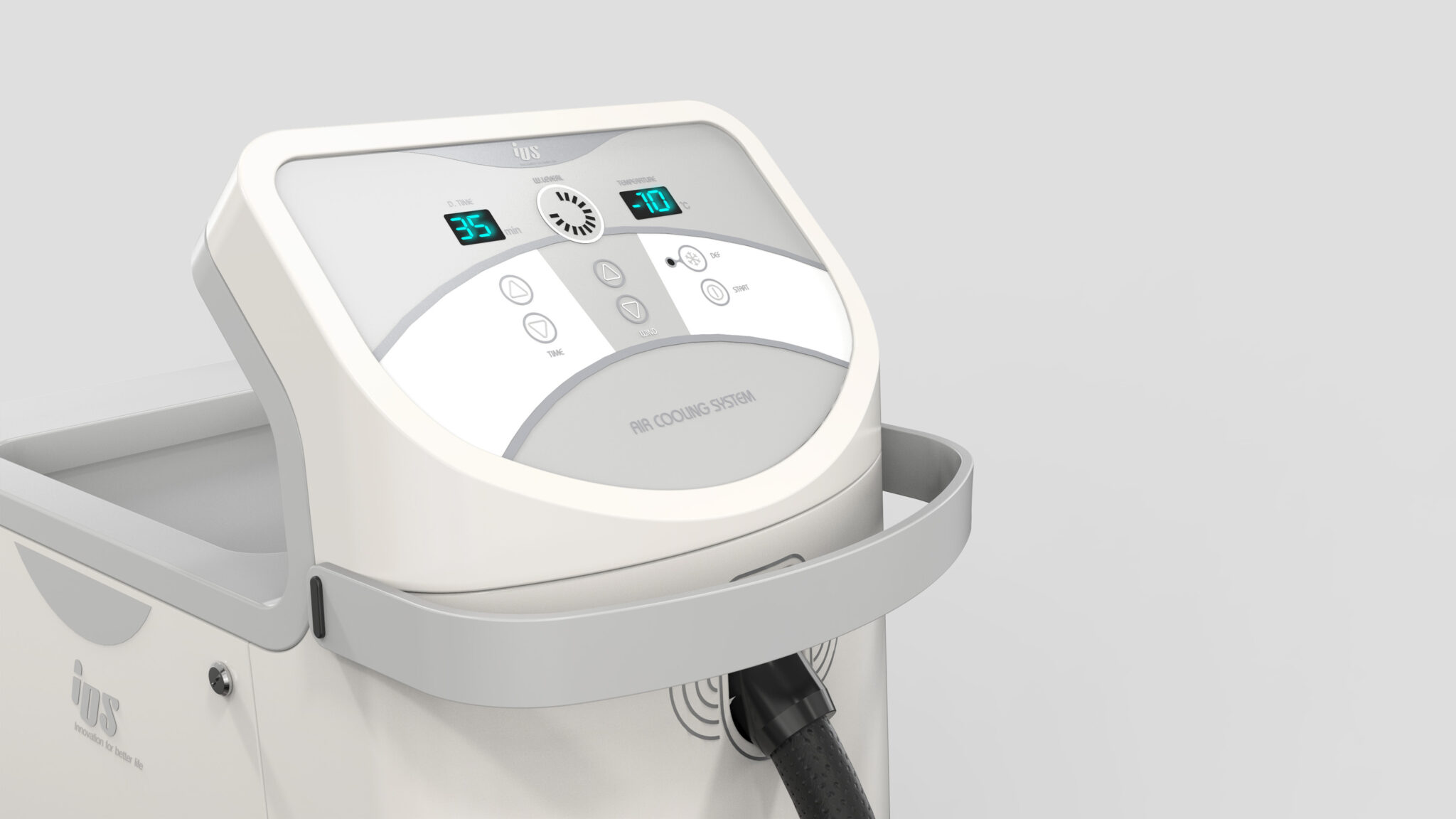 측면의 호스 정렬과 배치 구조는 시술자의 작업 환경을 고려해 최대한 간섭 없는 케이블 매니지먼트가 이루어지도록 설계되었고, 하단의 원형 흡·배기 패턴은 냉각 기능을 은유적으로 표현하며 장비의 정체성을 시각적으로 강화하는 심볼릭 아이콘 요소로 작동한다.