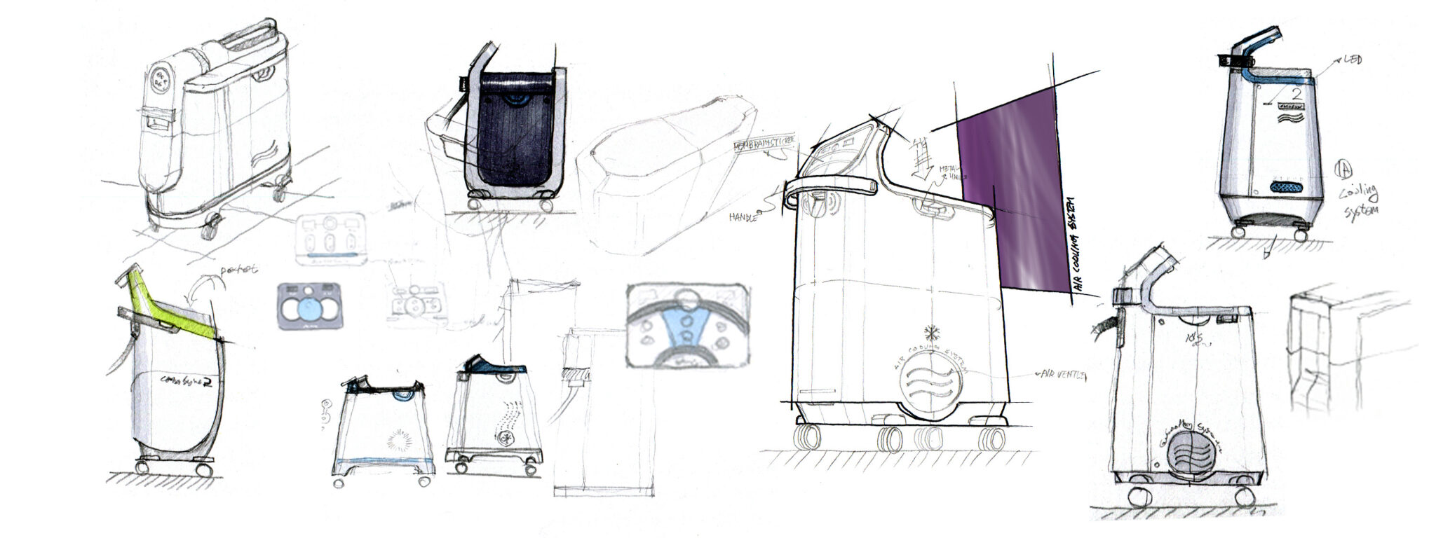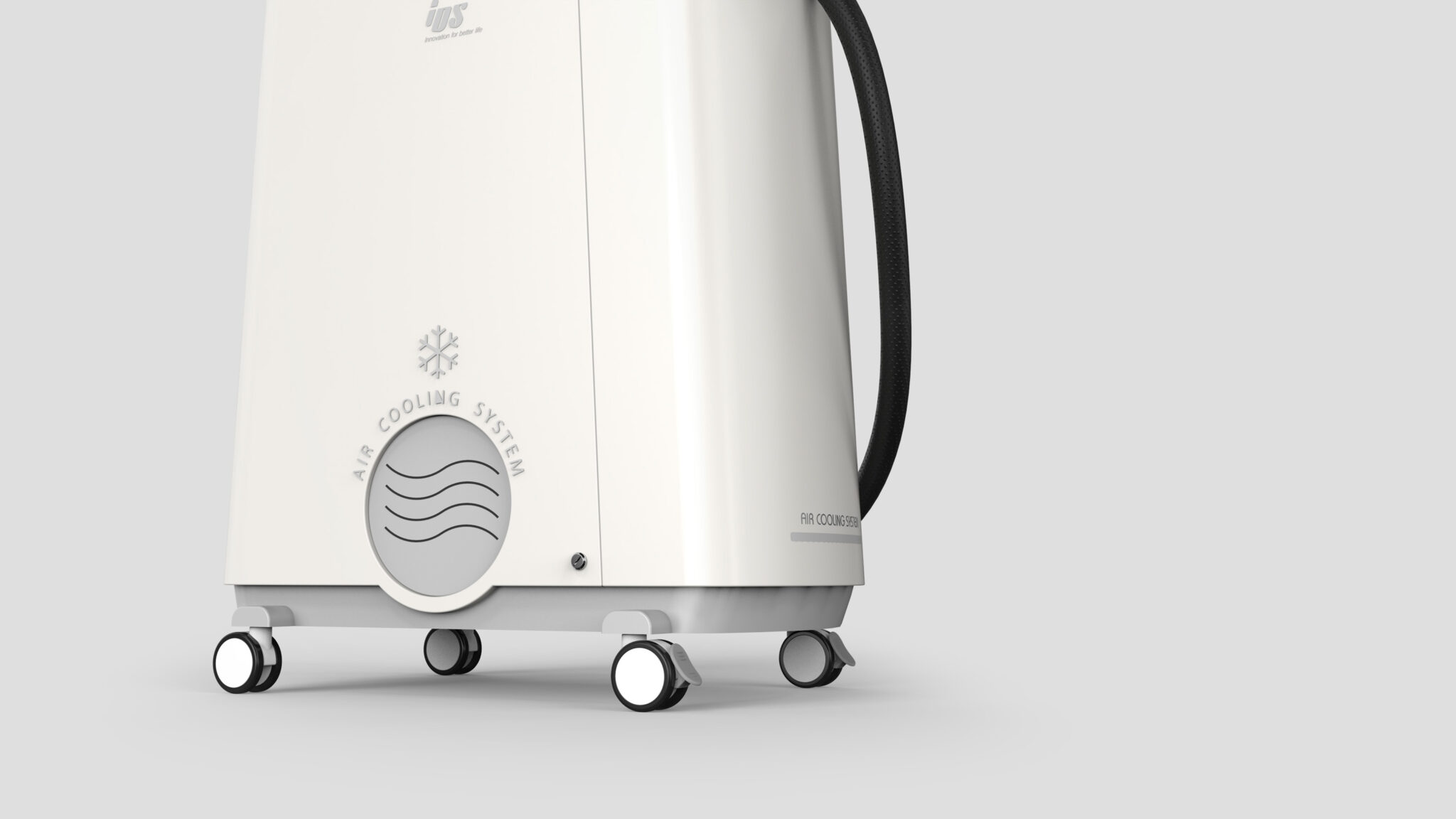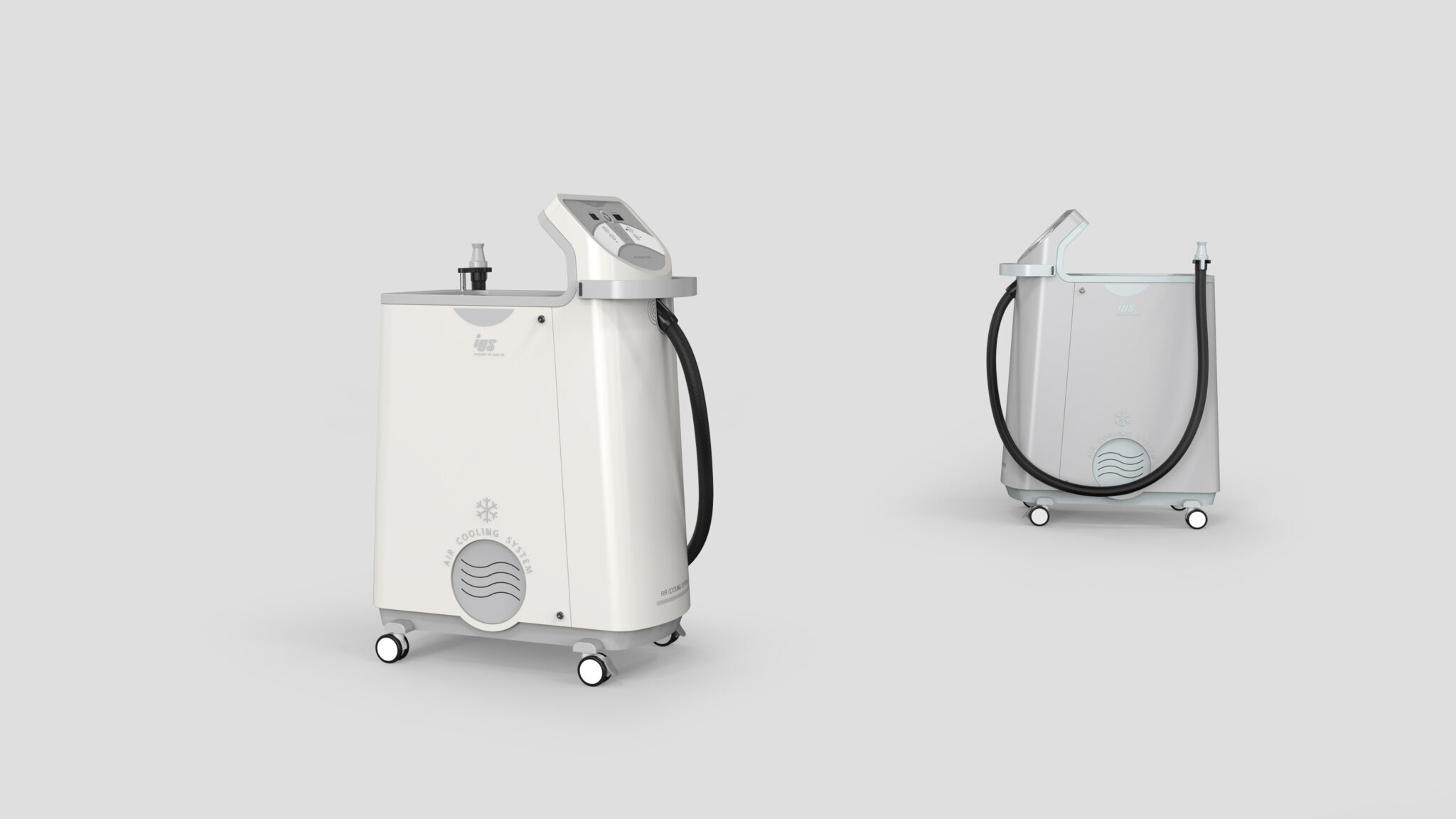 측면의 호스 정렬과 배치 구조는 시술자의 작업 환경을 고려해 최대한 간섭 없는 케이블 매니지먼트가 이루어지도록 설계되었고, 하단의 원형 흡·배기 패턴은 냉각 기능을 은유적으로 표현하며 장비의 정체성을 시각적으로 강화하는 심볼릭 아이콘 요소로 작동한다.
