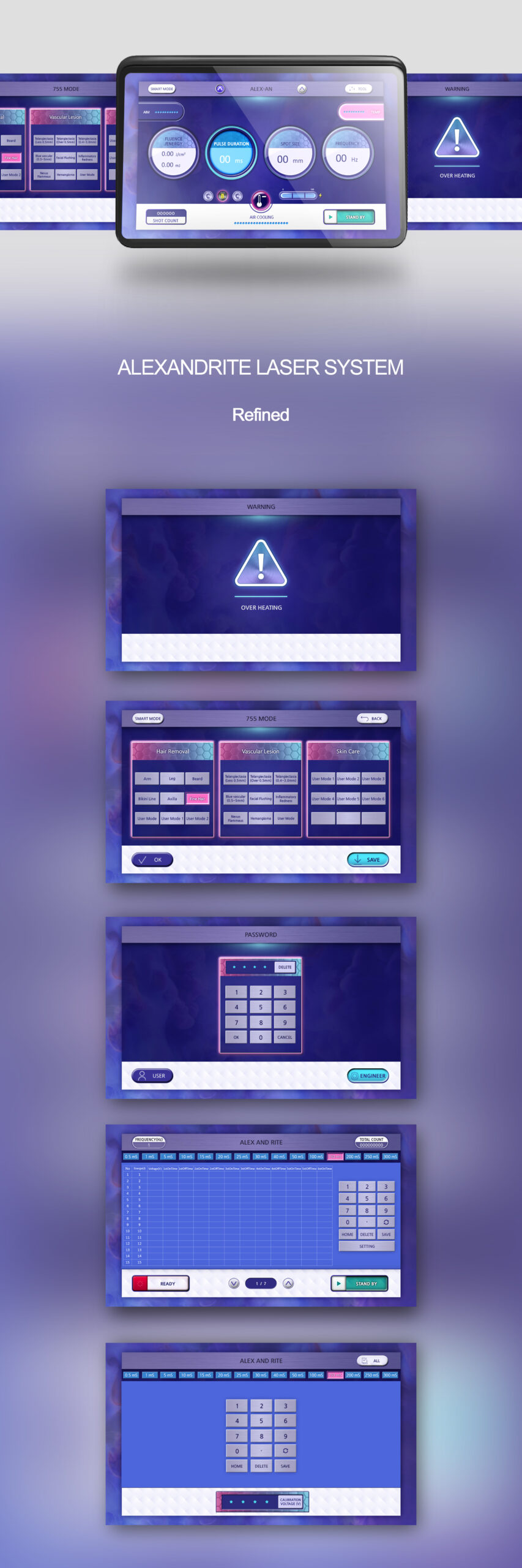 배경에 적용된 딥 퍼플·블루 그라데이션 텍스처는 고에너지 광학 장비의 기술적 이미지를 우아하게 표현하며,알렉산드라이트 레이저의 ‘광학 깊이감’을 UI 전체에 자연스럽게 녹여낸다.