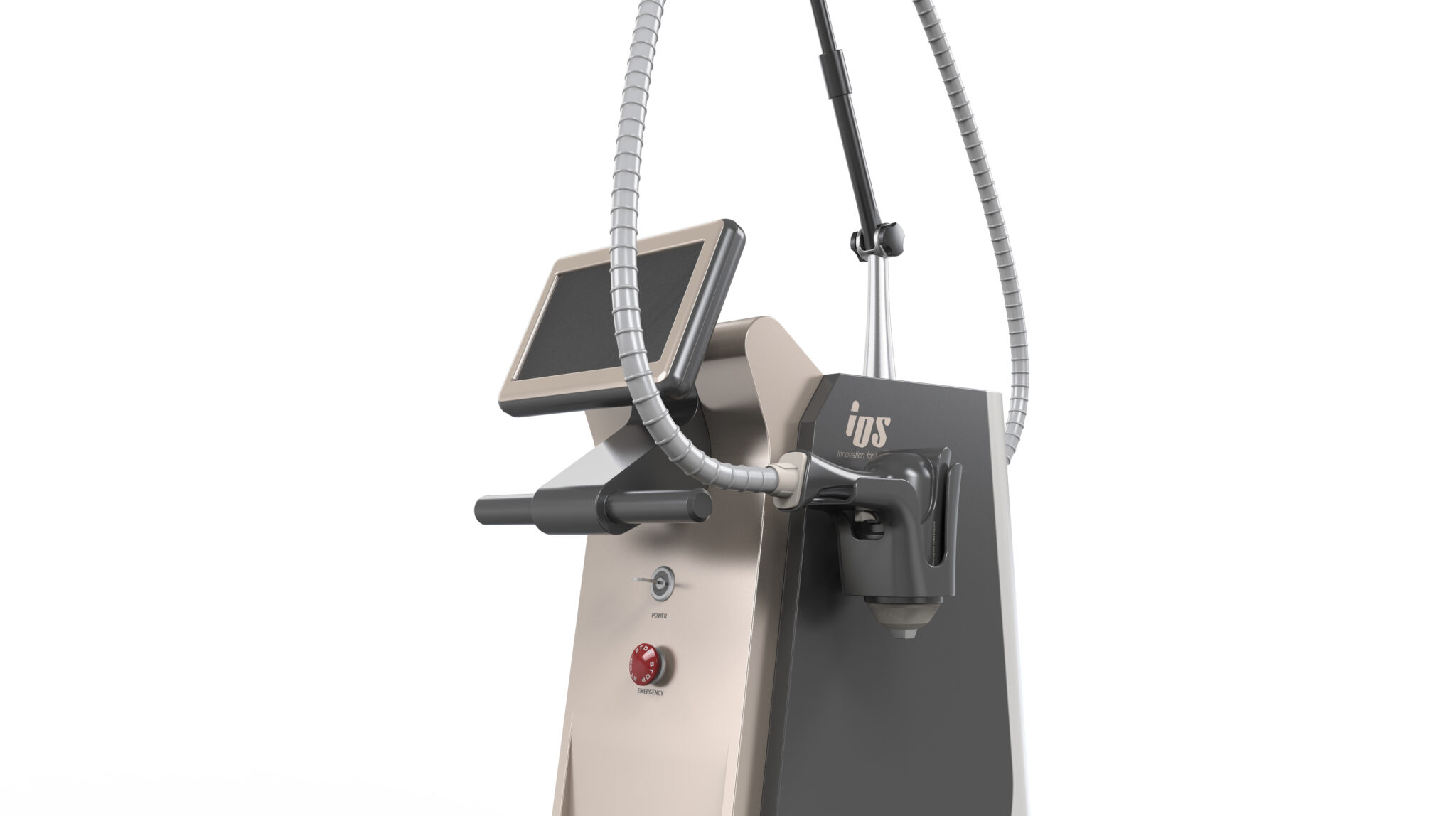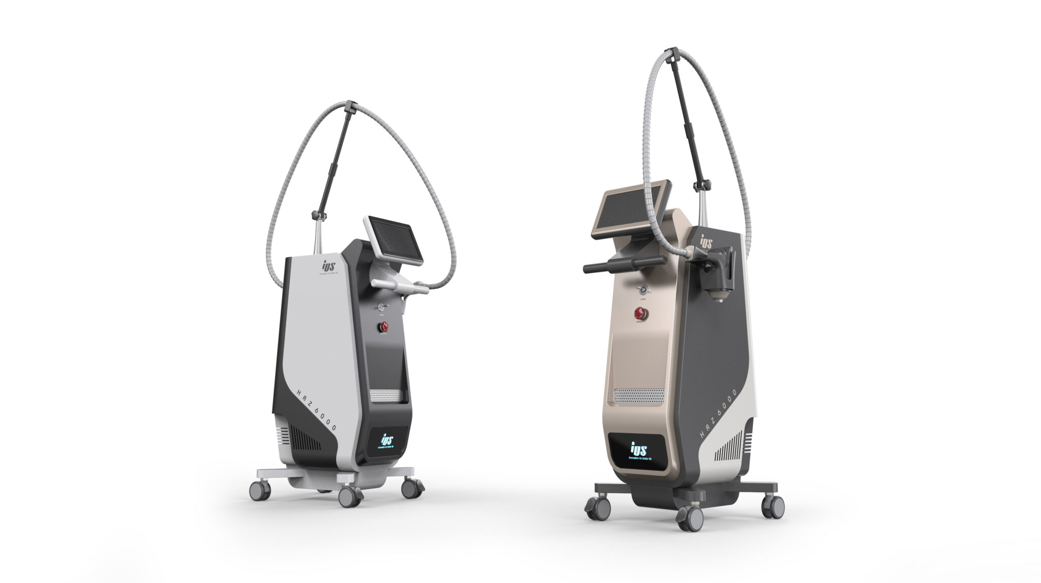 이 디자인은 피부과·에스테틱 의료 환경에서의 ‘전문성’과 ‘안정감’을 시각적으로 구조화한 메디컬 타워형 디바이스를 지향한다. 전체 실루엣은 전면이 슬림하게 정리된 수직형 볼륨을 중심으로 구성되어, 공간 점유를 최소화하면서도 장비가 갖춰야 할 기술적 신뢰성을 명확하게 전달한다. 이는 시술 공간에서 장비가 주인공이 되기보다는, 의료 행위를 안정적으로 지원하는 배경적 존재로 기능하도록 설계된 형태 언어다.