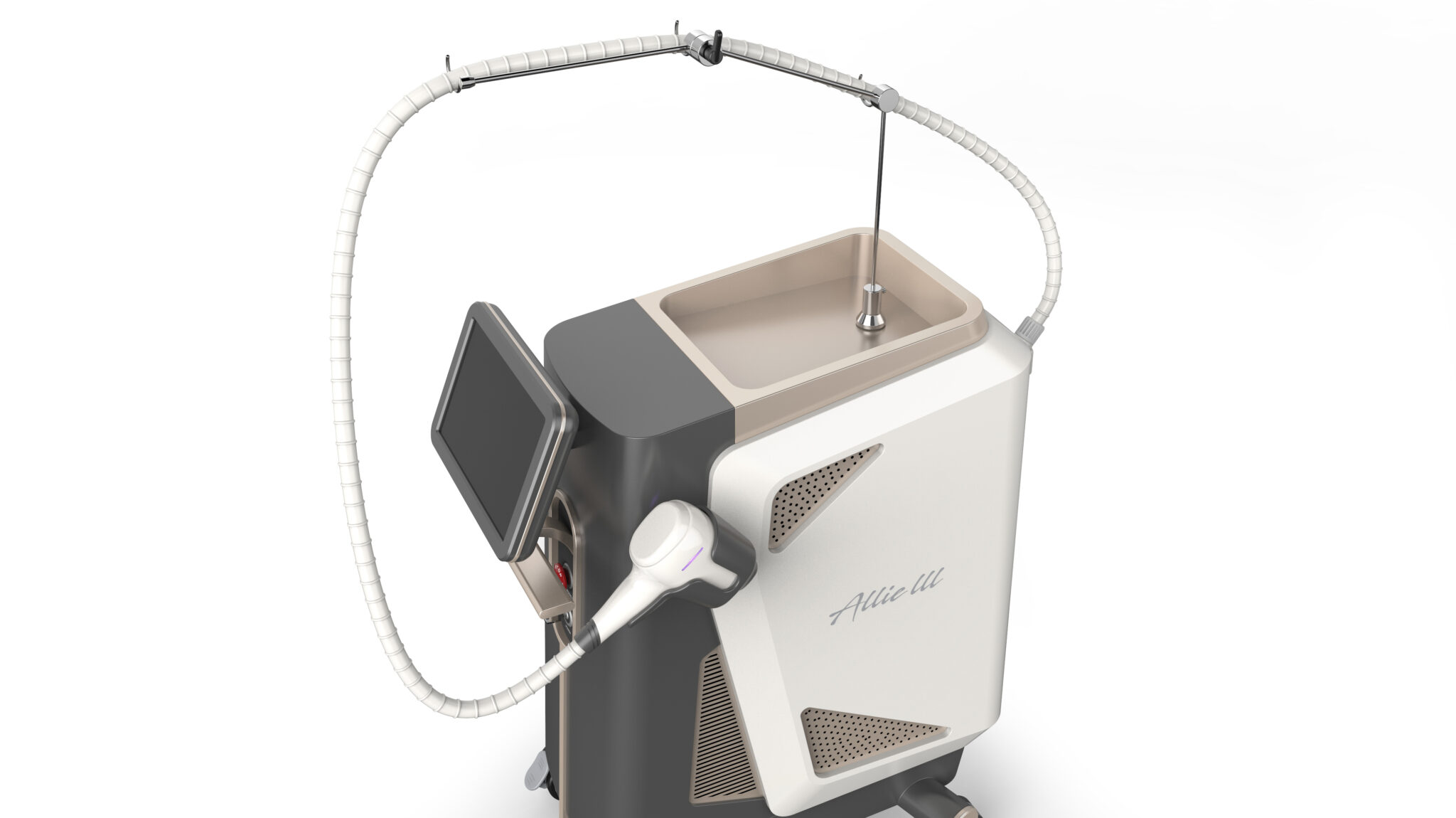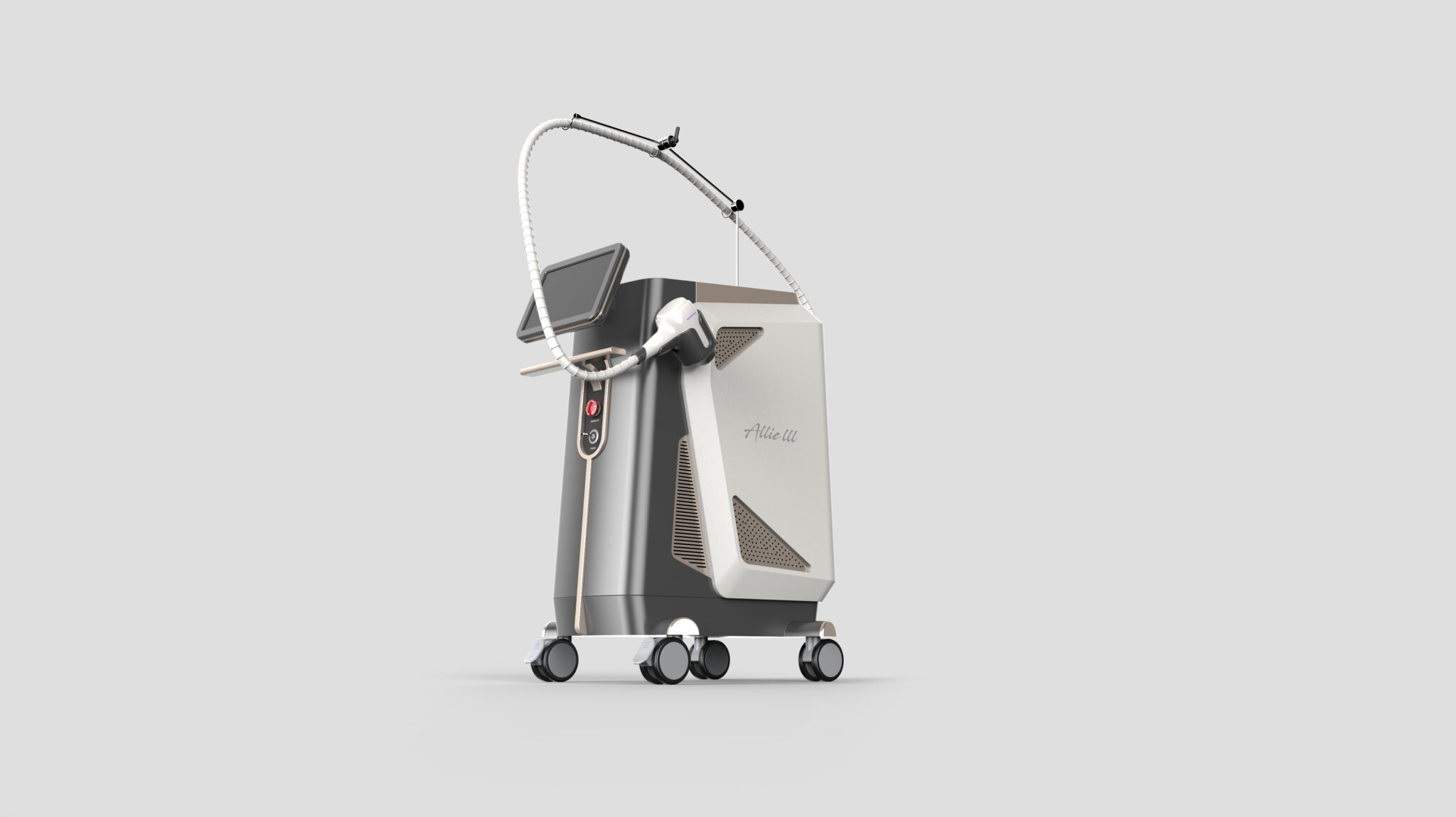 상단에 배치된 디스플레이와 플렉시블 암 구조는 시술자의 동선과 시야를 고려한 인체공학적 설계를 반영한다. 암의 곡선 흐름은 기계적인 인상을 최소화하면서도, 반복적인 시술 환경에서도 안정적인 포지셔닝을 가능하게 한다. 이는 사용 행위를 복잡하게 만들지 않고, 자연스러운 의료 동작의 연장선으로 장비를 인식하게 하는 핵심 요소다.