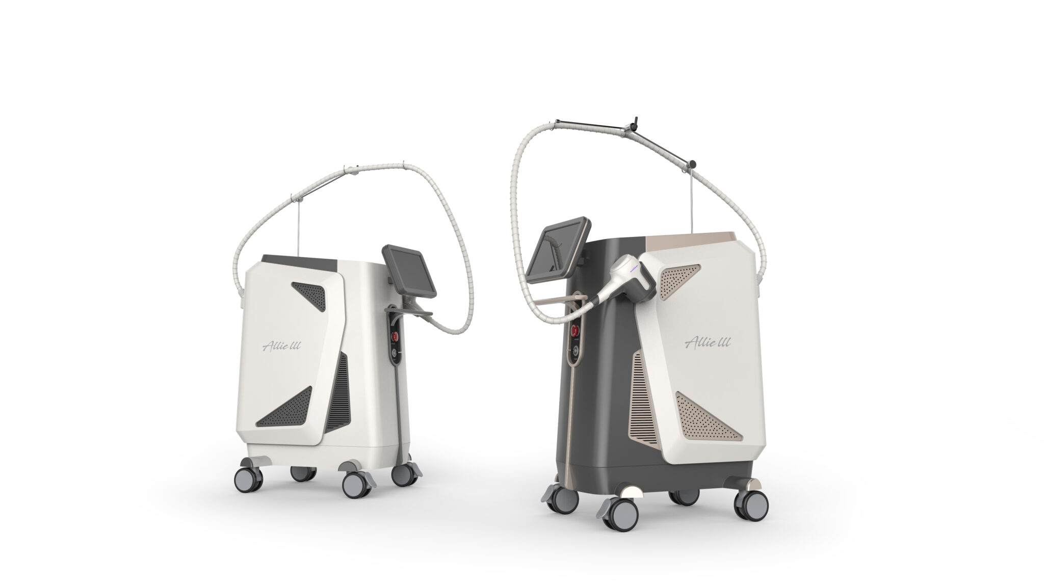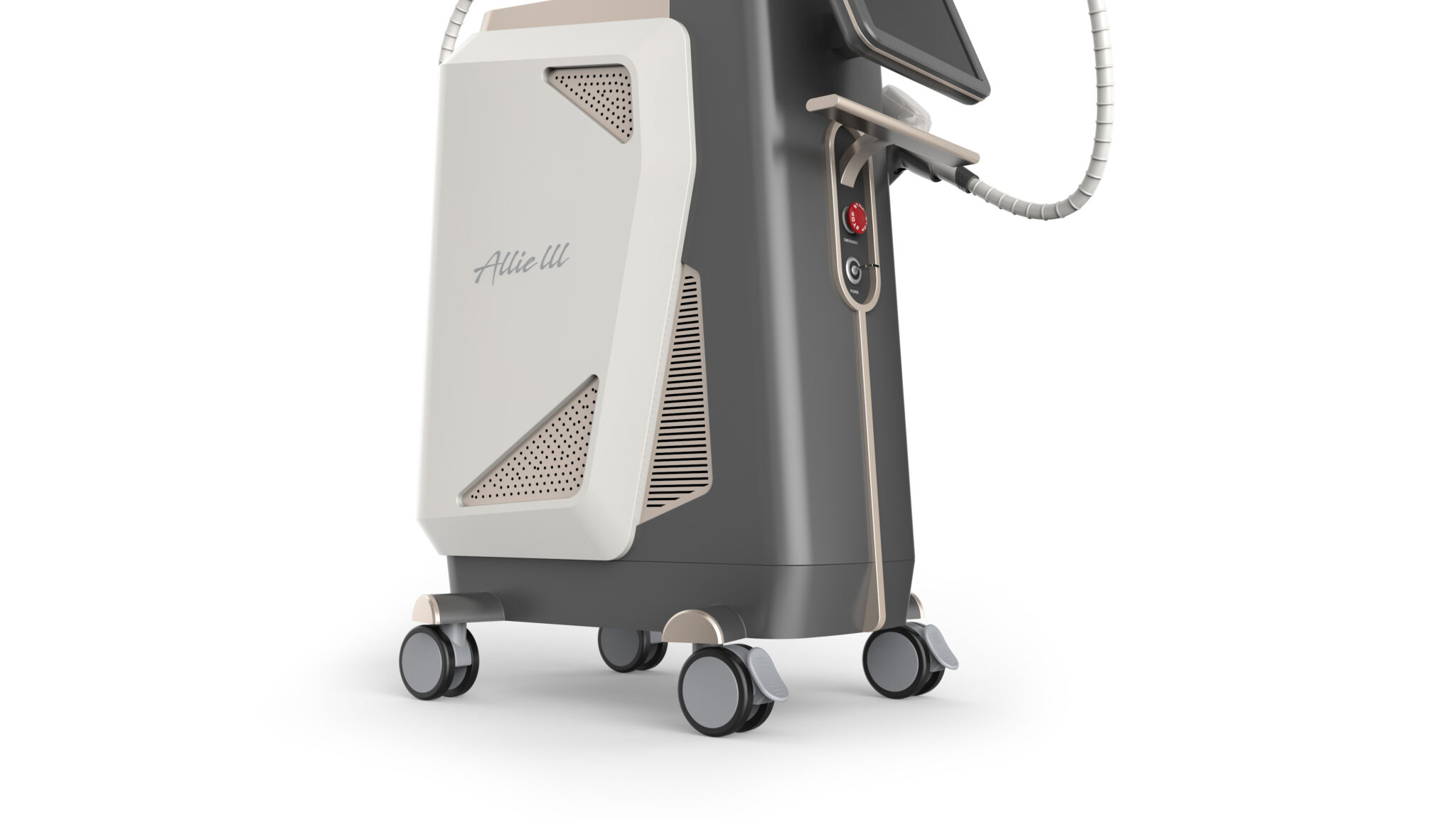 전·후면의 패널은 완만한 곡면과 명확한 면 분할로 구성되어 있으며, 기능 영역과 구조 영역을 자연스럽게 구분한다. 특히 측면의 통풍 패턴과 포인트 컬러는 단순한 기능 요소를 넘어, 기술적 신뢰성을 시각적으로 정돈하는 역할을 수행한다. 컬러 조합은 웜 화이트와 딥 그레이를 중심으로 구성되어, 에스테틱 클리닉 환경에 적합한 차분하고 고급스러운 분위기를 형성한다.
