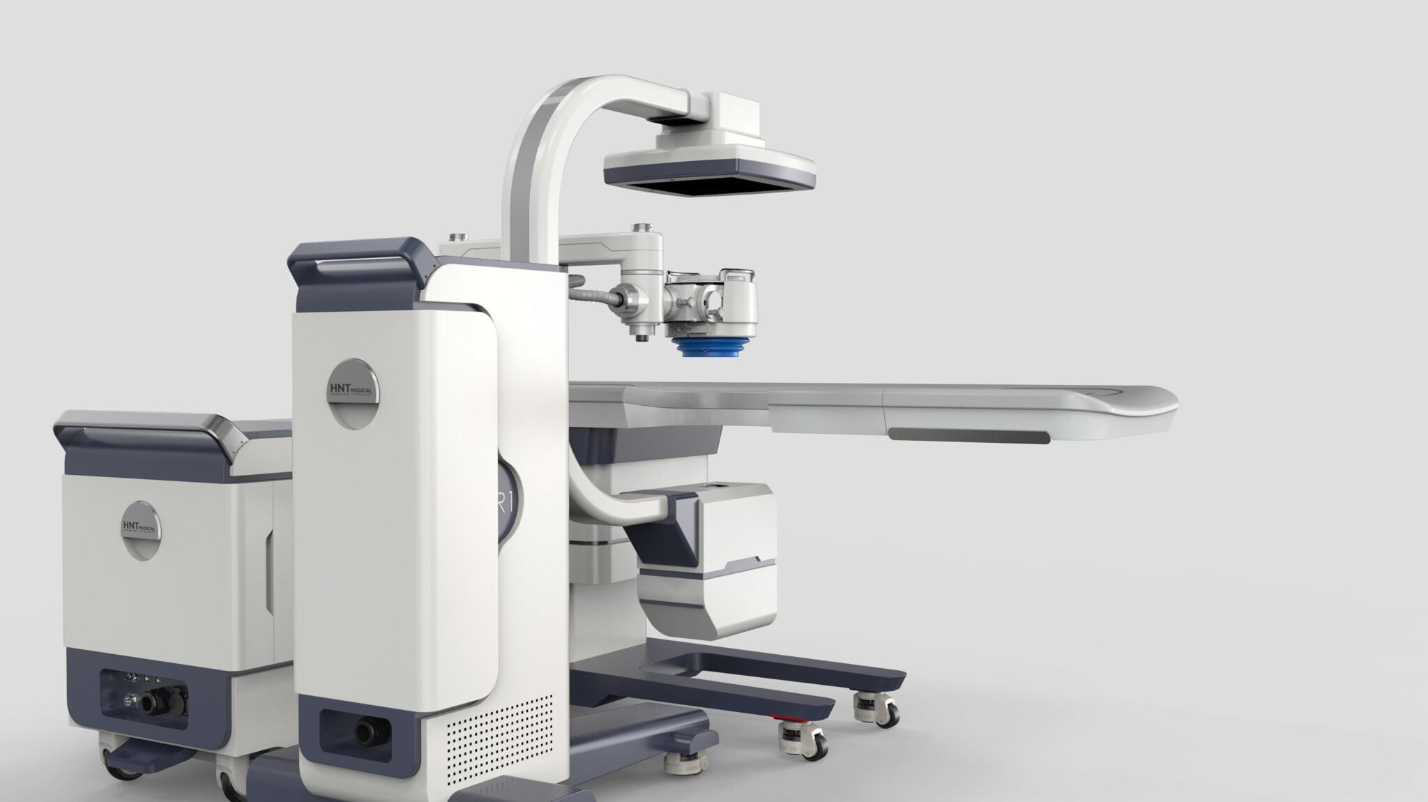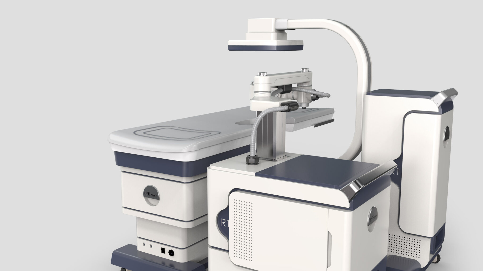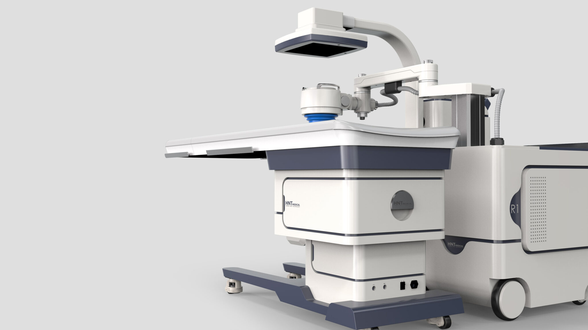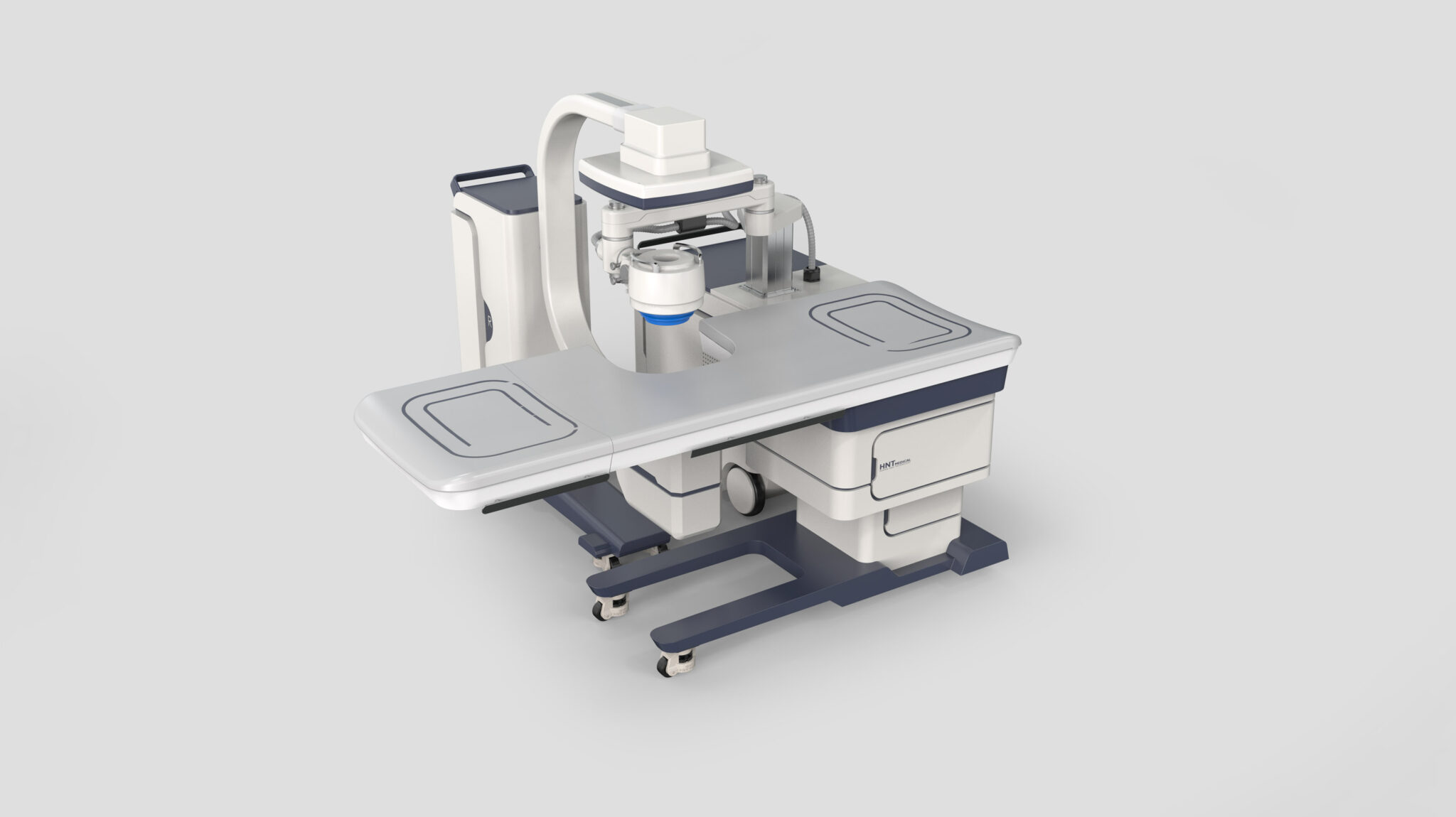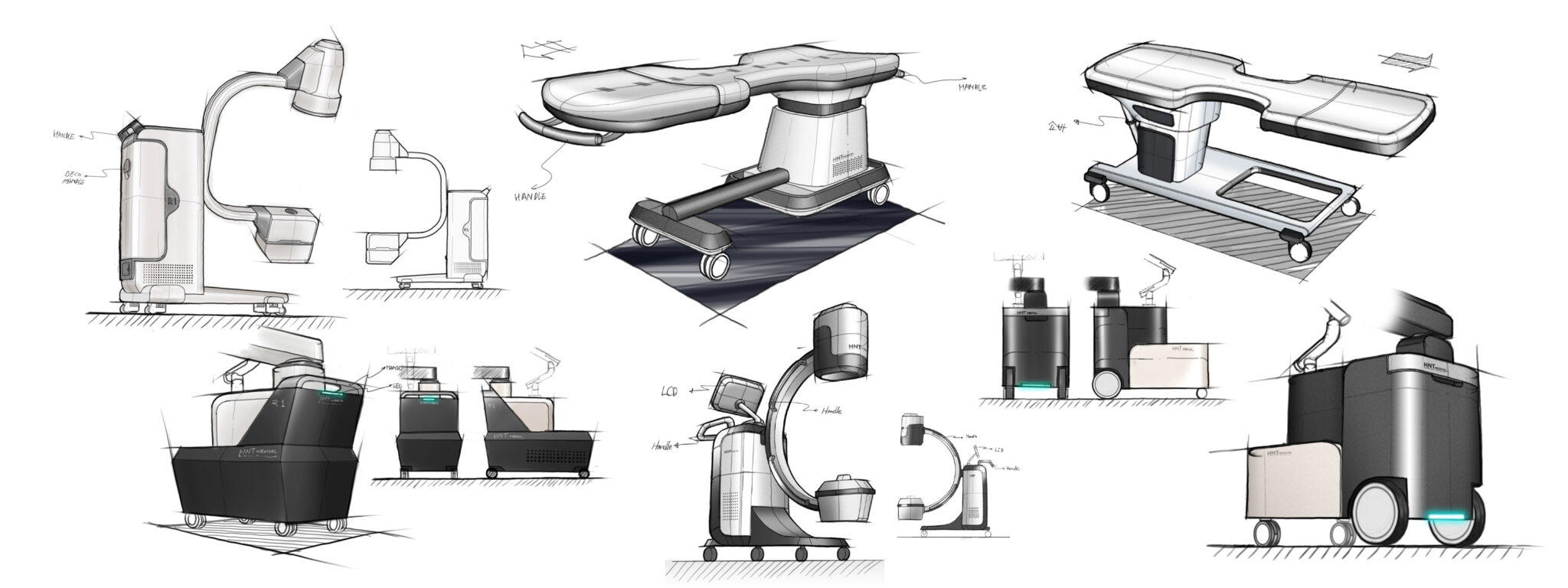 테이블, 충격파 모듈, C-Arm은 각각의 메커니즘을 보존하면서도 시각적으로는 단일한 유닛처럼 연결되는 구조적 통일감을 갖는다. 상판의 유선형 라인과 라운딩 엣지는 환자의 심리적 압박감을 최소화하며 의료진에게는 장비의 기술적 복잡성을 감춘 Soft-Tech 이미지를 제공한다.