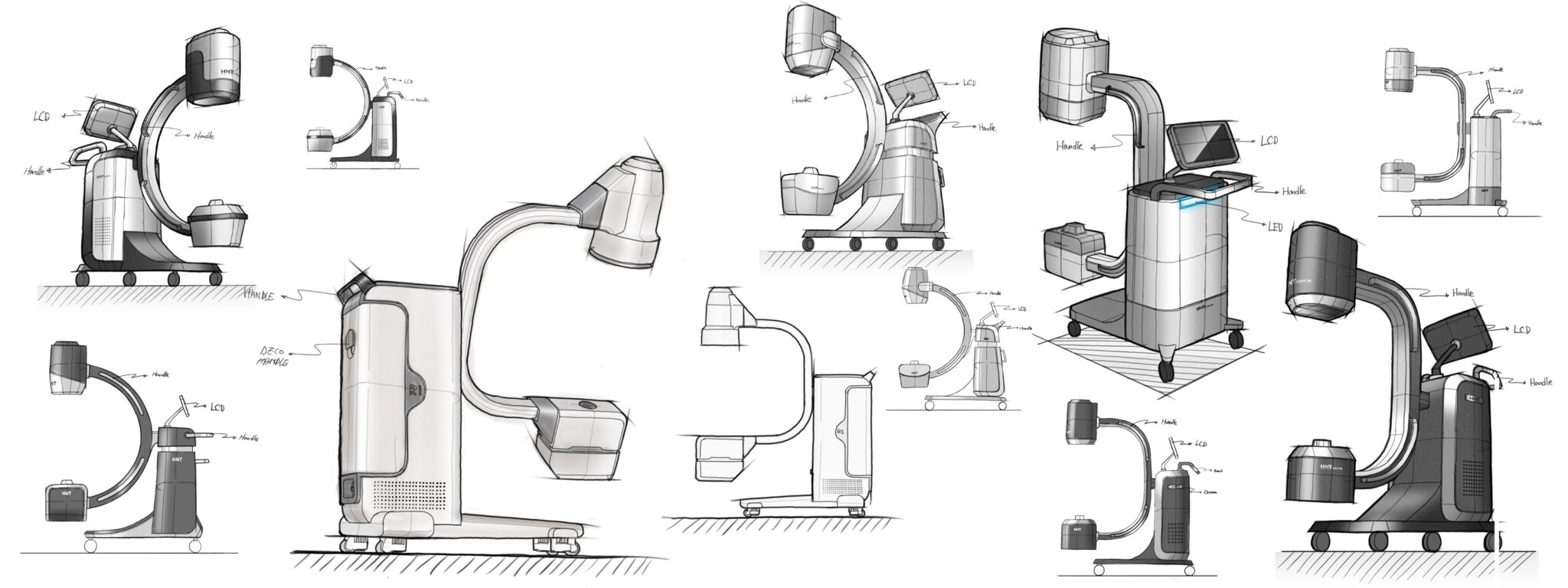 이 디자인은 정밀 의료 환경에서의 안정적 조작과 신뢰성을 최우선 가치로 두고 설계된 ‘Clinical Mobility System’을 핵심 컨셉으로 한다. 전체적인 실루엣은 C-ARM의 부드러운 곡선과 본체의 수직적 구조가 조화롭게 연결되며, 장비의 기능적 움직임을 시각적으로 명확히 드러내되 시각적 과밀감을 최소화한 미니멀 엔지니어링(Minimal Engineering) 조형을 적용했다.