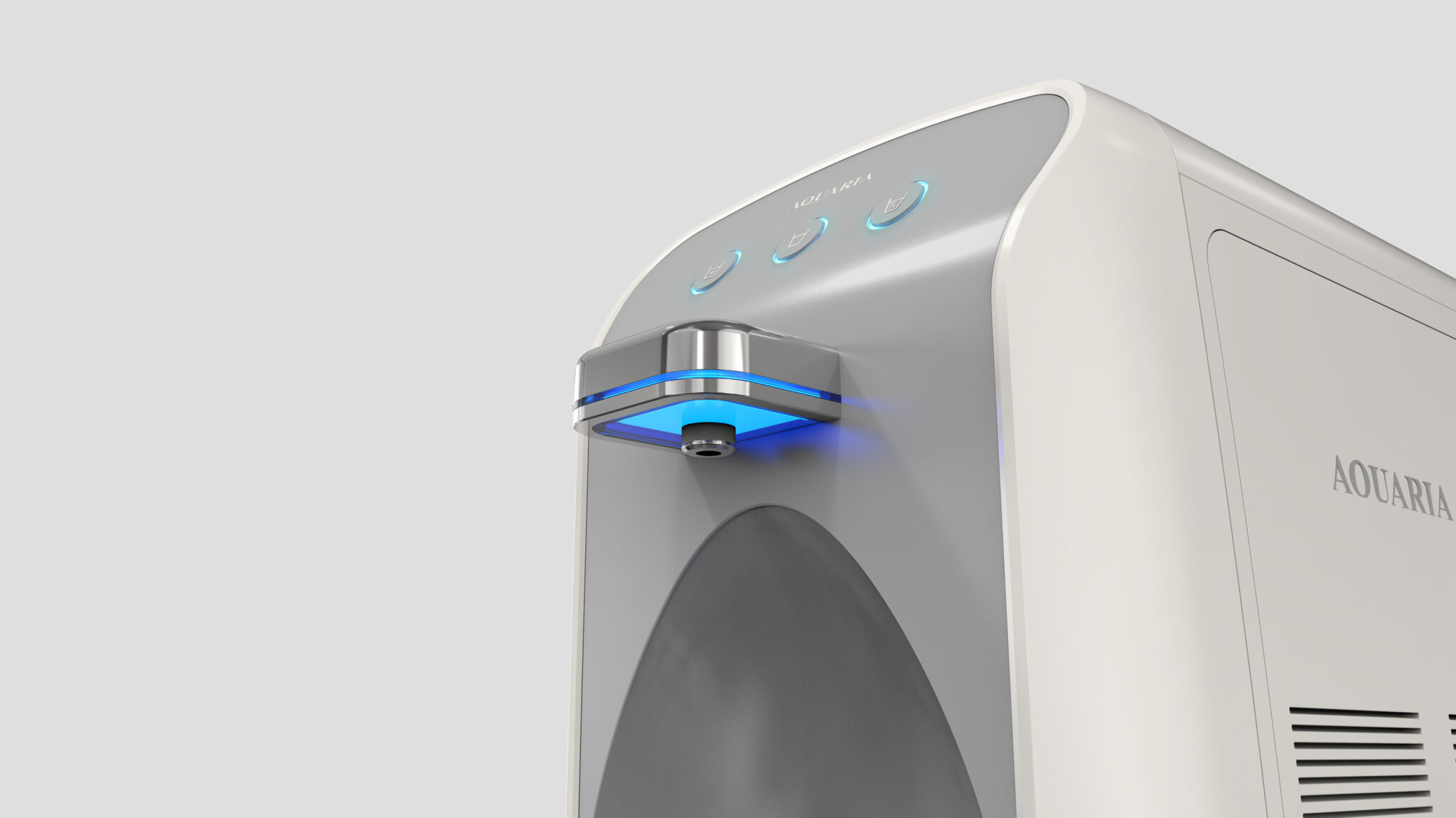 전면의 아치형 디스펜서 구조는 물 또는 탄산수가 떨어지는 사용 행위를 시각적으로 유도하는 ‘기능적 동선 곡선(Functional Curve)’의 역할을 하며, 사용자가 컵을 자연스럽게 위치시키도록 한다. 여기에 LED 앰비언트 조명 포인트를 적용해 조작 상태, 위생 상태, 음료 준비 상태를 시각적으로 전달함으로써 안심감과 프리미엄 경험을 동시에 제공한다.