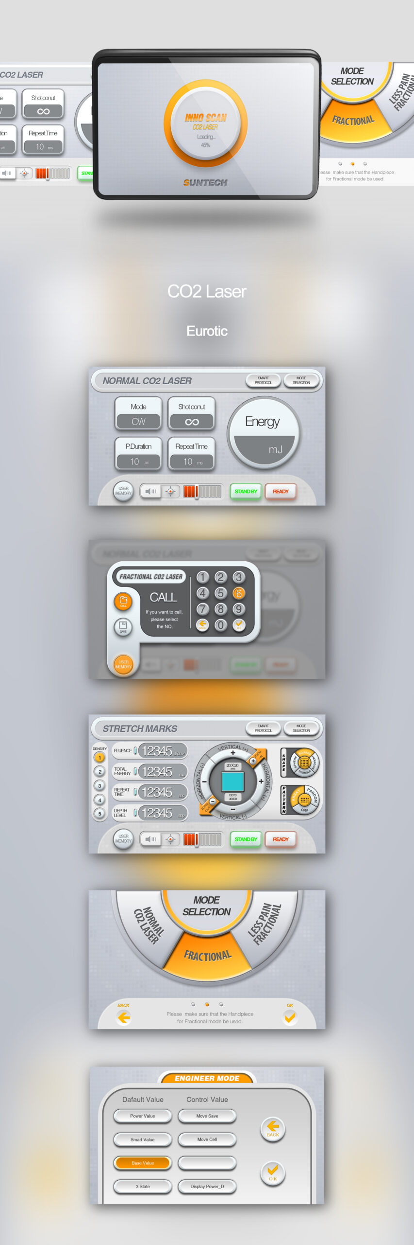UI 구조는 사용자가 시술 모드와 에너지 설정을 빠르게 인지할 수 있도록 모드 분류 → 수치 입력 → 실행 상태의 명확한 정보 계층(Hierarchy)으로 구성되어 있다. 중앙 원형 UI는 CO₂ 레이저 장비의 성능적 이미지를 반영하여, 엔지니어링 디바이스처럼 기계적·정밀적 조작감을 시각적으로 표현한 핵심 요소로 작동한다.각 버튼은 라운딩된 3D 입체 형태로 설계되어 촉각적 안정감을 시각적으로 제공하며, 색상 대비를 통해 ‘사용 가능’, ‘주의’, ‘시술 준비’ 등 상태를 직관적으로 구분할 수 있다. 특히 오렌지 포인트 컬러는 핵심 기능을 강조하고 브랜드 감성의 일관성을 형성하며, 사용자 시선의 흐름을 자연스럽게 유도한다.