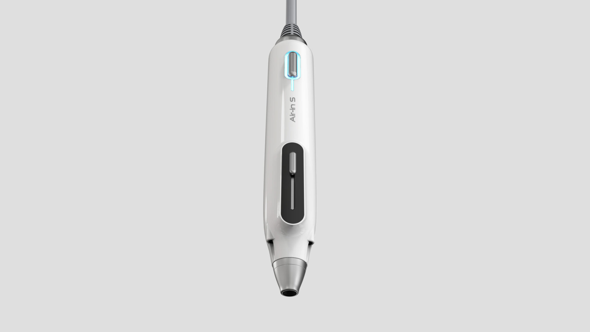 상부의 인디케이터와 세로형 인터페이스 라인은 단순한 장식이 아니라 사용 흐름을 시각적으로 안내하는 축(Visual Axis)의 역할을 하며, 의료기기에서 중요한 직관성과 상태 인지성을 강화한다. 또한 바디의 매끈한 곡면과 절제된 분할은 위생 관리가 용이하도록 고려된 설계로, 클린한 이미지를 유지하면서도 실제 임상 환경에 대응하는 실용적 조형이라 할 수 있다.