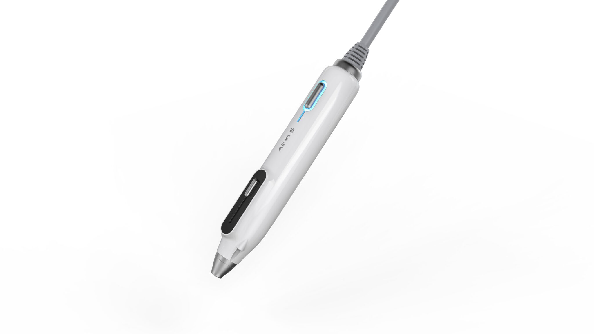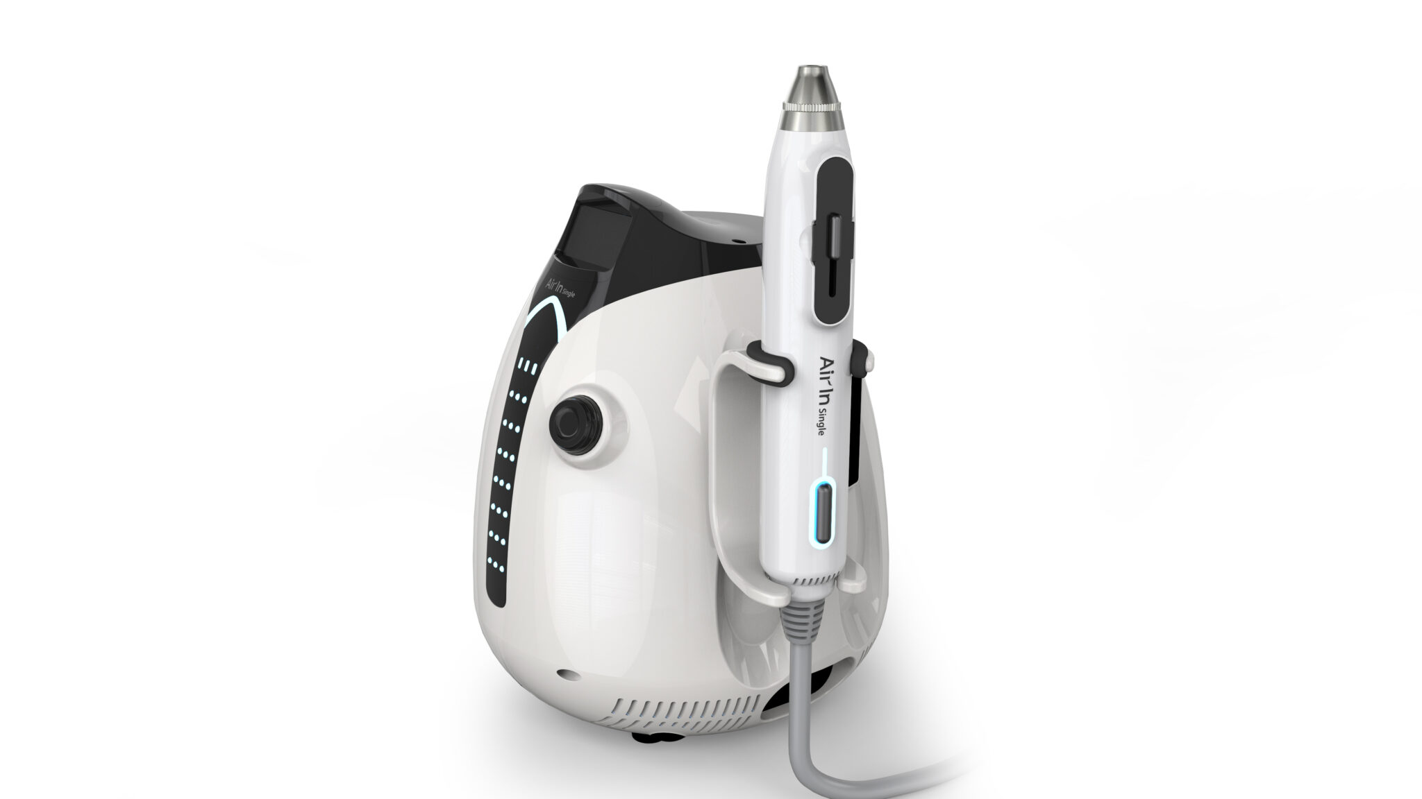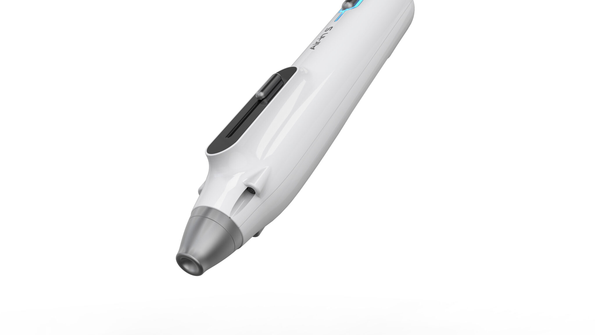 의료·피부미용 장비에 적합한 정제된 기능미(Functional Minimalism)를 기반으로, 불필요한 조형 요소를 배제하고 사용 목적에 집중한 형태 언어를 보여준다. 전체적으로 슬림한 바디와 축 방향으로 정렬된 구성은 시술 시 안정적인 그립감과 정밀한 컨트롤을 유도하며, 펜 타입과 기기형 핸드피스의 중간적 스케일을 통해 전문성과 휴대성의 균형을 형성한다.