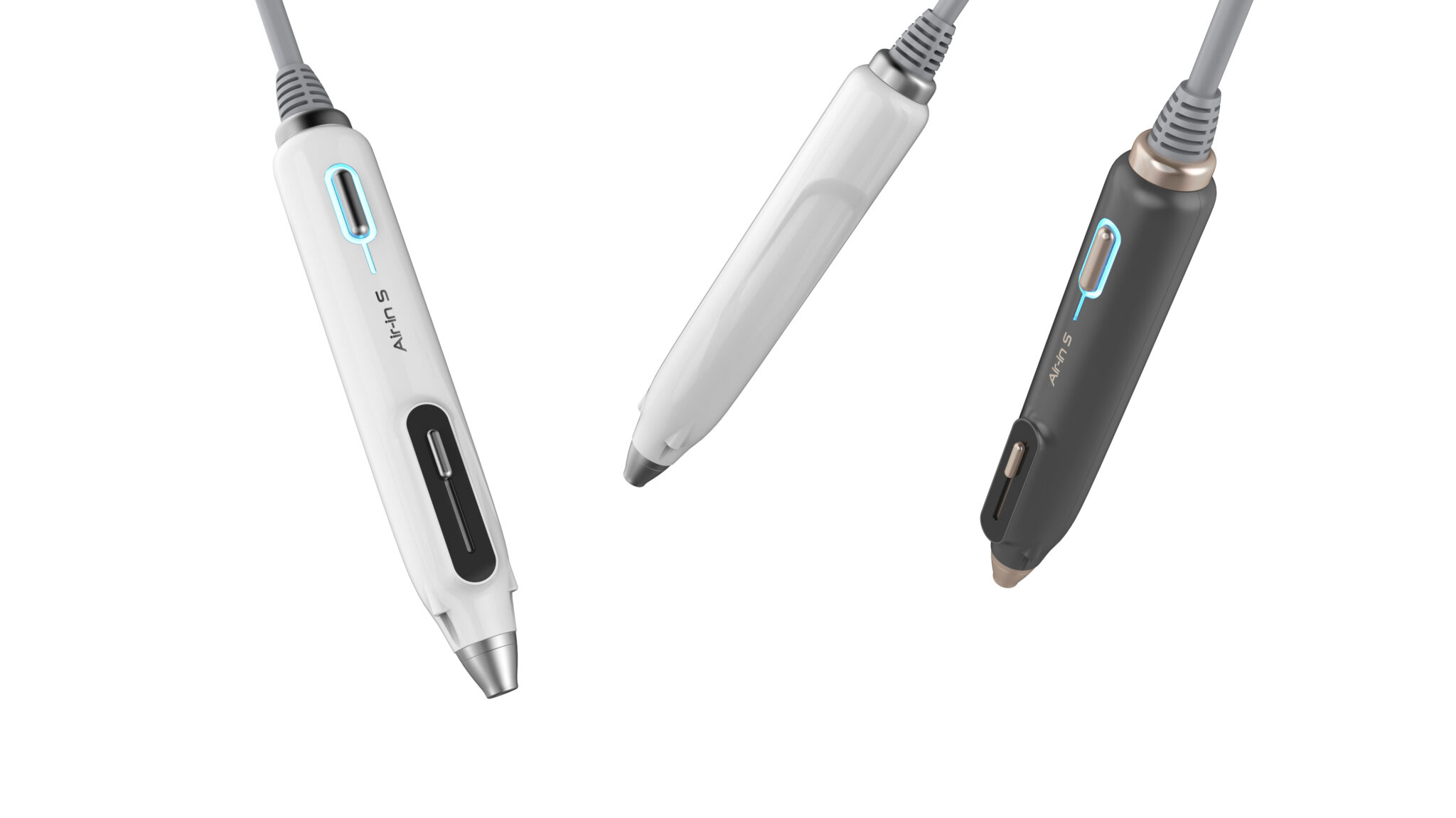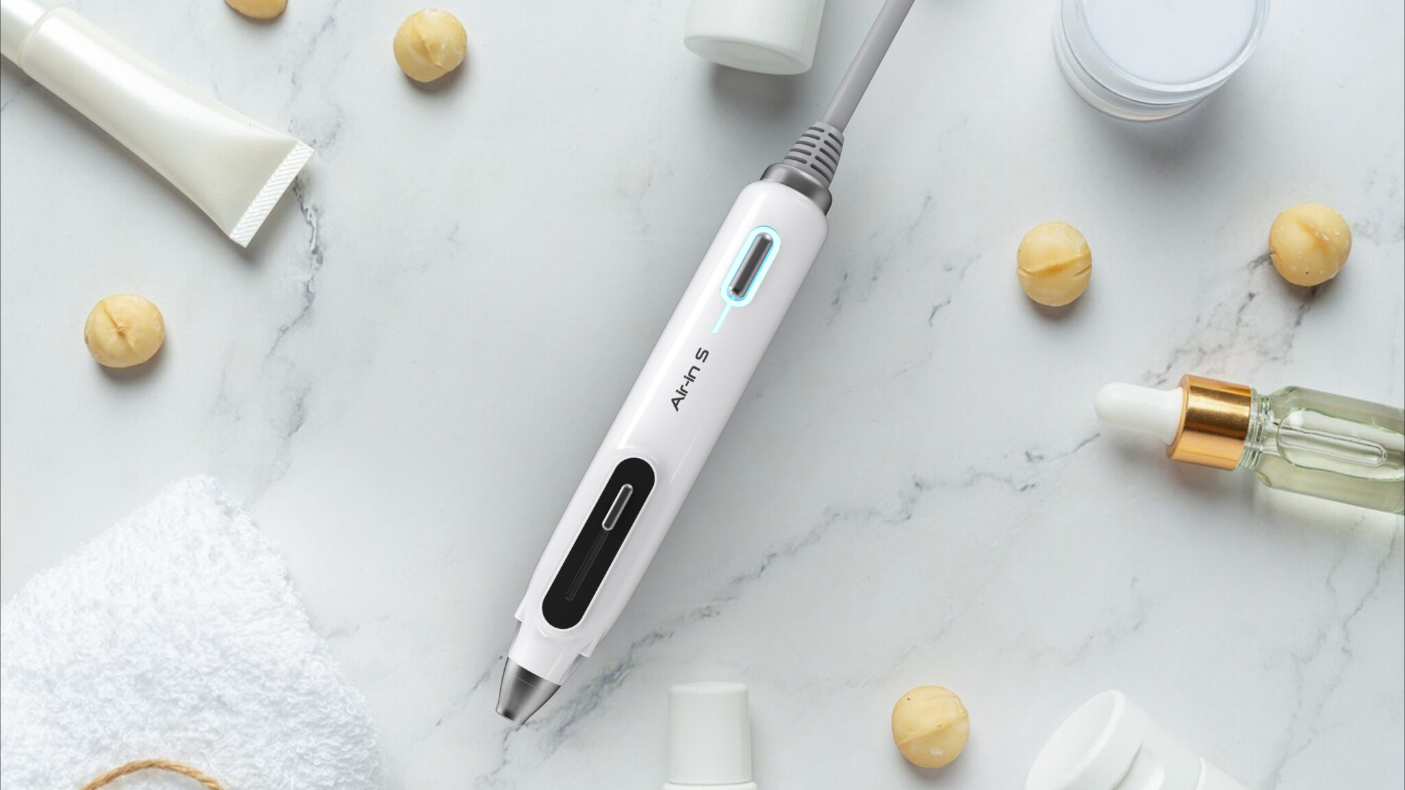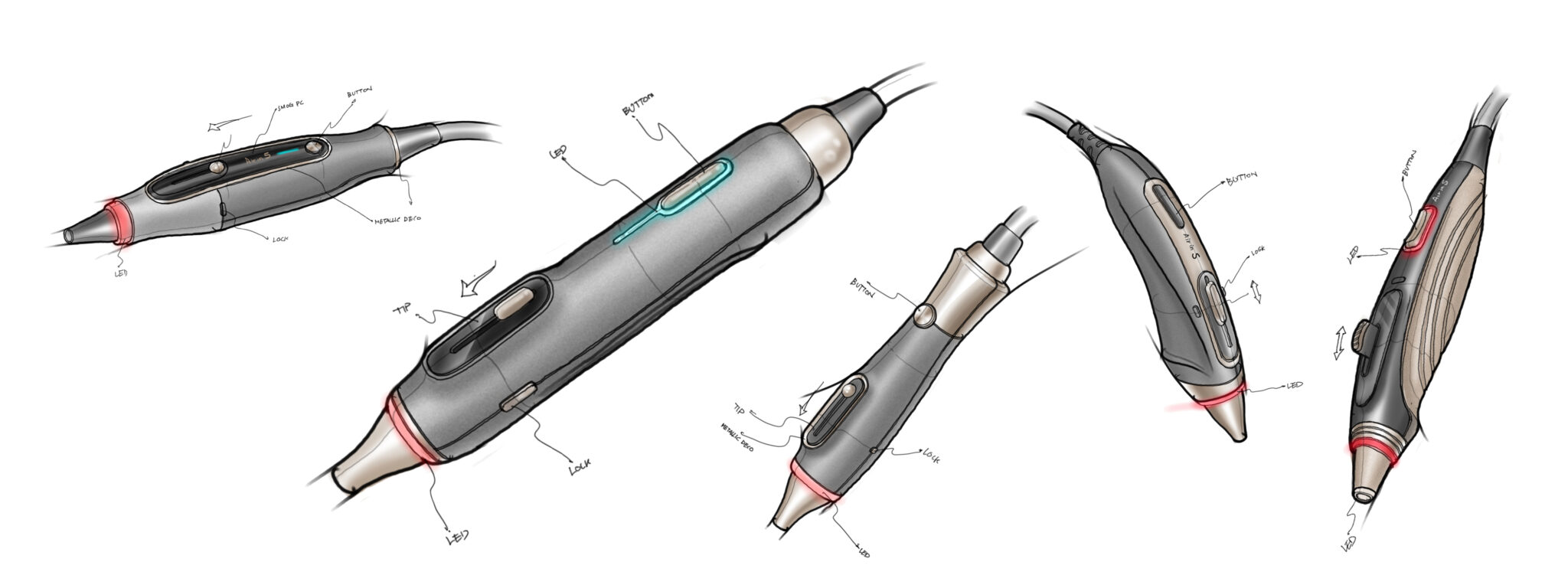 의료·피부미용 장비에 적합한 정제된 기능미(Functional Minimalism)를 기반으로, 불필요한 조형 요소를 배제하고 사용 목적에 집중한 형태 언어를 보여준다. 전체적으로 슬림한 바디와 축 방향으로 정렬된 구성은 시술 시 안정적인 그립감과 정밀한 컨트롤을 유도하며, 펜 타입과 기기형 핸드피스의 중간적 스케일을 통해 전문성과 휴대성의 균형을 형성한다.