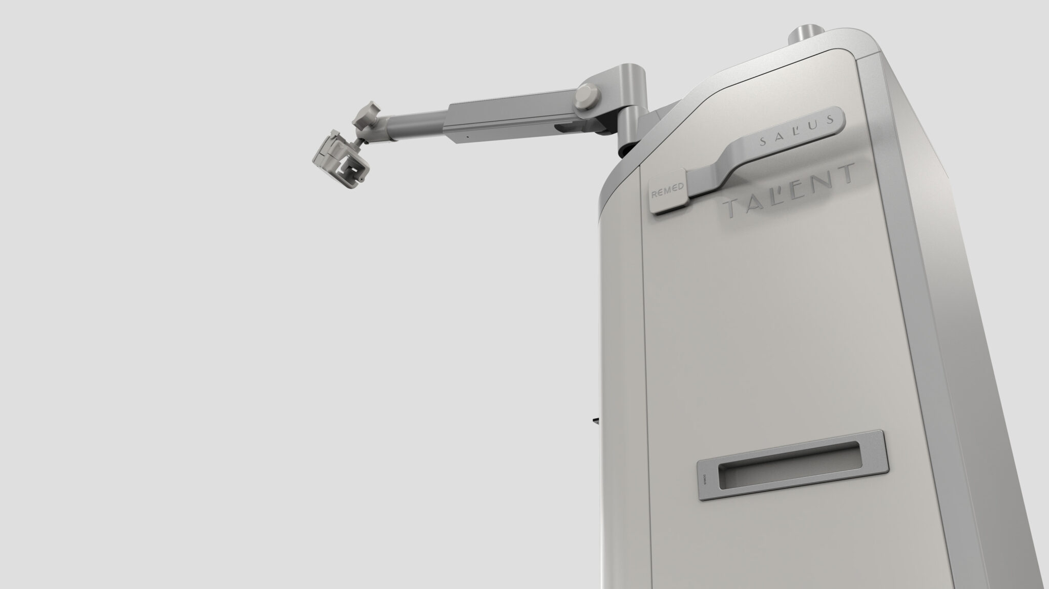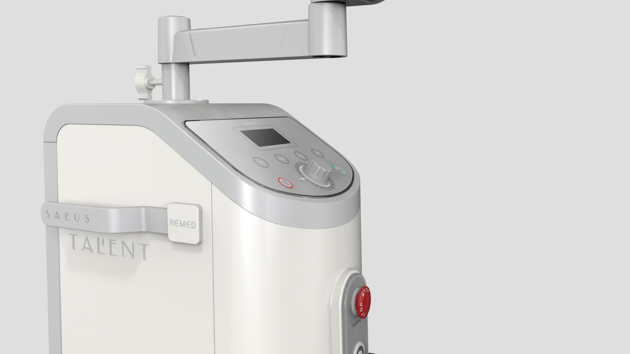 고출력 의료기기의 기술적 성능을 시각적으로 ‘안정적이고 신뢰감 있게’ 표현하는 데 초점을 두며, 세로형의 슬렌더 바디와 부드러운 코너처리를 통해 ‘강함 속의 안전함’을 전달한다. 상단 경사지 패널은 의료진의 조작 시 시인성과 접근성을 높이고, 비상 스위치와 컨트롤 버튼은 프로페셔널 퀄리티의 인터페이스 구성으로 치료 환경에 적합한 집중도 높은 조작성 경험을 제공한다.