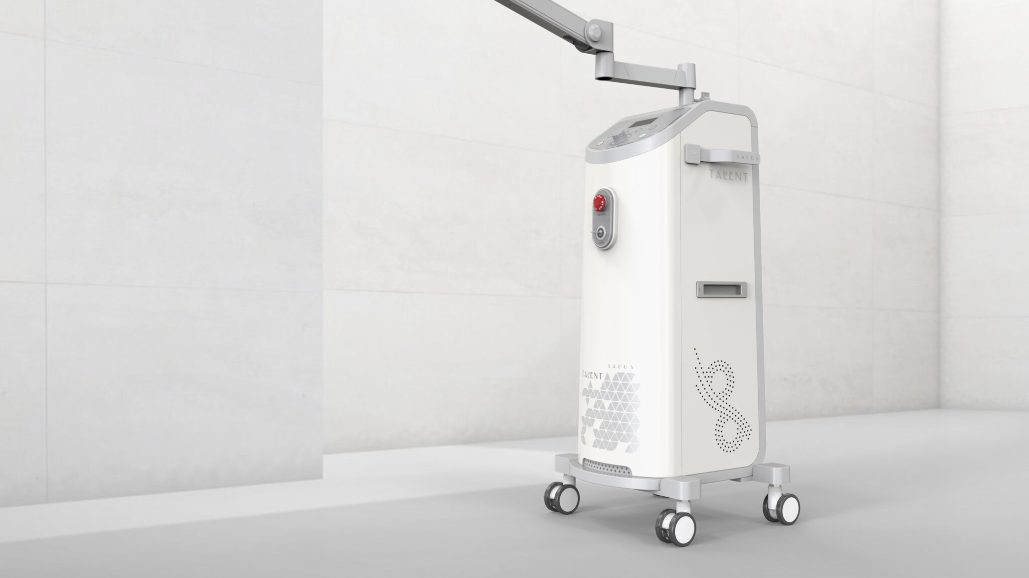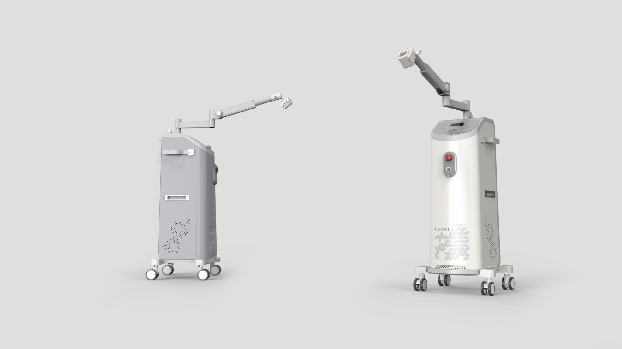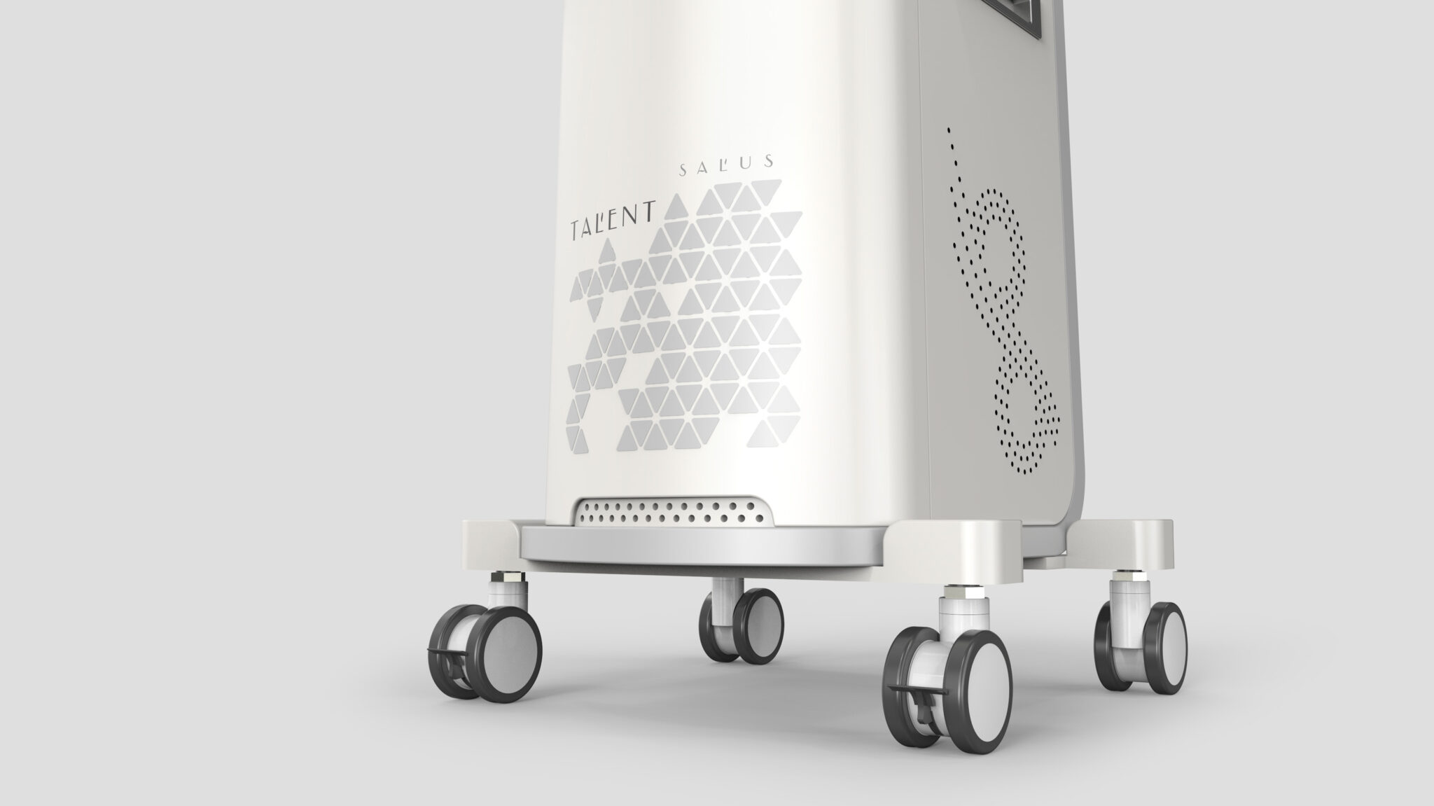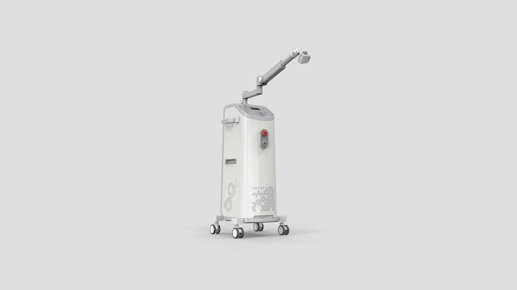 측면의 그래픽 패턴과 미세한 타공 디테일은 기술적 장비의 냉각 구조를 심미적으로 해석해 장비 특유의 기계적 긴장감을 완화하며, 브랜드 아이덴티티를 입체적으로 드러내는 역할을 한다. 본체 하단은 넓게 펼쳐지는 베이스 프레임과 대형 메디컬 캐스터를 통해 이동성과 안정성을 균형 있게 구현해 의료 현장에서의 실사용 편의성을 강화한다.