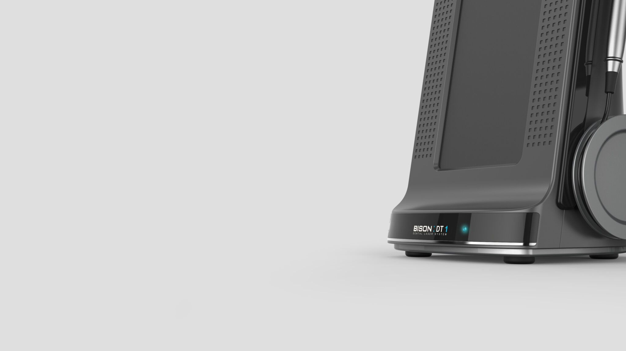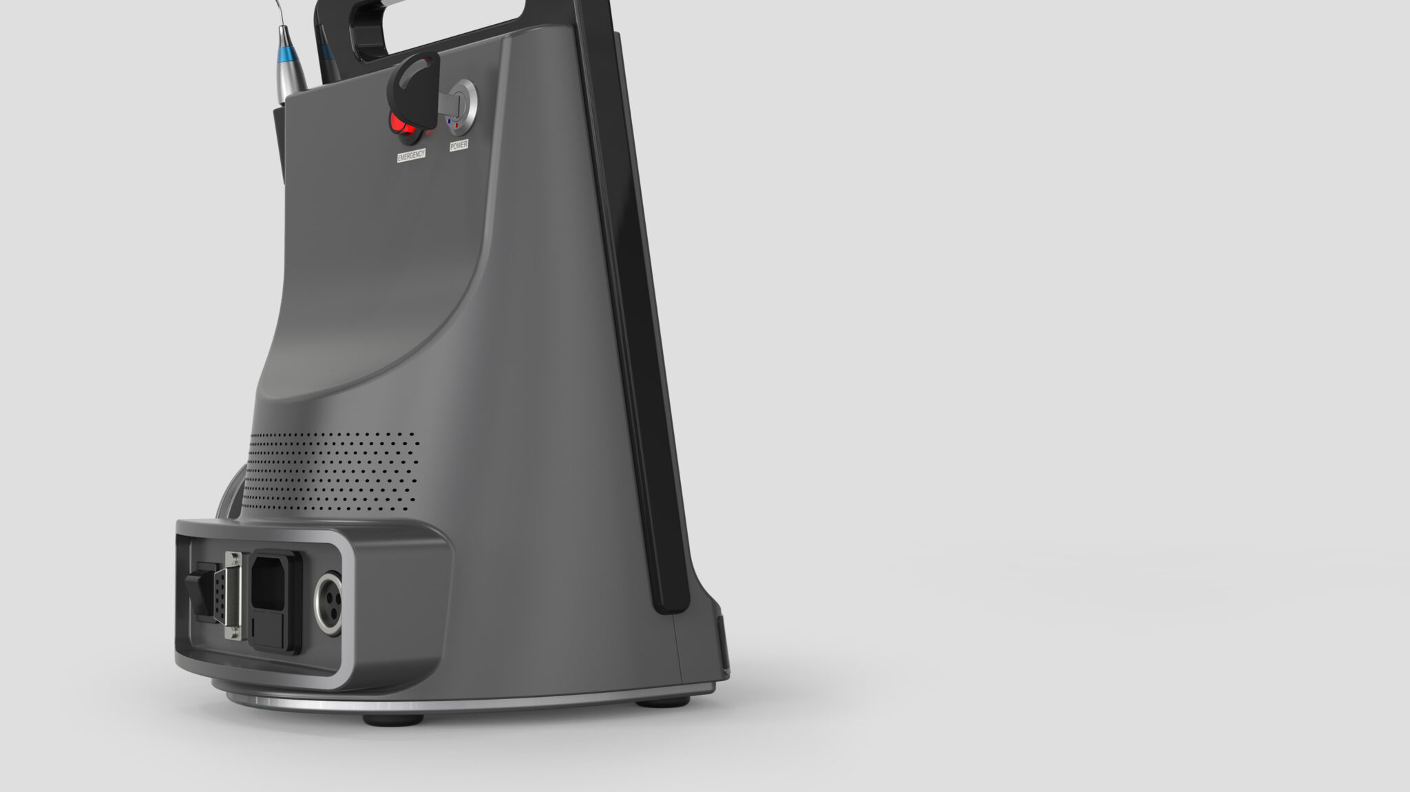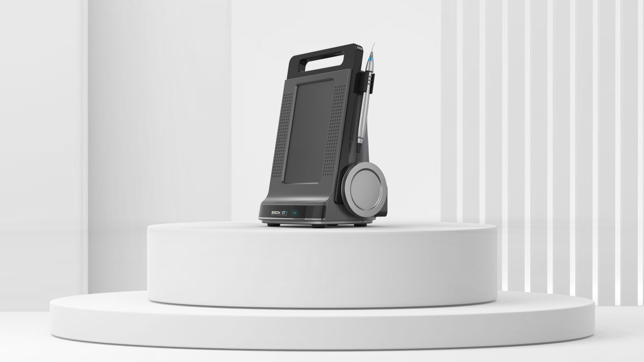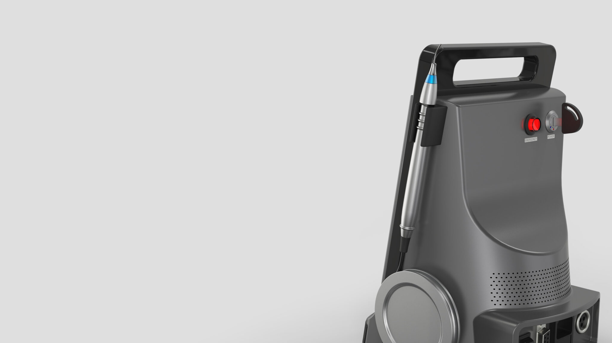 핸드피스는 본체 측면의 전용 크래들에 정렬된 형태로 수납됨으로써 치과 레이저 특유의 ‘정밀 장비’라는 아이덴티티를 유지하며, 핸드피스의 컬러 포인트(블루)는 의료기기의 청결함과 전문성을 부각시키는 시각적 요소가 된다.