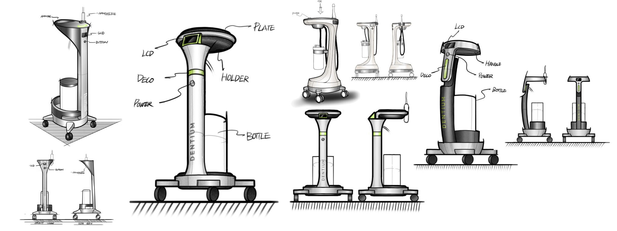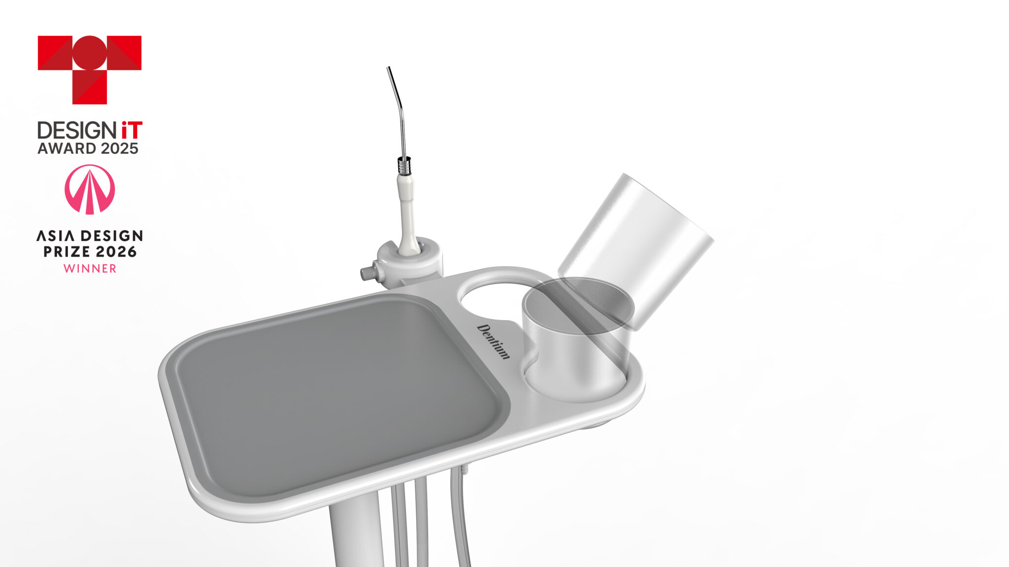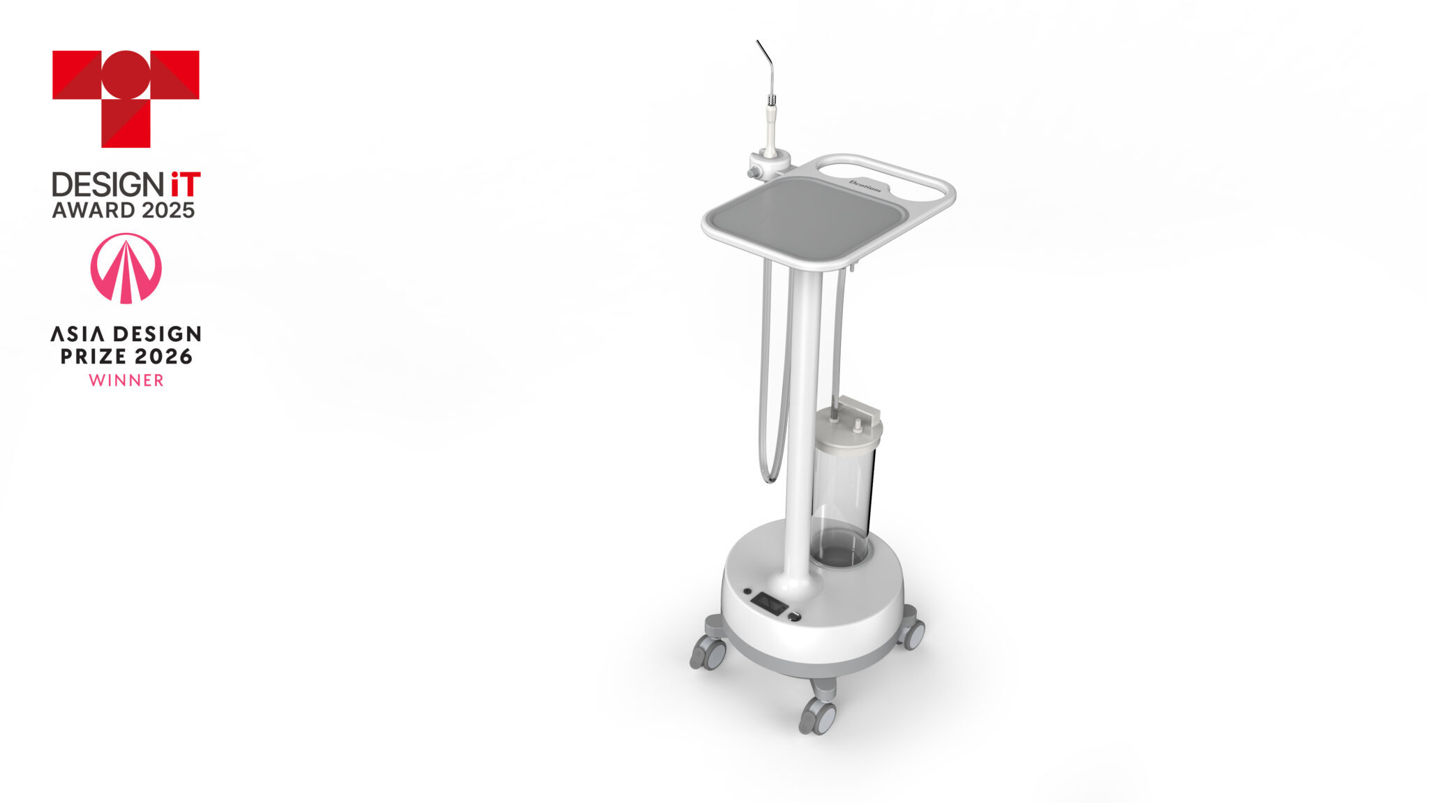 상부 트레이와 핸드피스 거치부는 사용 동선을 고려해 직관적으로 배치되어 시술 준비, 사용, 정리까지 이어지는 작업 프로세스를 효율적으로 지원하며, 투명 용기와 구조적 분리는 기능 요소를 명확히 드러내면서도 위생 관리와 유지보수의 용이성을 높인다. 하부의 라운드 베이스와 캐스터 구성은 안정적인 이동과 충돌 완화 역할을 수행하며, 전체적으로 부드러운 곡면 언어를 적용해 장비의 물리적 존재감을 완화하고 환자 환경에 친화적인 인상을 형성한다.