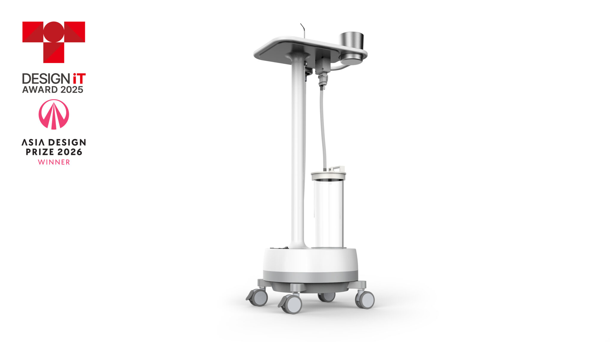 료 환경에서의 이동성과 공간 효율을 중심으로 한 모듈형 클리니컬 워크스테이션(Clinical Workstation) 개념을 기반으로 한다. 전체 구조는 원형 베이스와 수직 기둥, 그리고 상부 트레이로 이어지는 단순한 수직 구성으로 시각적 복잡성을 최소화하면서도 안정적인 하중 지지와 이동 편의성을 동시에 확보하였다. 불필요한 장식을 배제한 절제된 실루엣은 의료 환경에서 요구되는 청결성과 신뢰감을 강조하며, 장비가 아닌 ‘진료 흐름의 일부’로 자연스럽게 기능하도록 설계된 것이 특징이다.