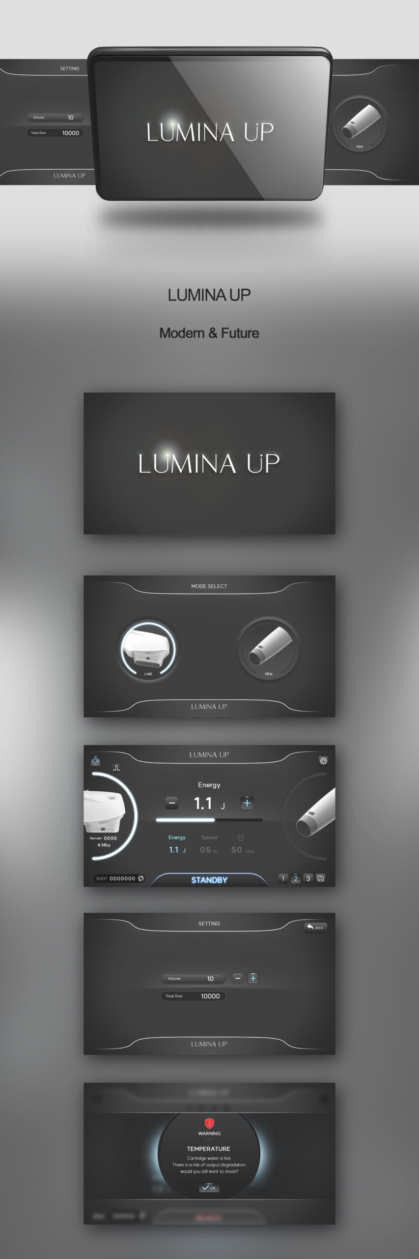 이 완성도 높게 결합된 UI로, 프리미엄 HIFU 디바이스의 브랜드 아이덴티티를 완성하는 인터페이스라 할 수 있다.