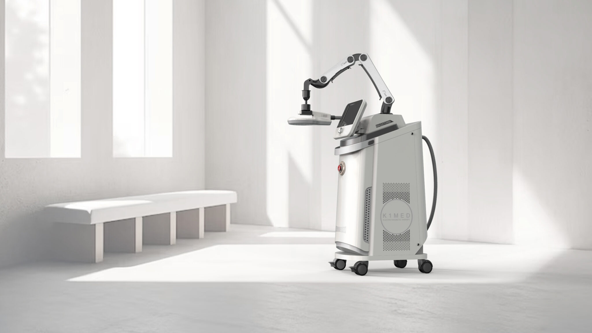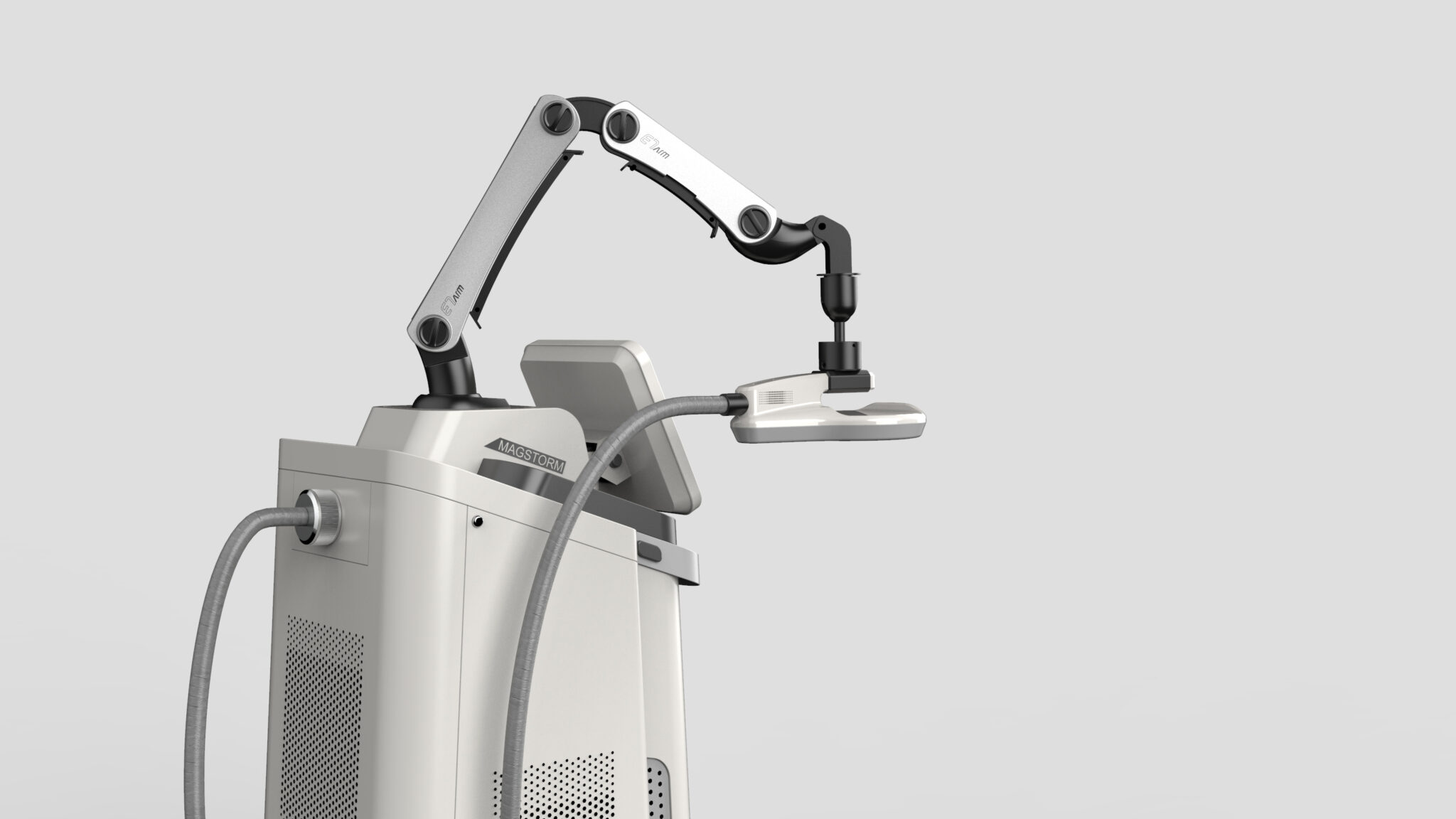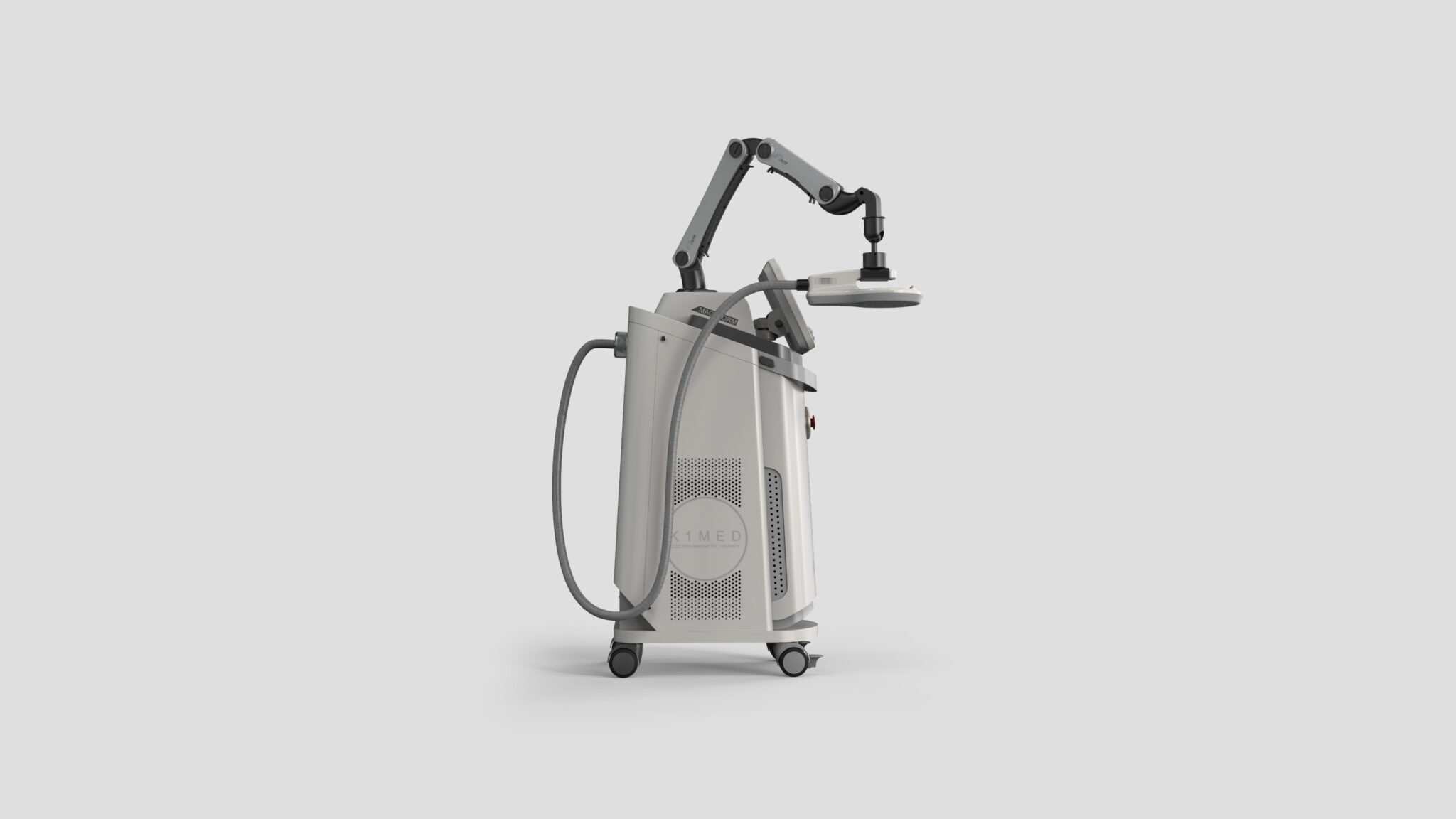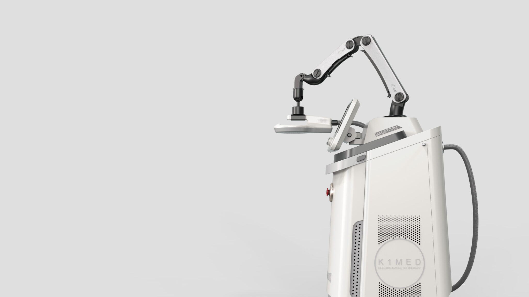 가장 큰 특징인 다관절 팔 메커니즘은 고정성과 유연성을 균형 있게 담아내며, 정교한 치료 포지셔닝을 직관적으로 유도한다. 메탈릭 소재 대비와 구조적 라인의 강조는 이 장비가 가진 정밀 공학 기반의 신뢰성과 높은 기술력을 사용자에게 명확히 전달한다.