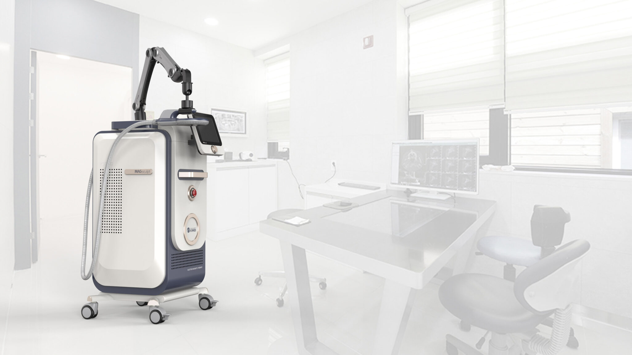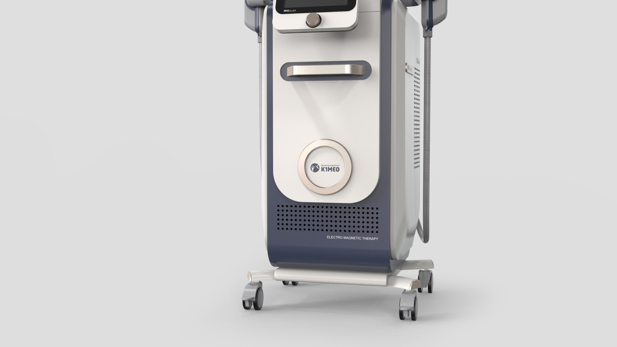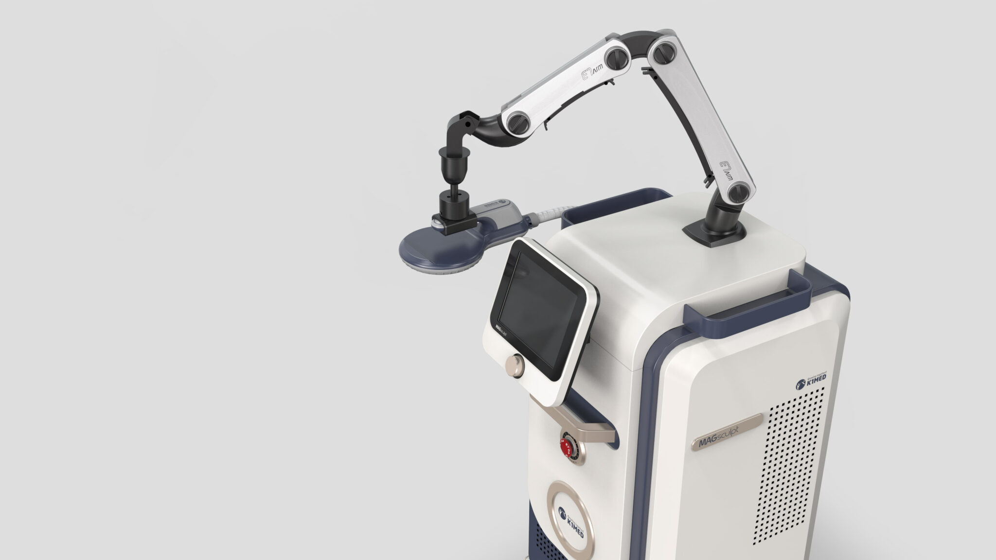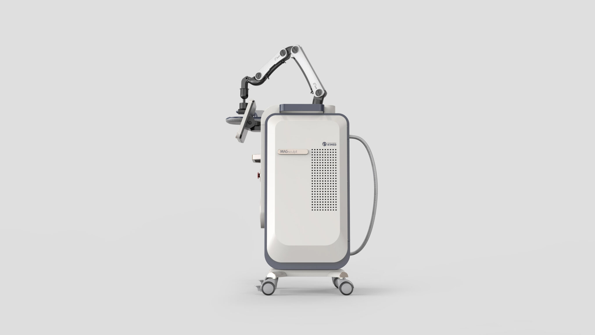 전체적인 볼륨은 라운드 모서리와 완만한 곡면을 기반으로 구성되어, 고출력 전자기 장비임에도 부담스럽지 않고 환자에게 친근하며 안정적인 인상을 제공한다. 화이트·네이비·메탈 포인트의 컬러 블로킹은 장비의 기능 구역을 시각적으로 구분하면서도, 전문성을 강조한 프리미엄 의료 톤을 형성한다.상단의 정밀 관절 암 구조는 기술적 퍼포먼스를 시각적으로 강조하는 핵심 요소다. 사용자의 세밀한 각도 조절, 다양한 체형·부위 대응 등 실제 사용성 측면을 공학적으로 해결하는 동시에, 장비 전체의 하이테크 아이덴티티를 강화한다.측면의 환기 패턴과 전면부의 기능 레이아웃은 기능적 필요 + 조형적 완성도를 동시에 만족시키며, 장비가 가진 기술의 신뢰성을 자연스럽게 전달한다. 또한 디스플레이는 의료진의 시야·동선을 고려한 최적의 각도로 설계되어, 직관적 조작과 빠른 시술 프로세스를 지원한다.하단 플랫폼과 캐스터는 이동성과 안정성을 동시에 고려한 구조를 통해, 장비가 여러 치료실을 오가며 사용되더라도 흔들림 없이 신뢰감을 주는 안정된 존재감을 유지한다.
