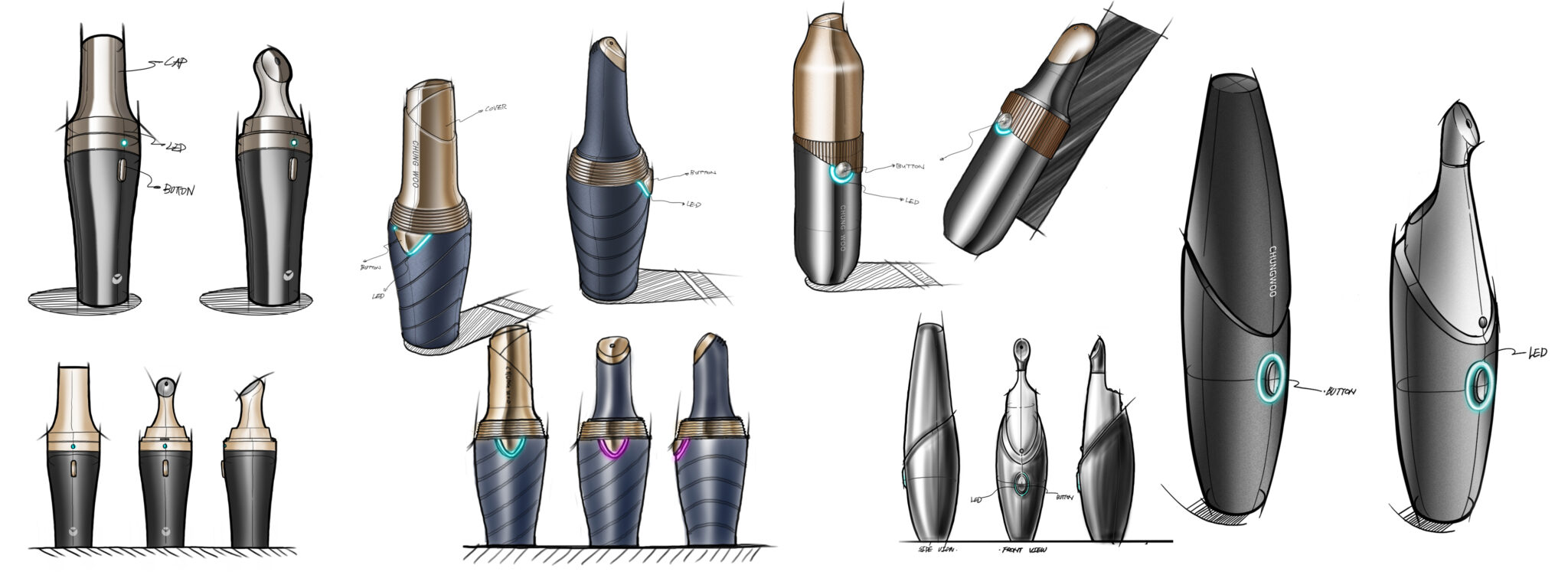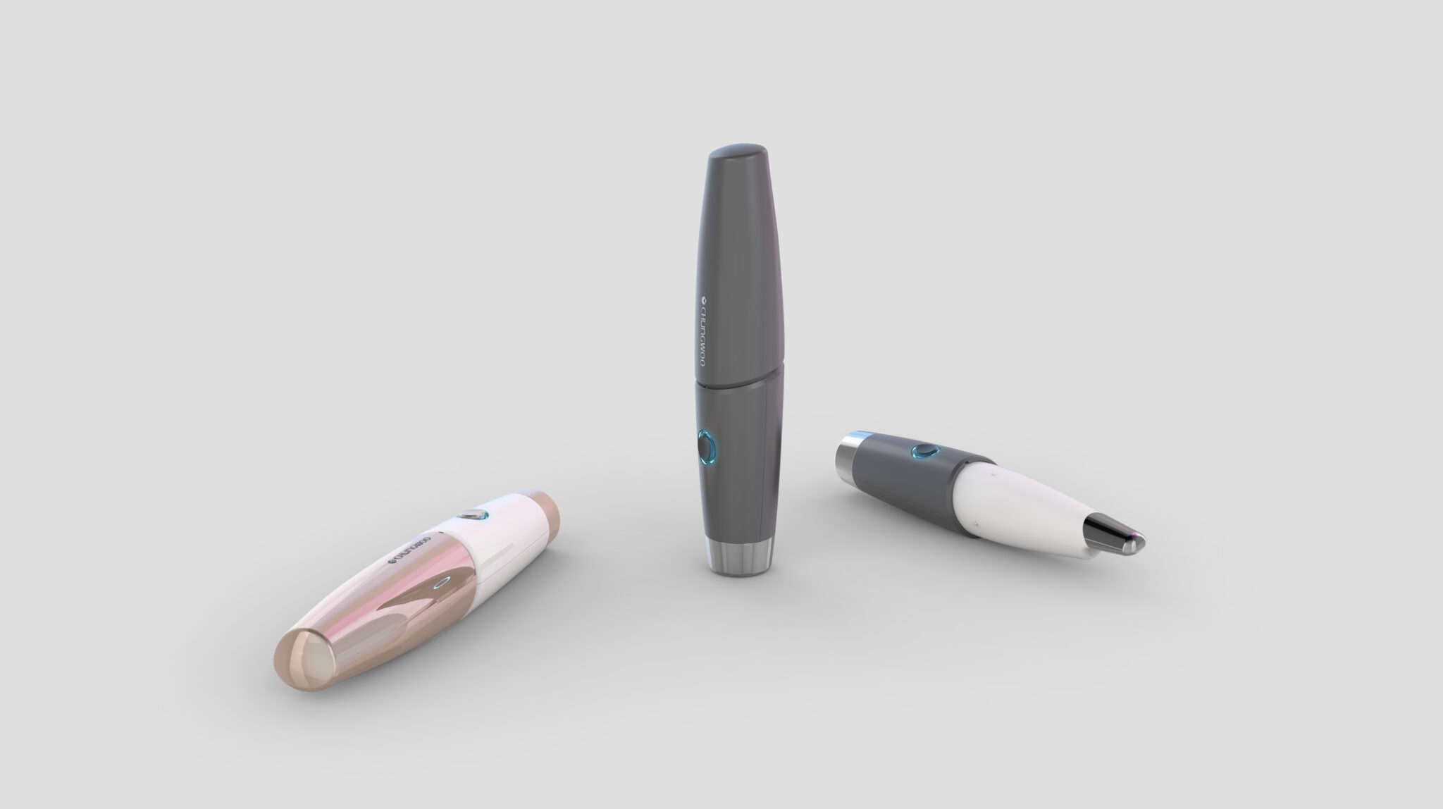 본 이미지는 에스테틱·홈뷰티용 핸드피스 디바이스를 다각도로 제시한 디자인으로, 하나의 제품이 컬러·마감·구성 변화를 통해 다양한 시장과 사용자 니즈에 대응할 수 있음을 보여준다. 전체 디자인의 핵심은 ‘기계적 기능성’을 전면에 드러내기보다, 뷰티 디바이스로서의 친화성과 전문성의 균형에 있다.