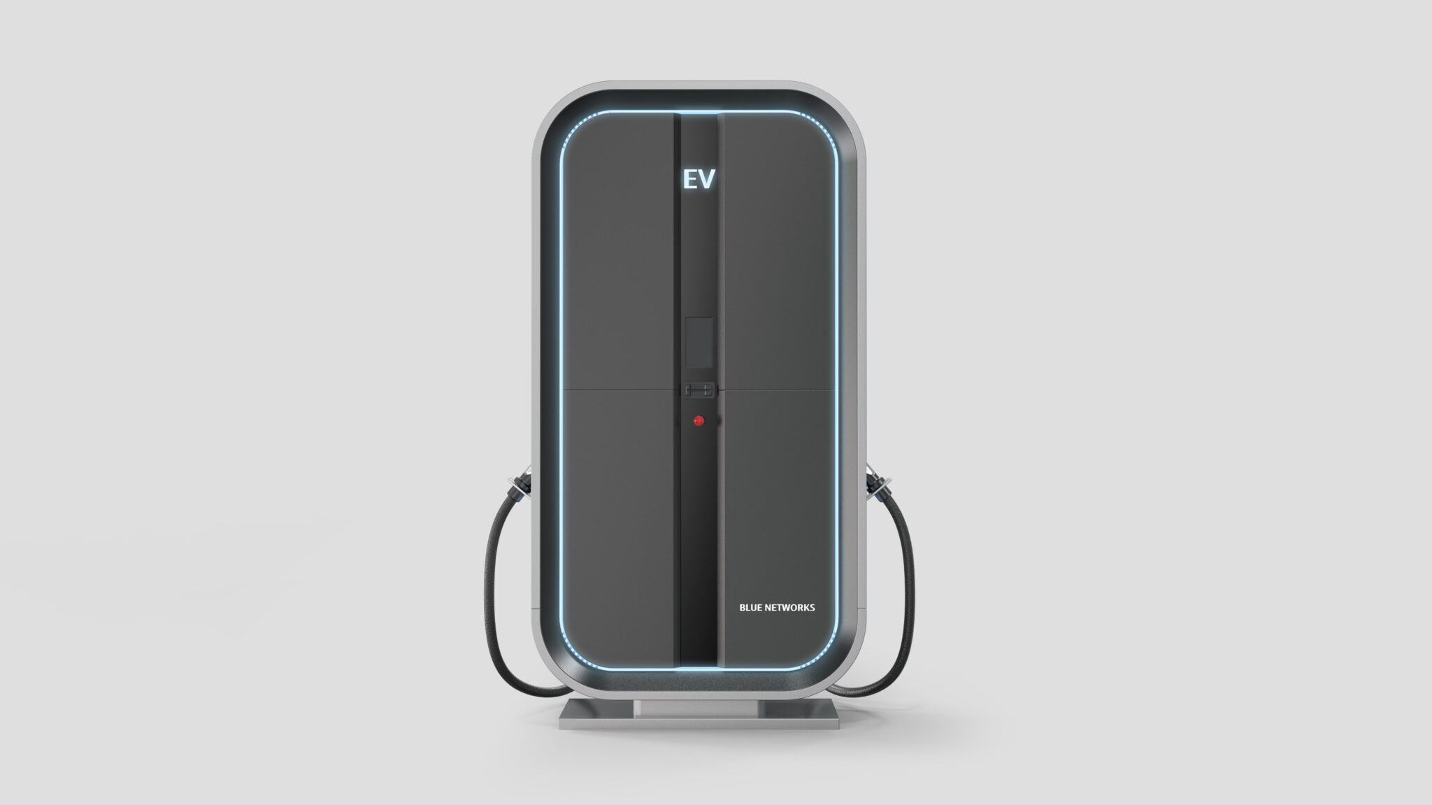본체는 슬림하지만 안정적인 하단 베이스 위에 올려져 있어 설치 환경에 따라 다양한 지면에서도 높은 안정성을 유지한다. 차분한 다크 그레이와 클린 화이트의 조합은 미래 에너지 브랜드로서의 전문성과 프리미엄 가치를 강화하며, 블루 라이팅은 지속가능한 에너지의 상징성을 표현한다.
