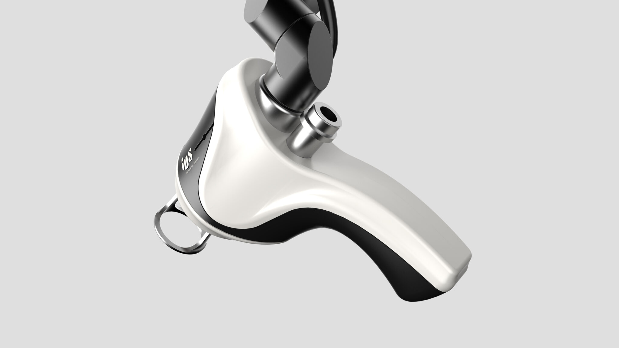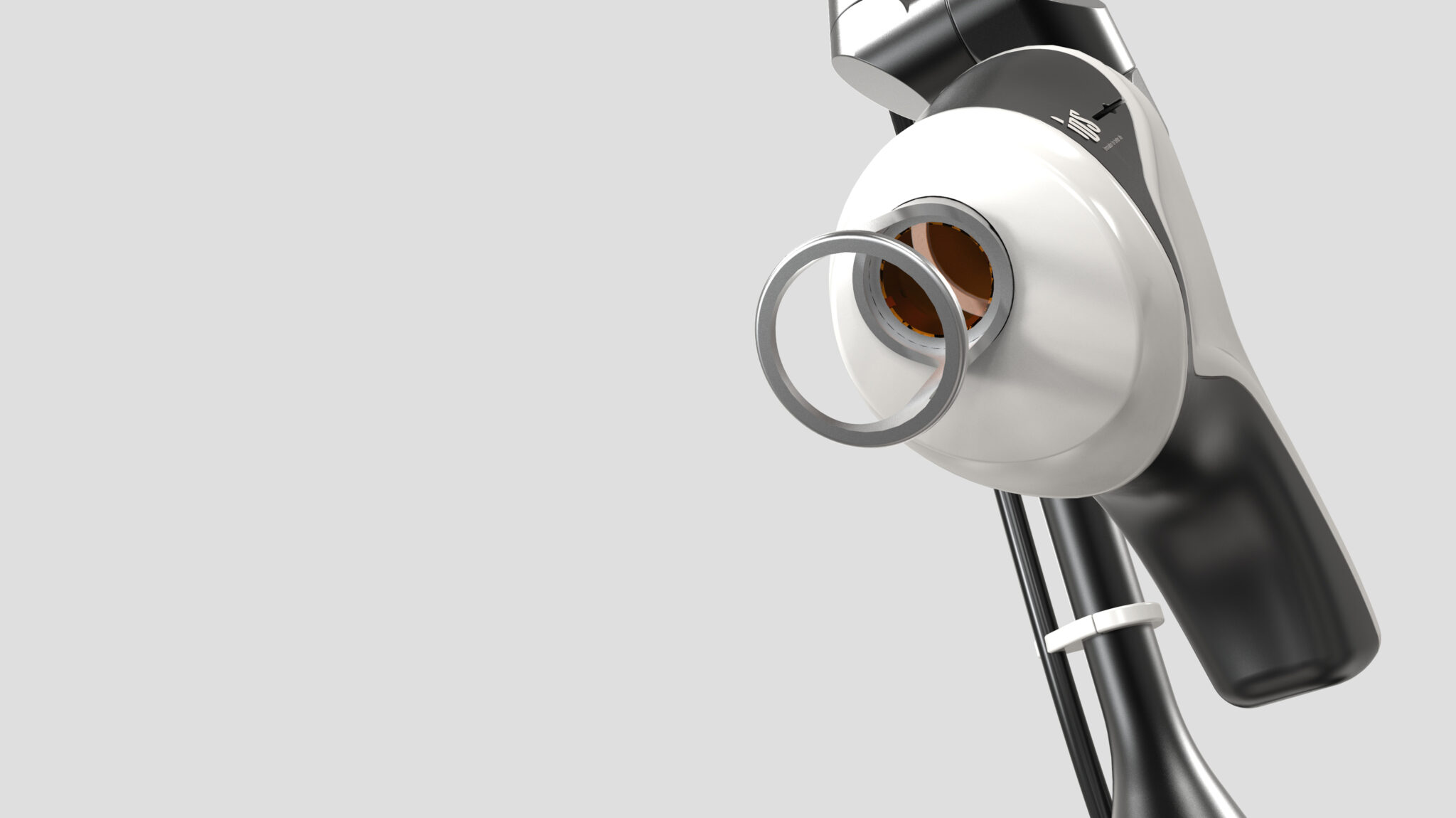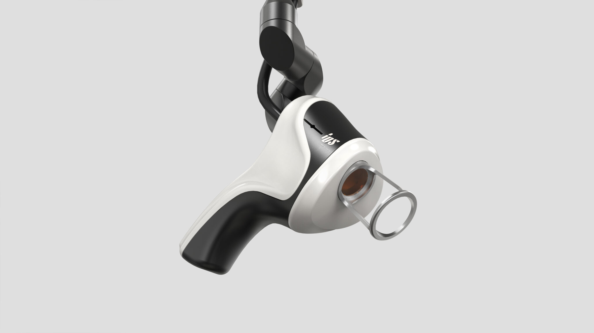 전반적으로 장비는 부드러운 플로우 라인과 단단한 커팅 엣지 요소를 조합해 고급스러우면서도 기술 집약적인 미니멀 테크 스타일을 구축하고 있으며, 팔 조인트와의 연결부는 시술 중 안정적인 무게 분산과 조작 편의성을 제공하도록 설계된 구조이다.