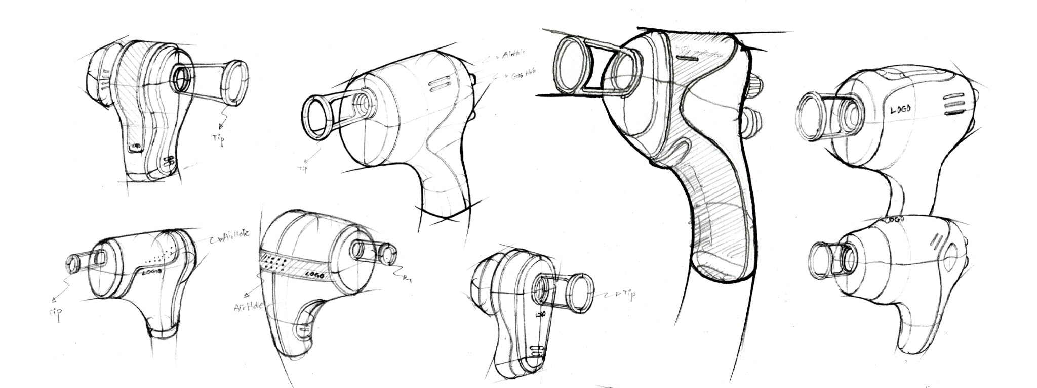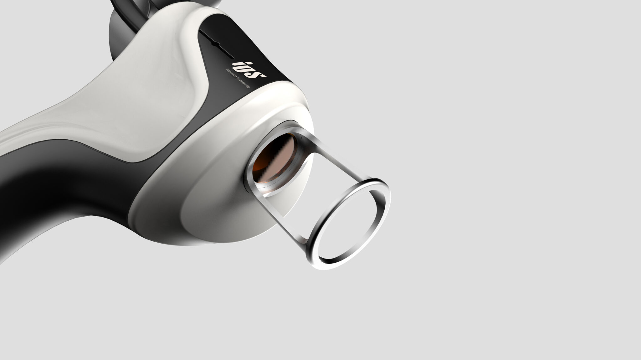 이 디자인은 의료·미용 시술 환경에서 요구되는 안정성, 정확도, 직관적 사용성을 중심에 두고 구성된 형태다. 곡면 중심의 바디 실루엣은 손의 자연스러운 그립을 유도하며, 블랙 & 화이트의 투톤 구조는 기능 구역을 시각적으로 분리하여 사용자가 즉각적으로 방향성과 조작 포인트를 인지할 수 있게 한다. 금속 재질의 원형 가이드 링은 레이저 혹은 에너지 조사 위치를 정밀하게 안내하는 기능적 요소이자, 정교한 의료장비의 이미지를 강화하는 아이덴티티 역할을 한다.