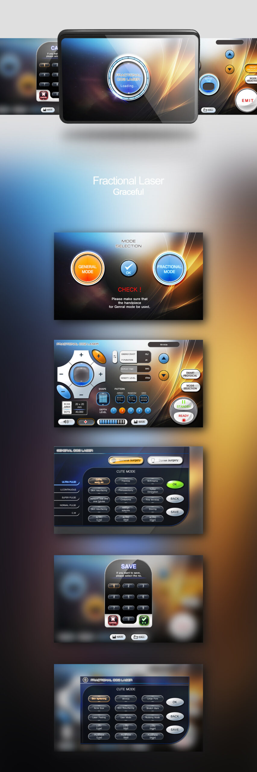 우아한 곡선형의 빛 결 흐름(Gradient Light Flow)을 기반으로 전체 화면에 자연스러운 시각적 리듬감을 부여하며, 레이저 기술 특유의 ‘에너지·속도·정확성’을 감성적으로 표현한다. 배경의 워밍 톤(오렌지 골드 영역)과 쿨 톤(블루 광원)의 Dual-Tone 대비는 “일반 모드(General)”와 “프랙셔널 모드(Fractional)”의 기능적 차이를 직관적으로 구분시키는 동시에, 의료기기 UI에서 중요한 정보 인지성을 강화한다.