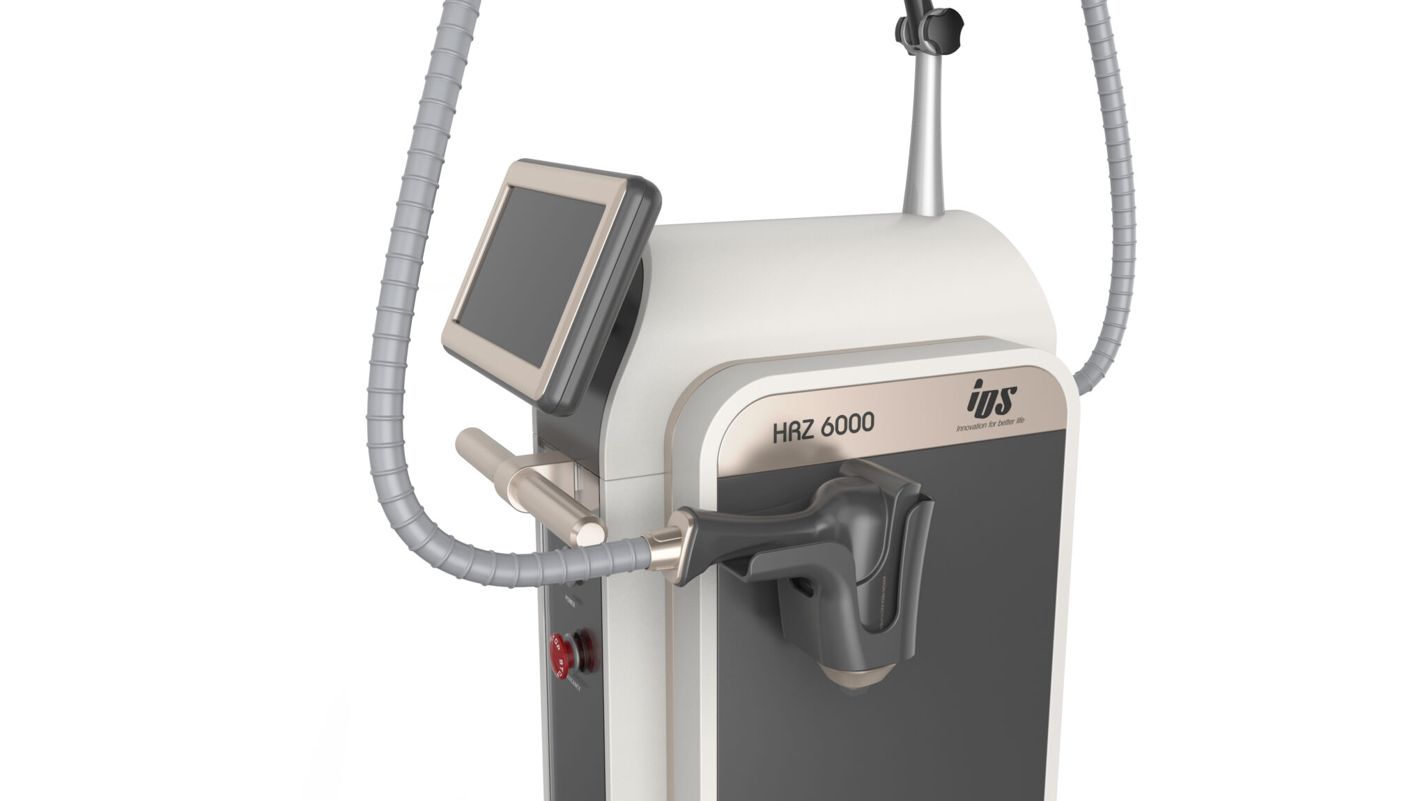 전면 상단에 배치된 틸트형 디스플레이는 시술 중 자연스러운 시야각을 제공하며, 조작 영역을 신체 동선에 맞게 최적화하였다. 중앙의 세로형 블랙 패널은 기능적 컨트롤 존을 명확히 구분하면서도, 제품의 아이덴티티를 강조하는 시각적 포인트 역할을 수행한다.