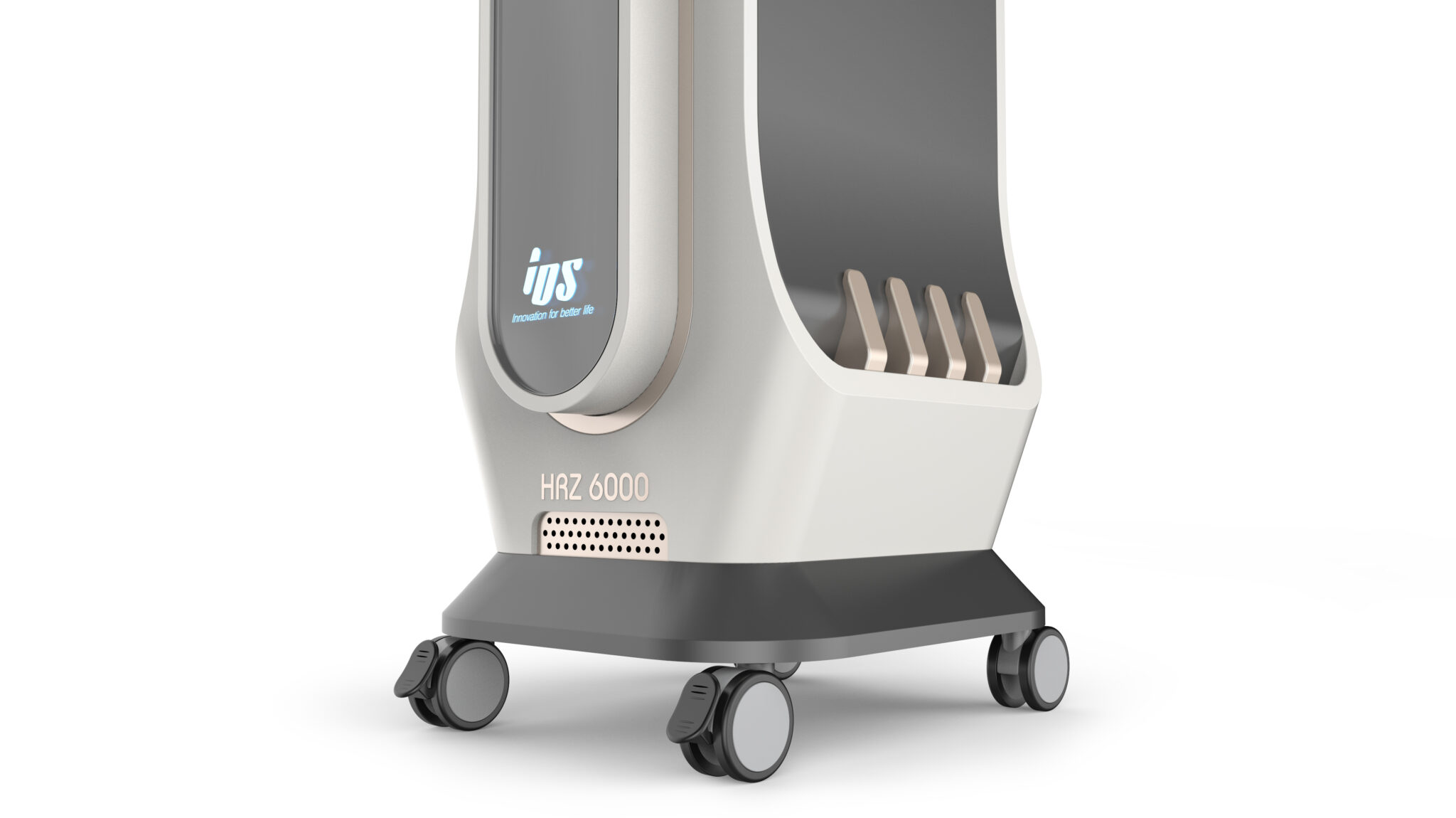 부드럽게 라운딩된 사각 기둥 형태는 차가운 의료기기의 이미지를 완화하며, Soft Edge 처리를 통해 사용자와의 심리적 거리를 줄인다. 상·중·하부가 명확히 분절된 구조이지만, 곡면의 연속성을 통해 하나의 흐름 있는 오브제로 인식되도록 설계되었다.
