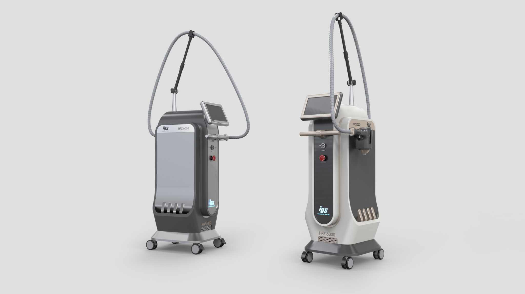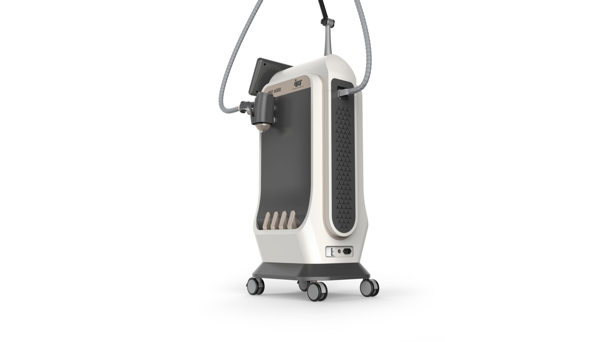 케이블과 핸드피스 라인은 상단 아치형 구조를 통해 정돈되며, 이는 단순한 거치 기능을 넘어 시술 동선의 흐름을 시각적으로 표현하는 조형 요소로 작동한다. 불필요한 노출을 최소화한 설계는 위생성과 유지관리 측면에서도 의료 환경에 적합하다.