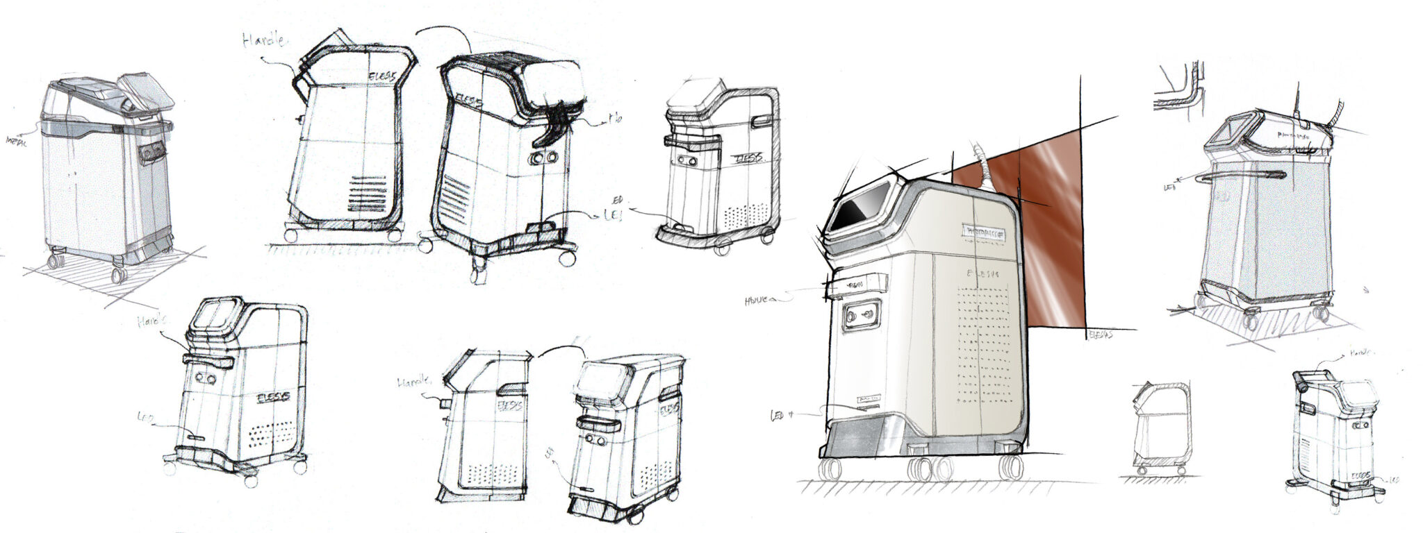 장비 전체는 화이트·샌드·라이트 메탈 톤의 조합으로 구성되어, 의료기기 특유의 전문성은 유지하되 차갑지 않은 트러스트 컬러 팔레트를 통해 환자·시술자 모두에게 긍정적 경험을 제공한다.