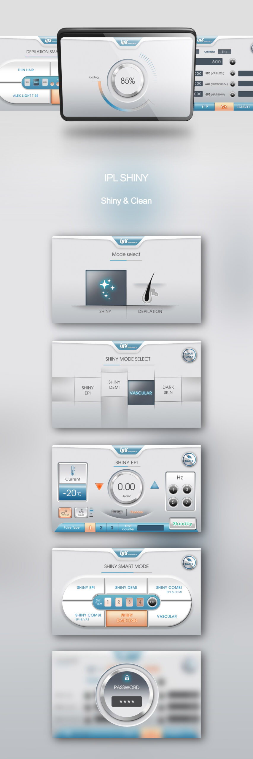 모드 선택 화면은 단순한 사각 버튼 대신 광원 아이콘, 헤어 제거 아이콘 등 직관적 픽토그램을 활용해 시술자가 빠르게 목적 모드를 판단·선택할 수 있도록 돕는다. 또한 SHINY / DEPI / VASCULAR 등 다양한 모드를 톤 차이와 미묘한 깊이감으로 구분하여 의료환경에서 요구되는 명확한 정보 계층 구조를 구현했다.