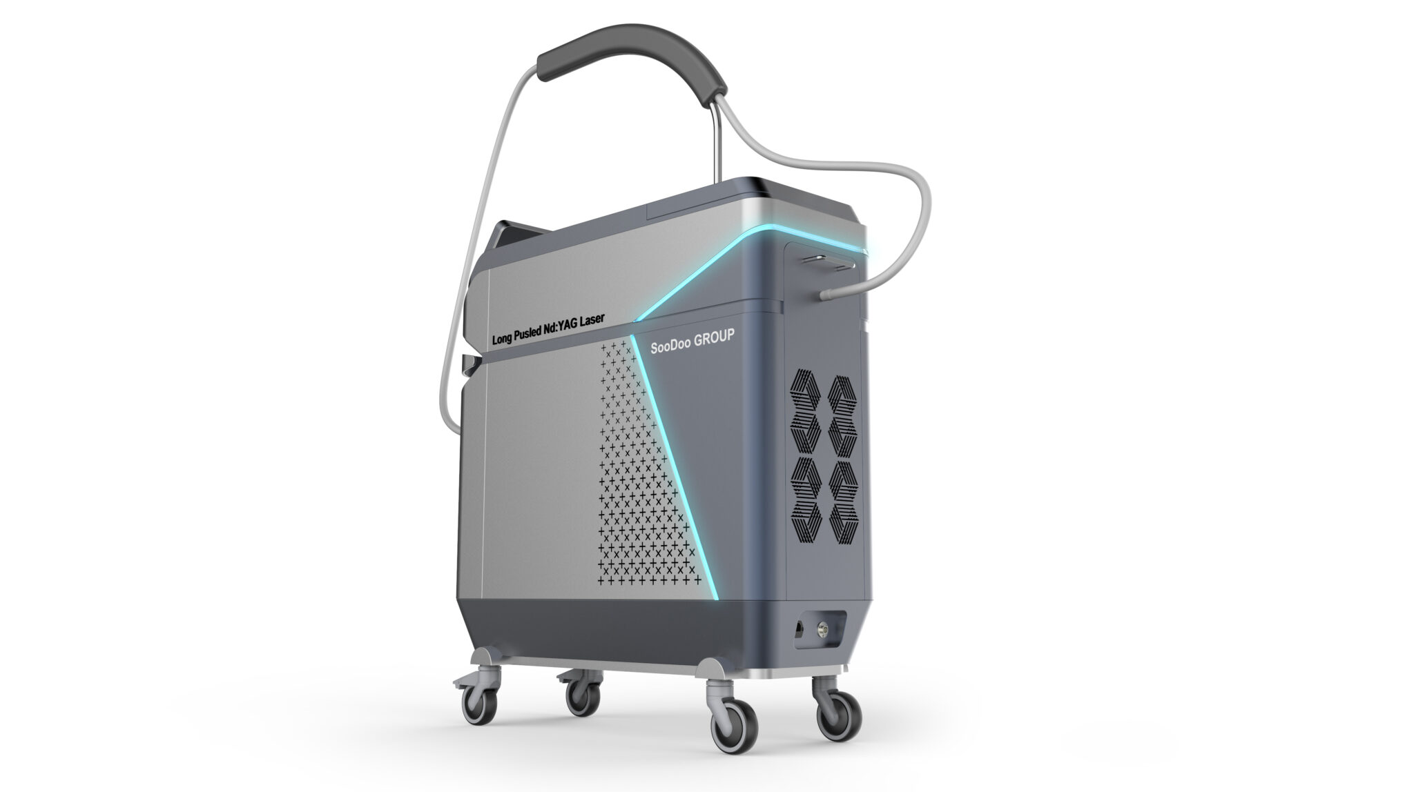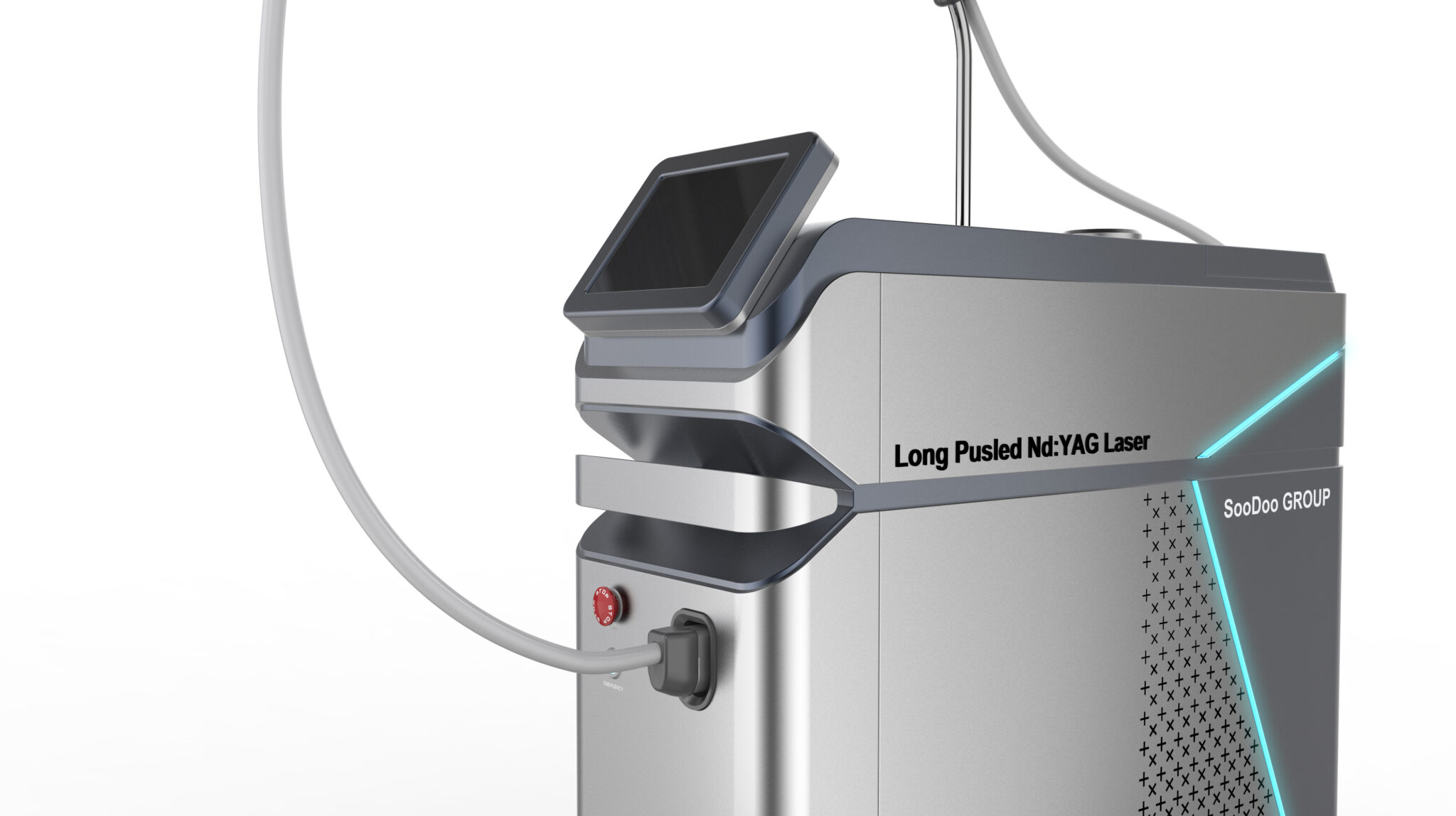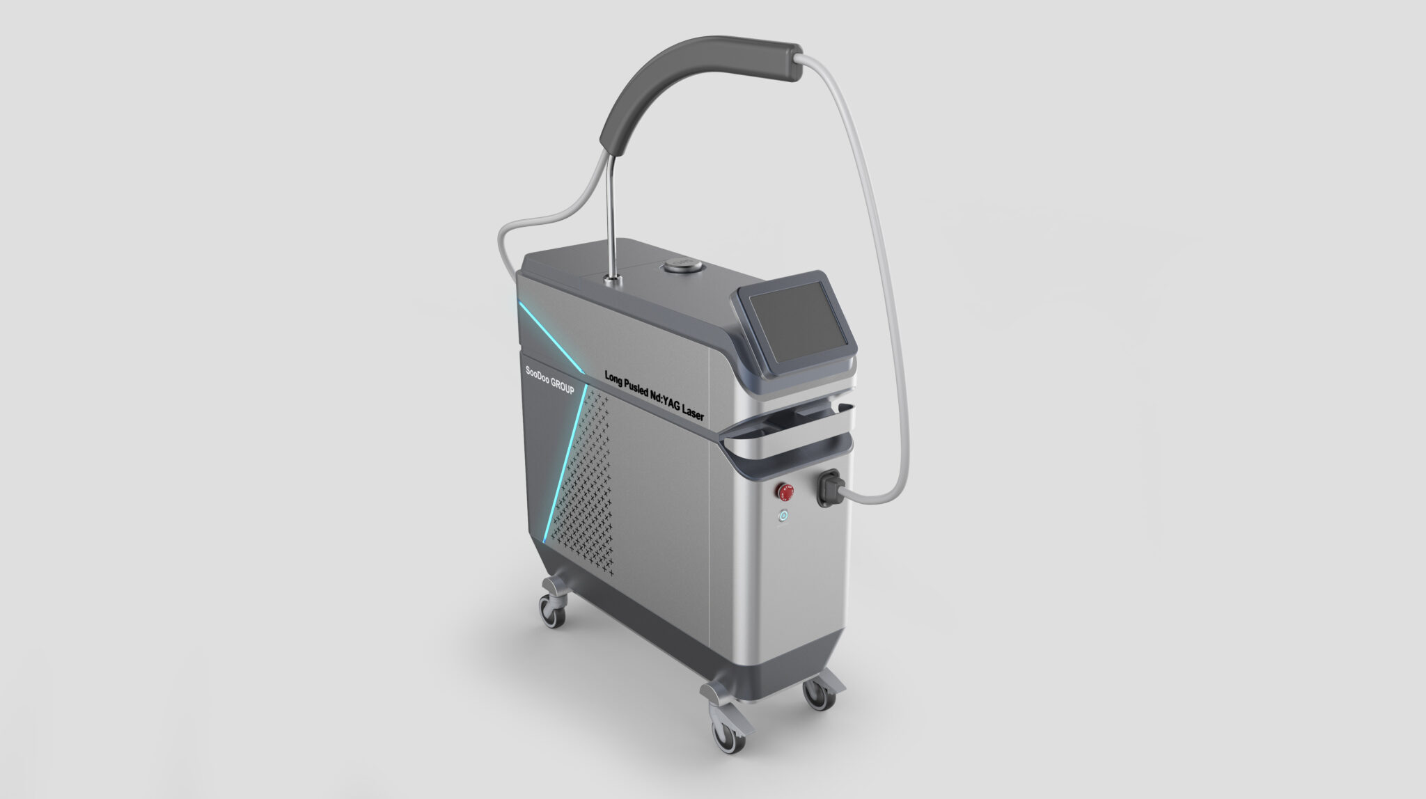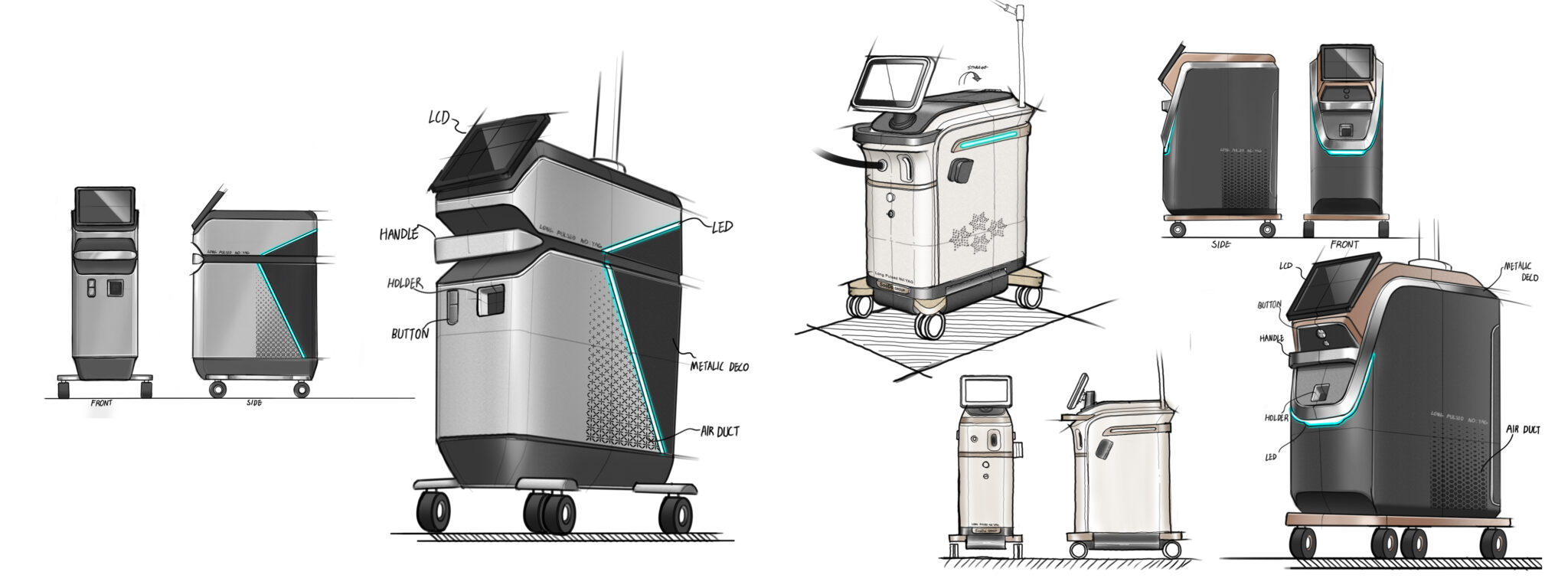 이 디자인은 Long Pulsed Nd:YAG 레이저 장비가 요구하는 ‘의학적 신뢰성·출력 안정성·현장 활용성’을 가장 직관적인 형태 언어로 구현한 메디컬 워크스테이션을 지향한다. 전체 실루엣은 불필요한 조형적 과장을 배제한 컴팩트한 큐브형 볼륨을 기반으로 하여, 고출력 레이저 장비에 요구되는 안정감과 장비 중심성을 명확하게 전달한다.