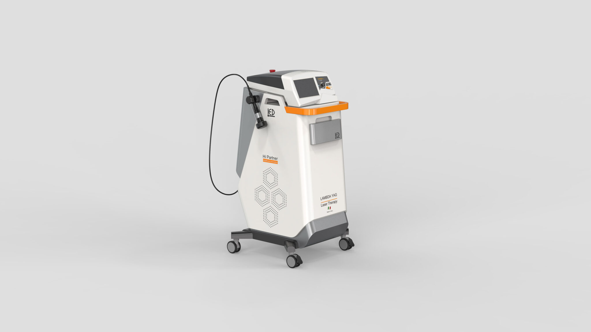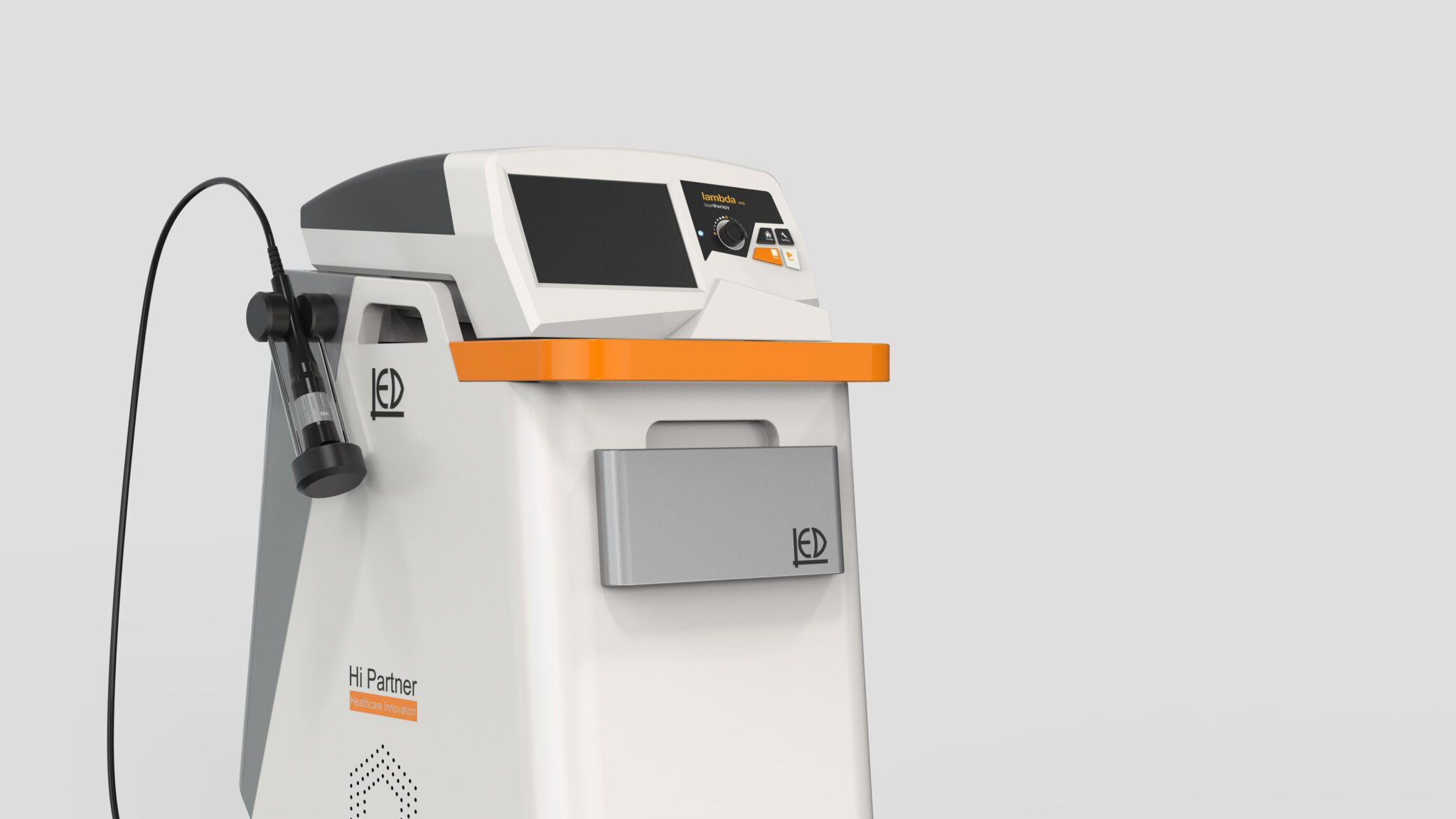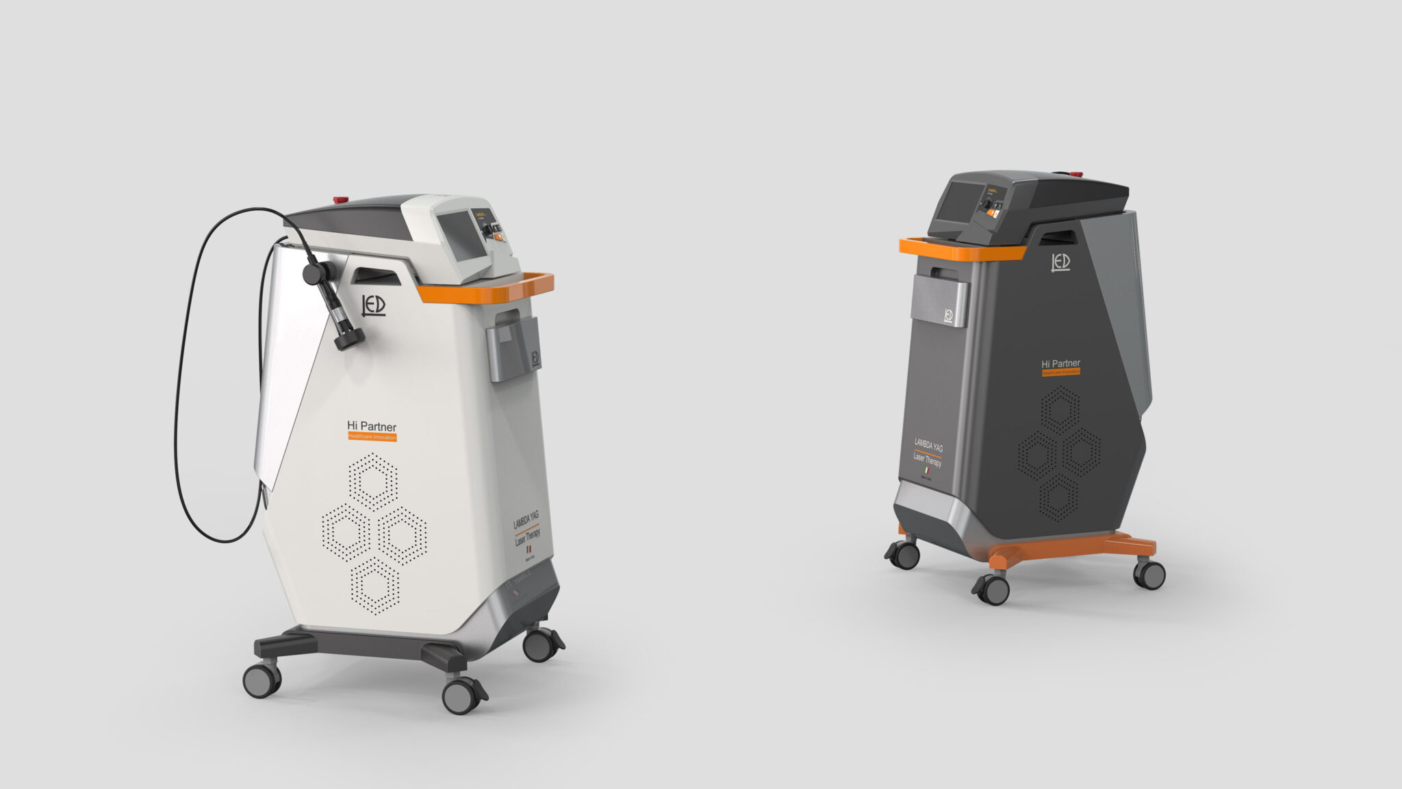 전면 상부의 작업 패널은 사용자의 시선과 손의 리치 포인트를 고려한 경사 배치를 통해 빠른 조작성과 명확한 정보 전달을 보장한다. 오렌지 컬러의 하이라이트 라인은 응급·주의 요소를 자연스럽게 강조하며, 의료기기의 기능적 UI와 조형을 시각적으로 연결해주는 역할을 한다. 이 액센트 색상은 브랜드의 상징성과 ‘하이 퍼포먼스 레이저’ 이미지를 강화하는 핵심 요소로 작동한다.