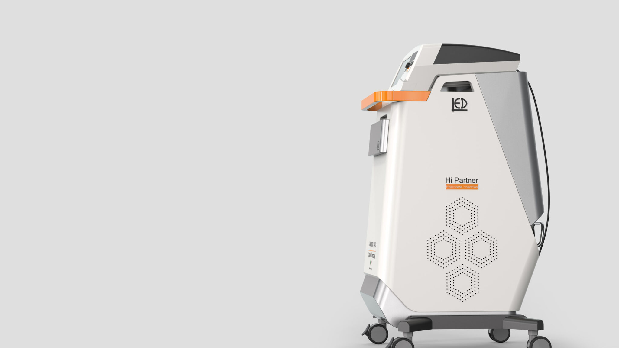 화이트와 다크 그레이의 투톤 컬러 조합은 의료 환경과 높은 조화를 이루며, 청결하고 전문적인 이미지를 전달한다. 여기에 육각형 패턴 모티프는 과학적·기술적 신뢰성을 상징하는 시각적 요소로, 장비가 제공하는 레이저 테라피의 정밀한 에너지 구조를 메타포로 표현하고 있다.