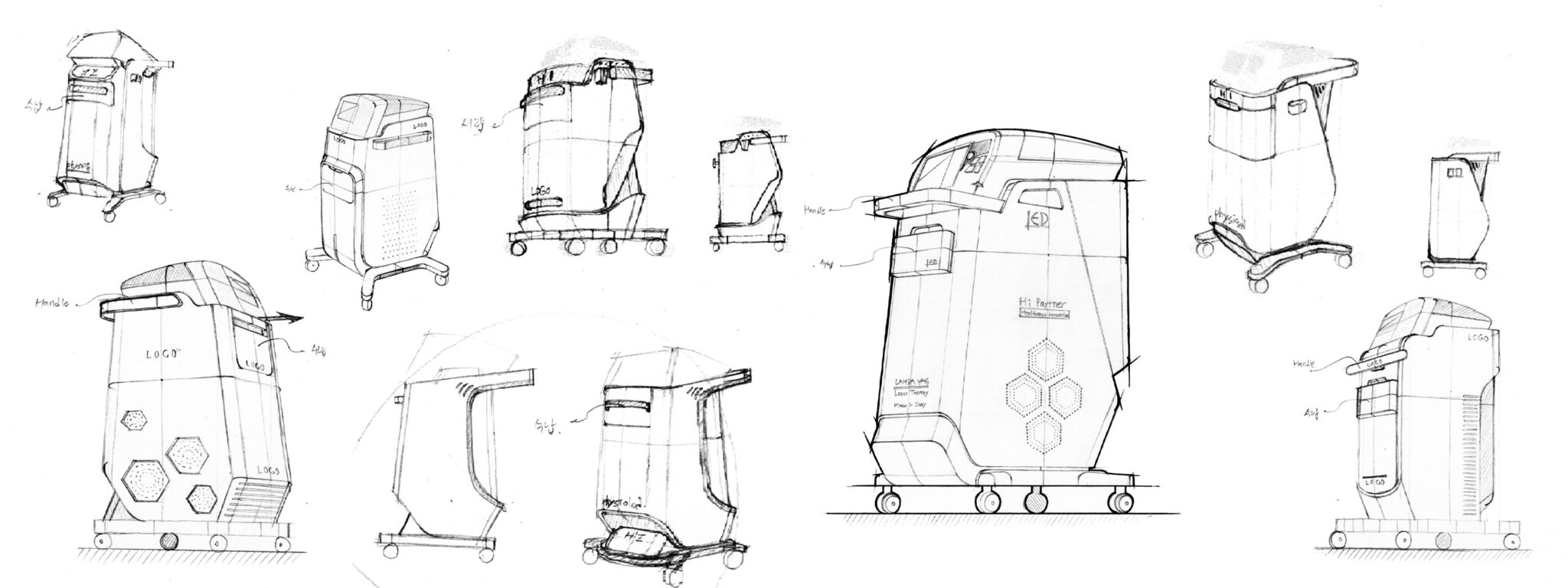 이 디자인은 의료 레이저 장비가 갖추어야 할 안정성·전문성·기능적 직관성을 중심으로 구성된 “Solid Clinical Mobility” 콘셉트다. 전체적인 실루엣은 아래로 갈수록 무게 중심을 잡는 트렁케이티드(Truncated) 구조를 채택해 이동형 장비로서의 안정감을 극대화하고, 전면과 측면의 기하학적 면 분할은 내부 기술력의 정밀함을 외관 조형으로 표현한다.