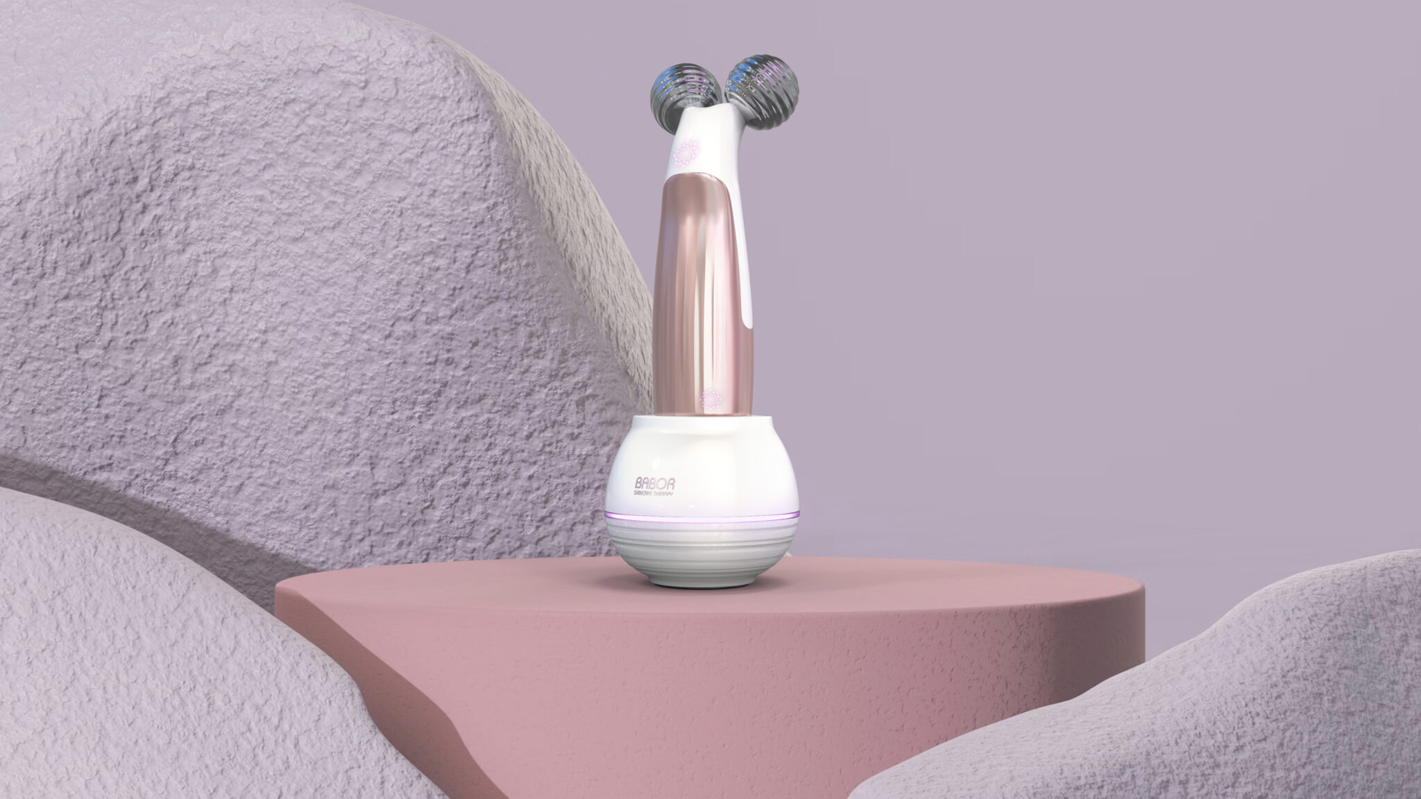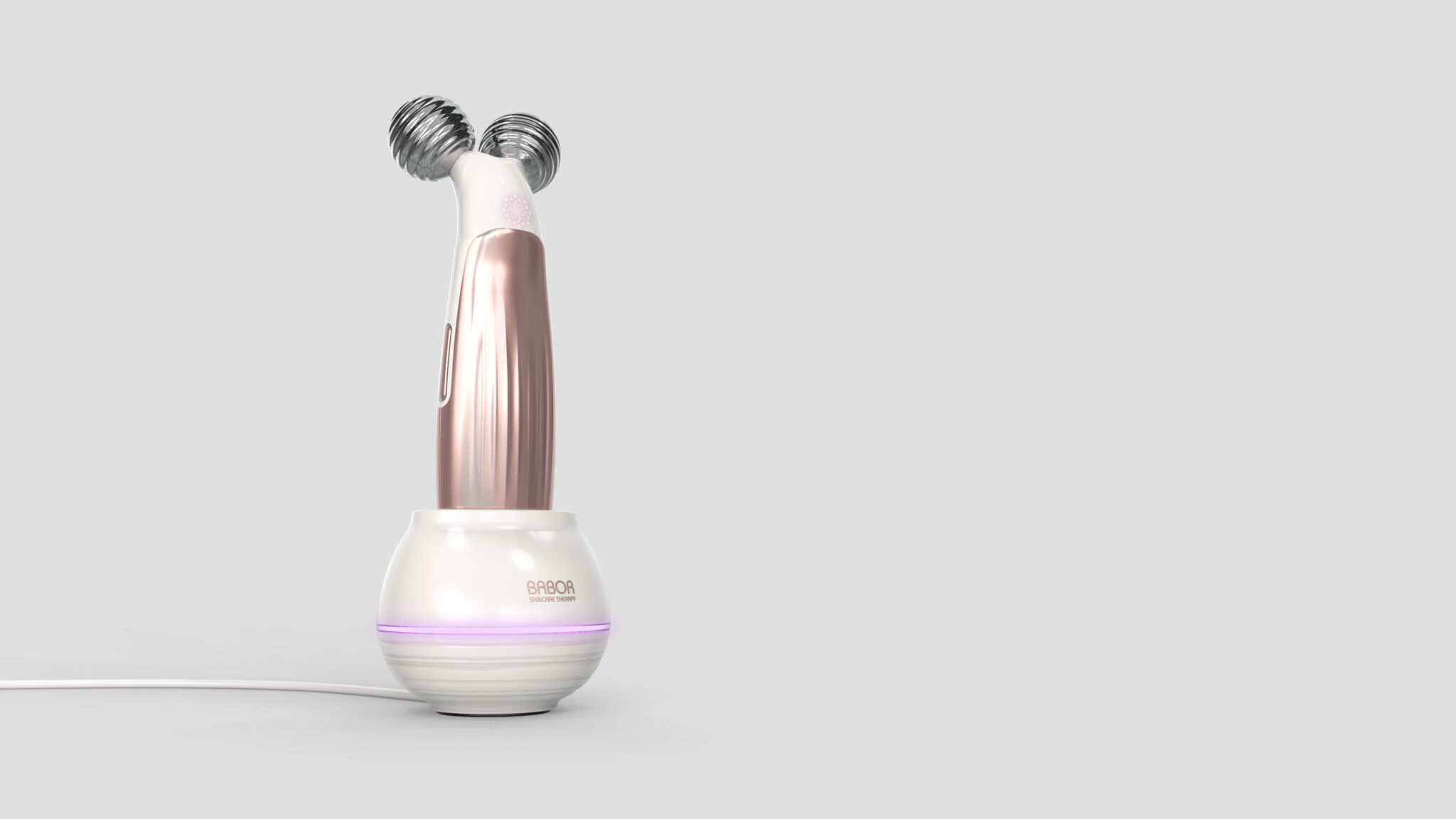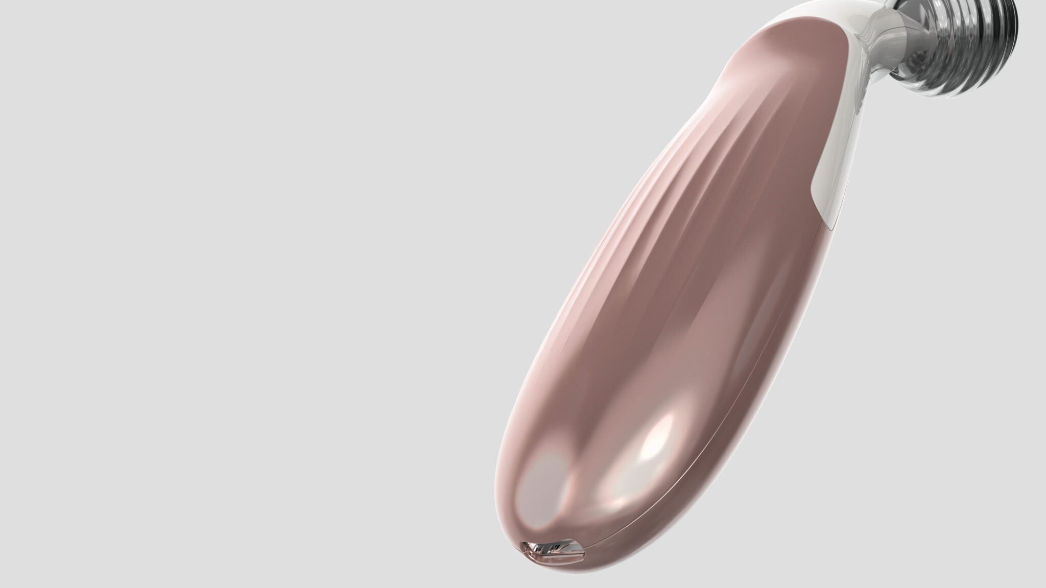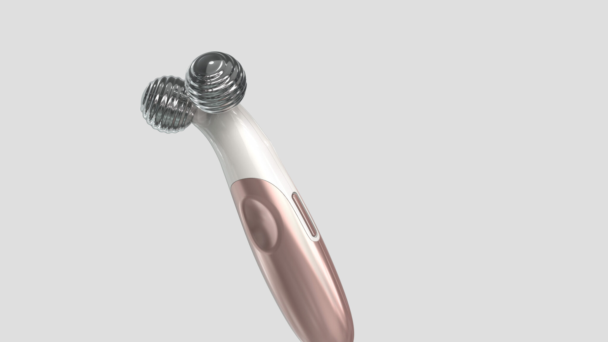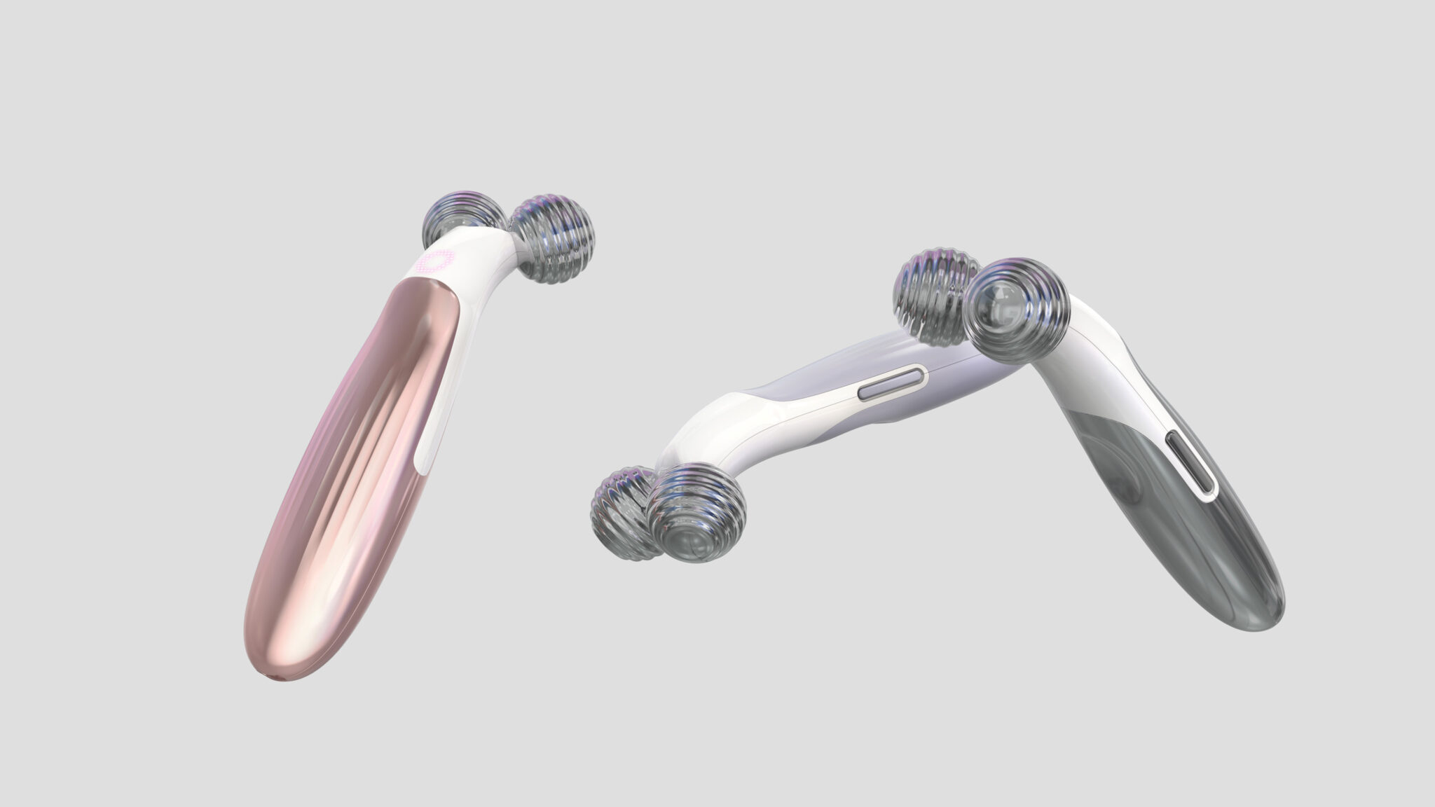 상단의 듀얼 스피어 헤드는 마사지·EMS 자극 기능을 직관적으로 보여주는 상징적 요소이며, 표면의 리플 텍스처와 유리 같은 투명감을 통해 시각적 고급감을 더했다. 바디는 로즈골드 톤의 메탈릭 그라데이션으로 처리되어 프리미엄 뷰티 브랜드의 감성을 극대화한다.