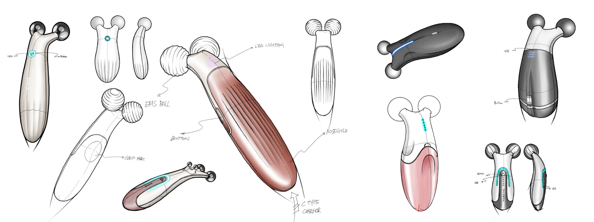 이 제품은 홈케어 시장에서 ‘기능적 디바이스’와 ‘뷰티 오브제’의 경계를 허무는 하이엔드 개인용 EMS 디바이스로 설계되었다. 전체 실루엣은 유연한 곡률과 볼륨감을 중심으로 구성되어, 사용자가 손에 쥐었을 때 자연스럽고 편안한 촉감을 제공한다. 이는 단순한 기계적 형태가 아닌, 감성을 담아낸 디자인이라는 점을 강조한다.