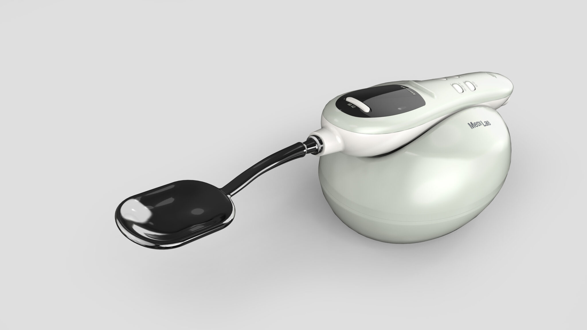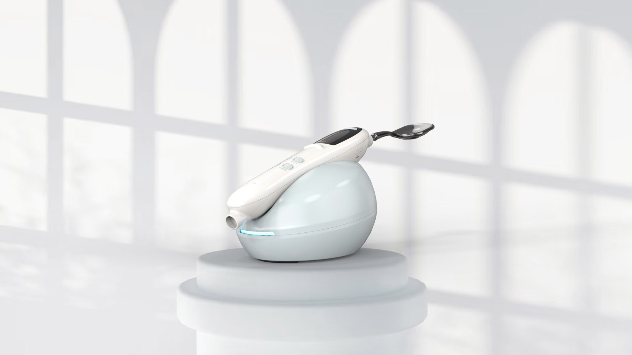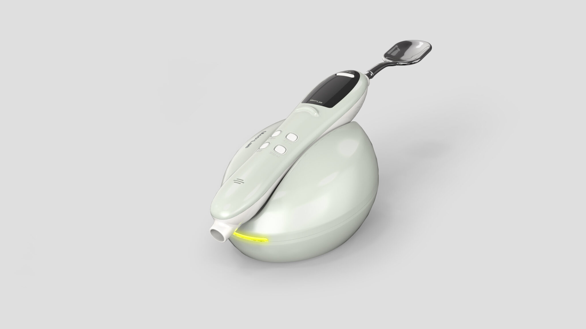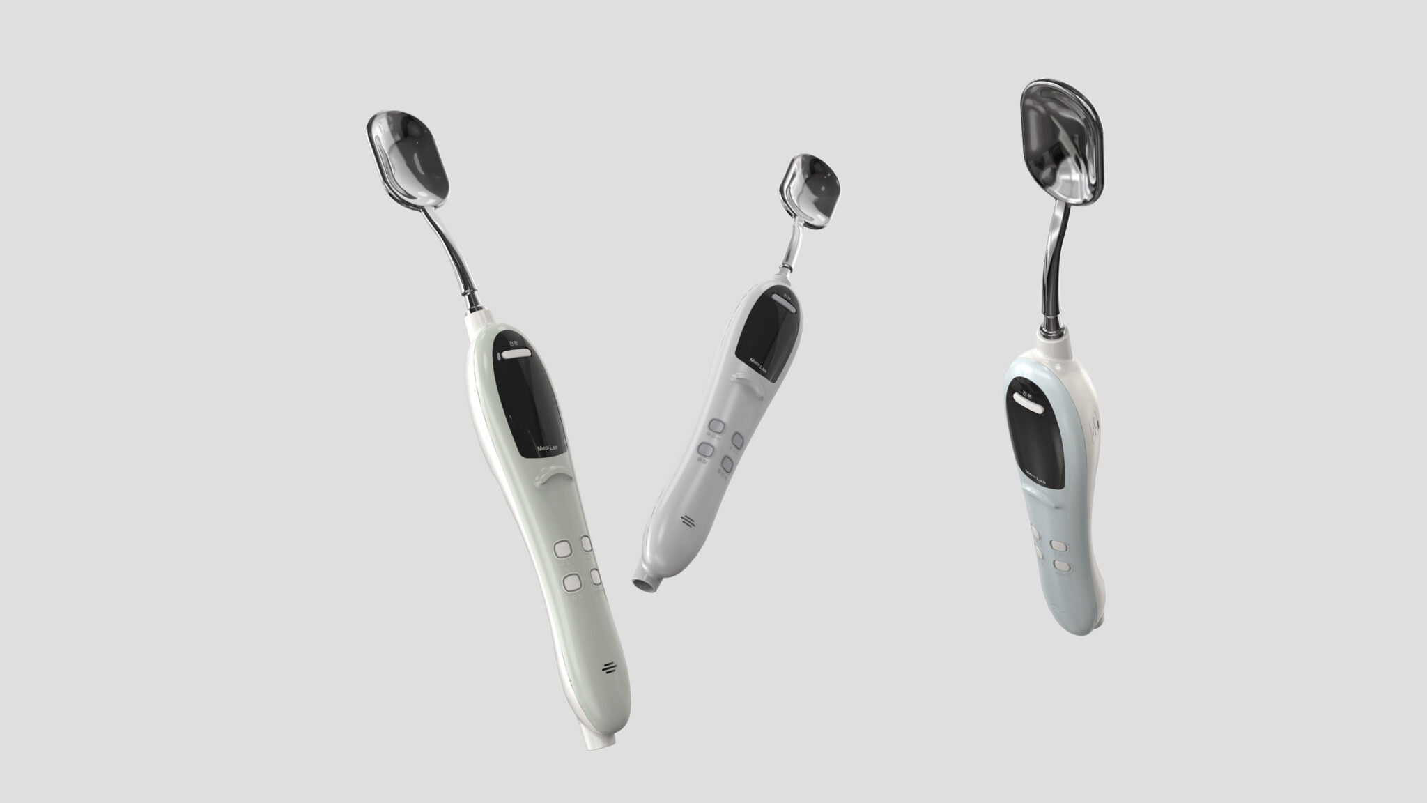 컬러 팔레트는 미스트 화이트 & 소프트 실버 조합으로 가정용 의료기기에서 중요한 순수함·안전성·신뢰감을 시각적으로 표현하며, 전체 질감은 세미 글로스 + 하이글로스 포인트를 혼합하여 의료적 전문성과 뷰티 디바이스의 감각적인 외관을 균형 있게 담아냈다.