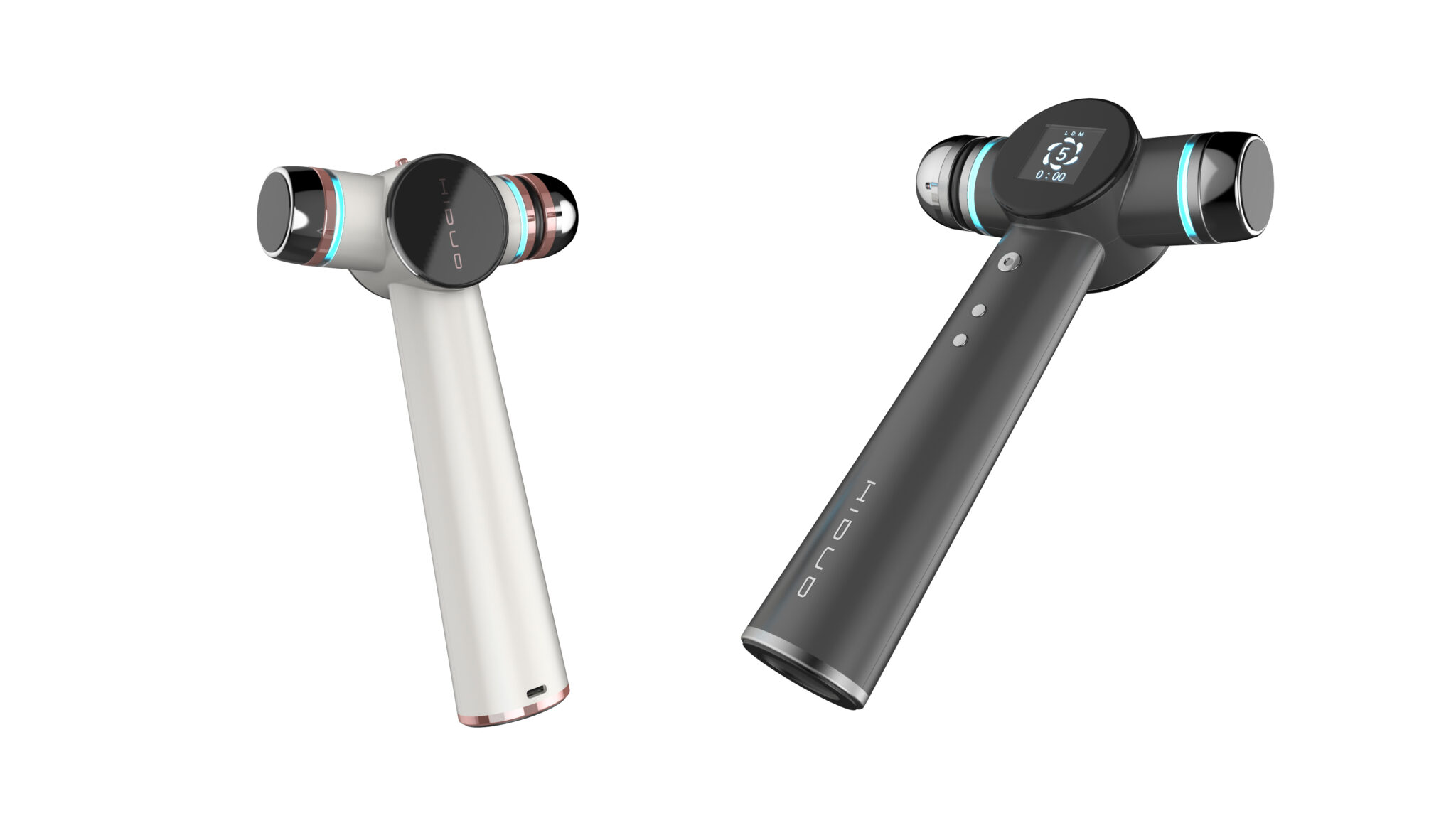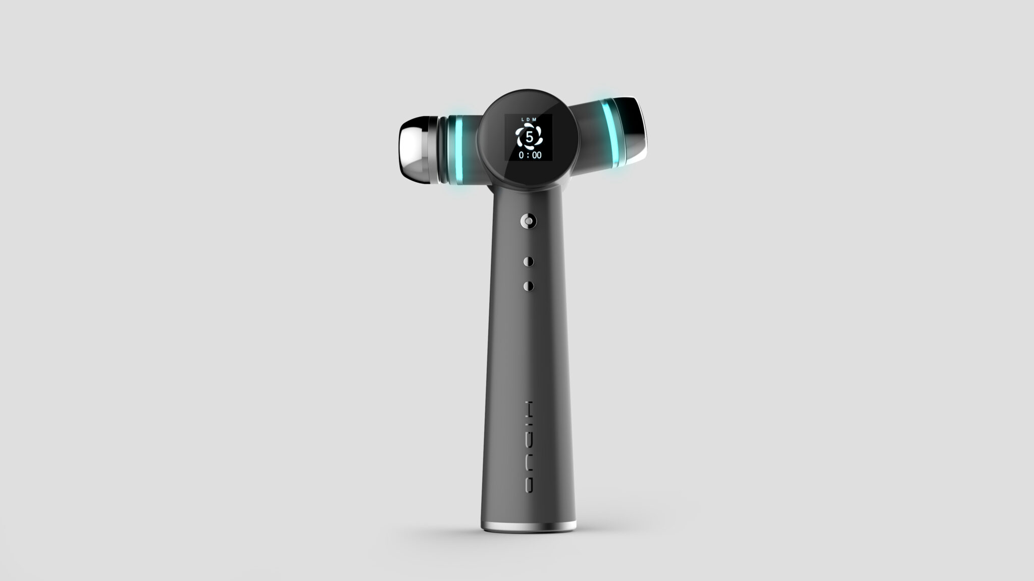 양측에 배치된 헤드 모듈은 좌우 균형을 이루며, 시술 부위에 따라 다양한 각도와 압력을 자연스럽게 조절할 수 있게 한다. 원형 메탈 헤드와 라이트 링은 에너지 전달 부위를 명확히 시각화하면서도, 과도한 테크 이미지를 배제한 정제된 기술 표현을 구현한다. 은은한 블루 계열 라이팅은 작동 상태와 강도를 직관적으로 전달하며, 사용자에게 심리적 신뢰감을 부여한다.