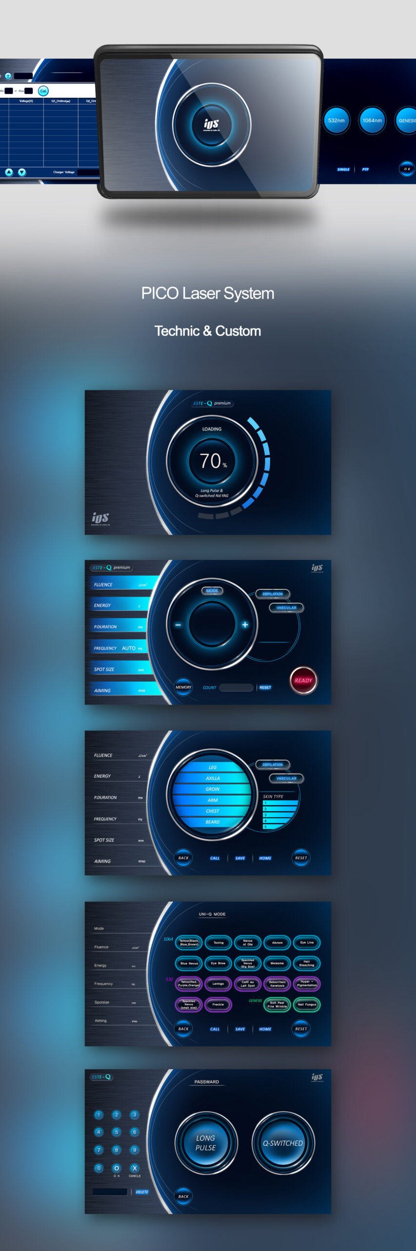 이 UI는 “Technic & Custom”이라는 핵심 방향성에 맞춰, PICO Laser의 기술력을 시각적으로 강화하고 사용자가 시술 부위·피부 타입·파장·모드를 자유롭게 커스터마이징할 수 있도록 설계된 인터페이스다.