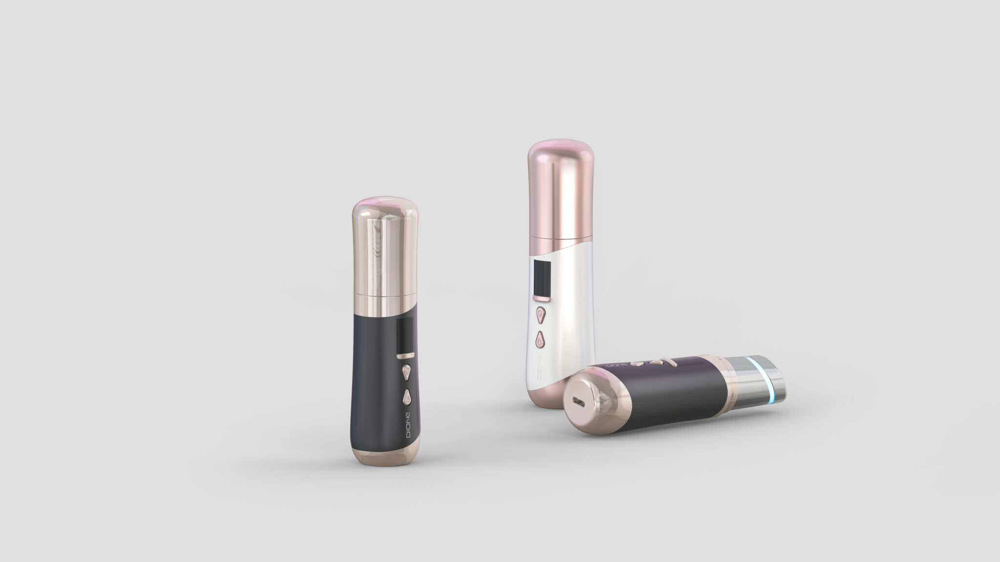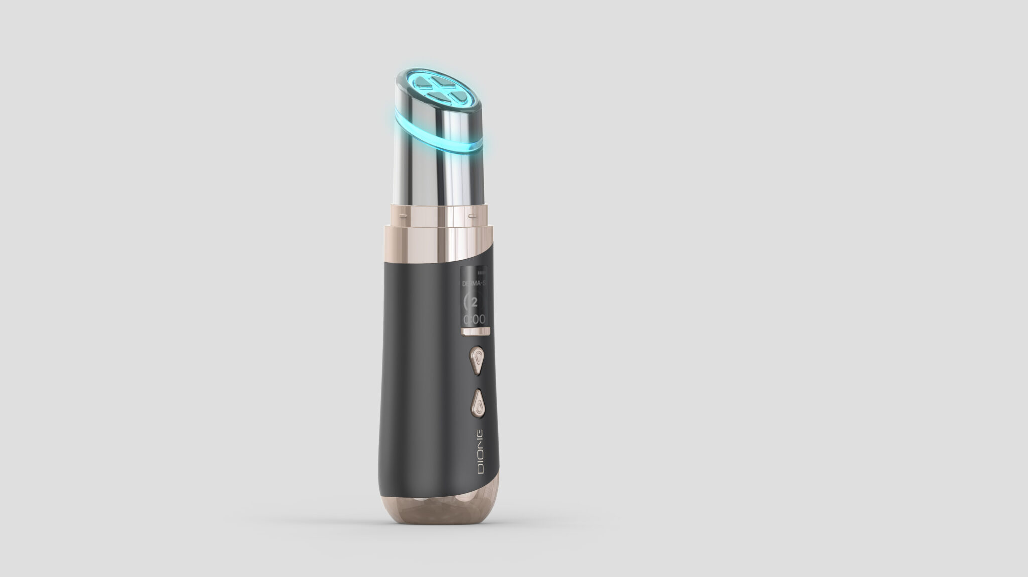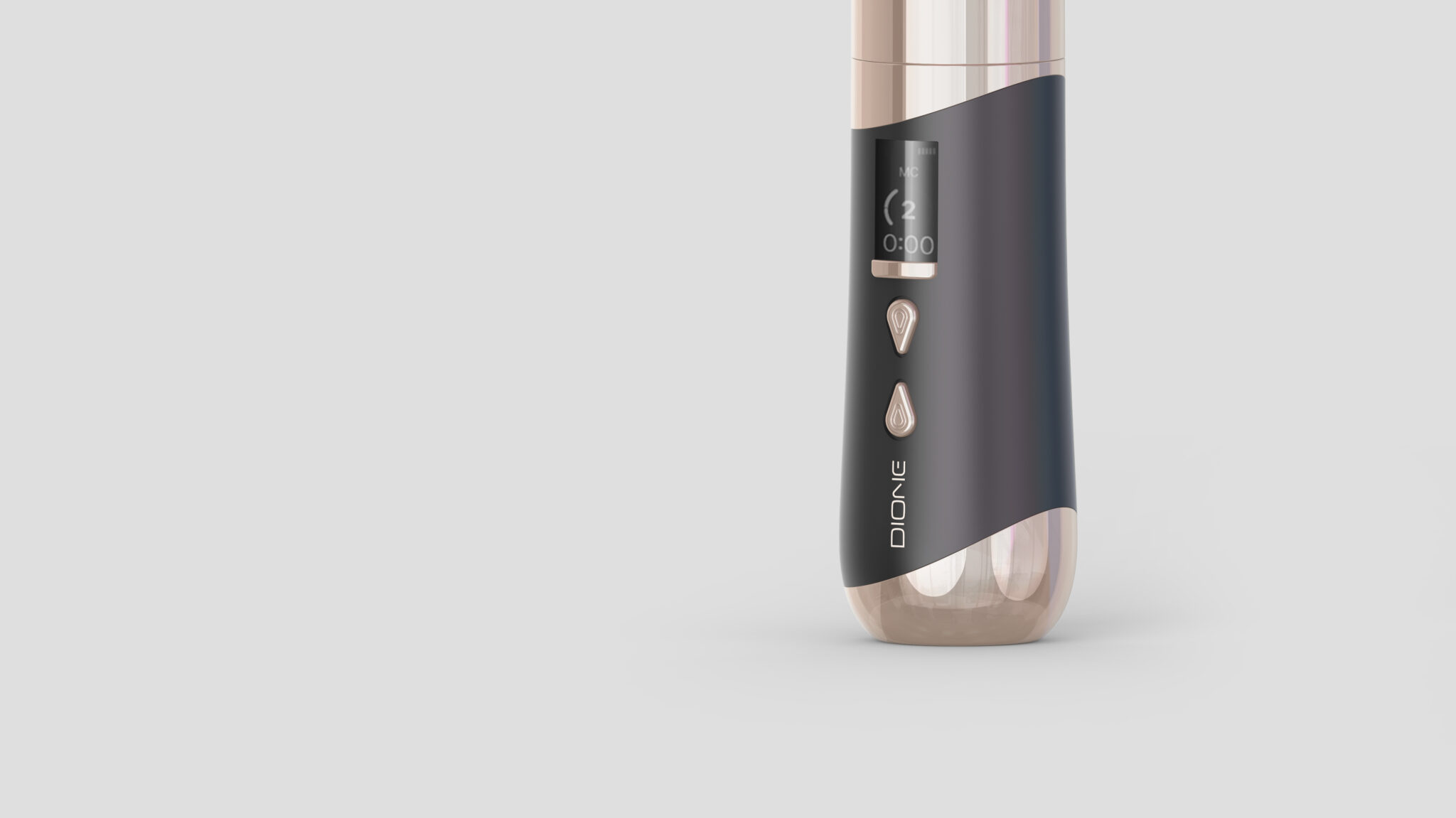 상·하단의 로즈골드 메탈 캡은 시각적 무게 중심을 명확히 하며, 제품을 세워두었을 때 오브제로서의 완성도를 높인다. 이는 단순한 장식 요소가 아니라, 프리미엄 안티에이징 기기에 요구되는 신뢰·고급·정밀의 이미지를 직관적으로 전달하는 핵심 디자인 언어다.