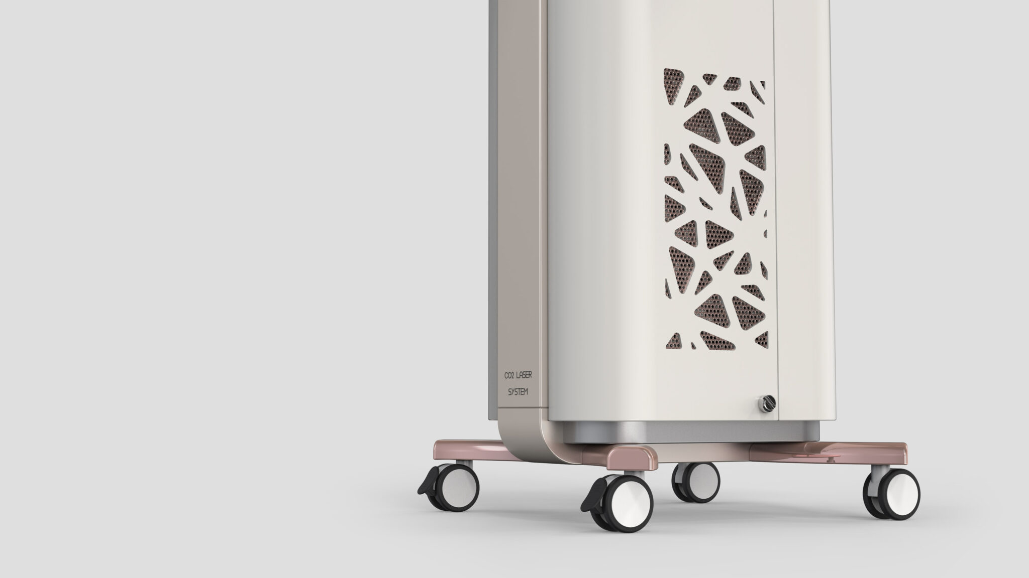바디는 따뜻한 로즈-메탈 포인트 컬러와 미니멀한 화이트·샌드 톤의 조합으로 구성되어, 기계적 차가움을 완화하며 프리미엄 의료 브랜드 감성을 구축한다. 특히 하단과 측면의 기하학적 벤트 패턴은 냉각 기능을 시각적 오브제로 승화시켜, 기술적 기능성과 장식적 완성도를 동시에 확보한다.