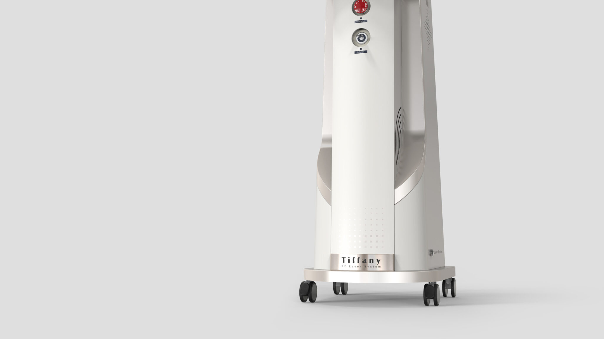 전체적인 형태는 슬림한 타워형 실루엣으로 정리되어 있으며, 측면의 곡면 라인과 상단으로 자연스럽게 이어지는 프로파일은 레이저 장비 특유의 기계적 긴장감을 부드러운 흐름으로 중화시킨다.