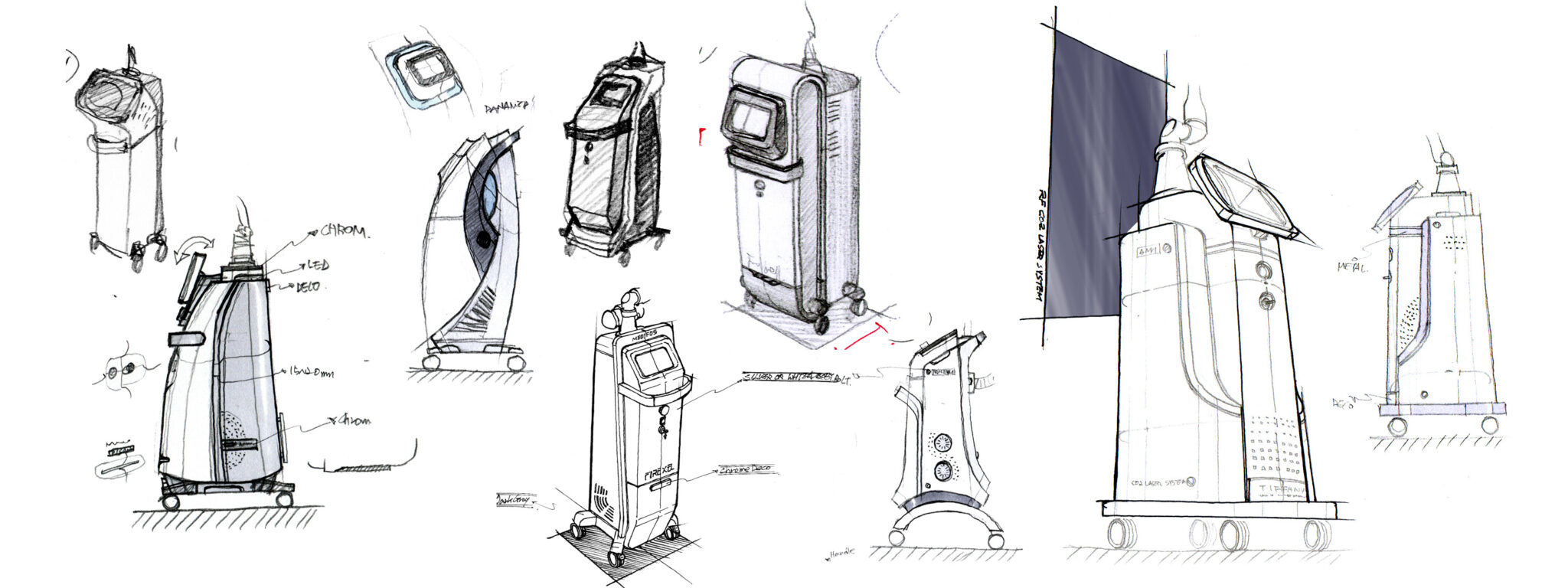 전면 UI 모듈은 사용자 중심의 각도·높이를 고려한 배치로, 시술자의 작업 효율성과 직관적 사용성을 강화한다. 또한 측면 벤틸레이션 패턴은 단순 통풍구를 넘어 장비 아이덴티티를 만드는 심미적 그래픽 요소로 재해석되어 있다.
