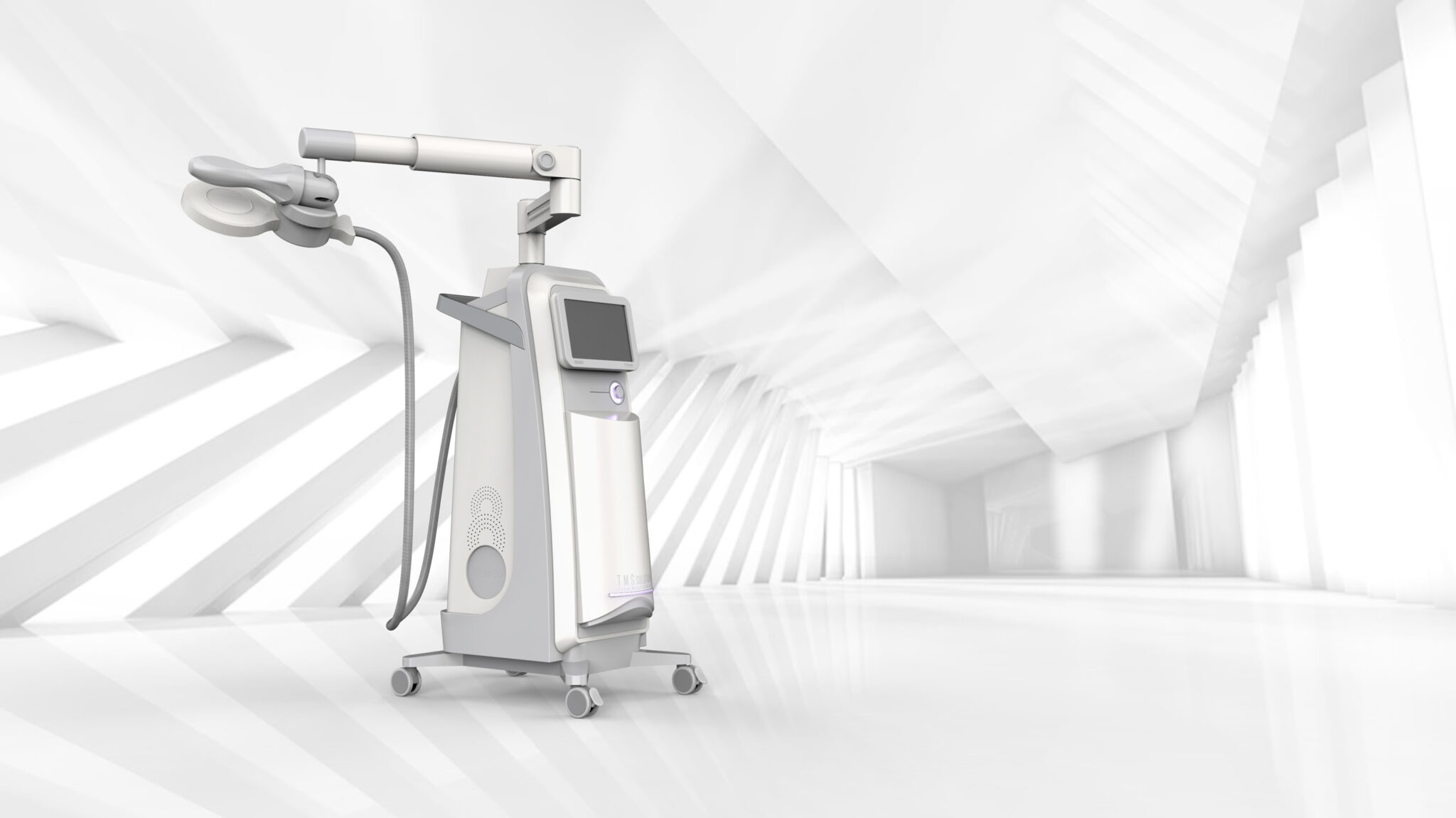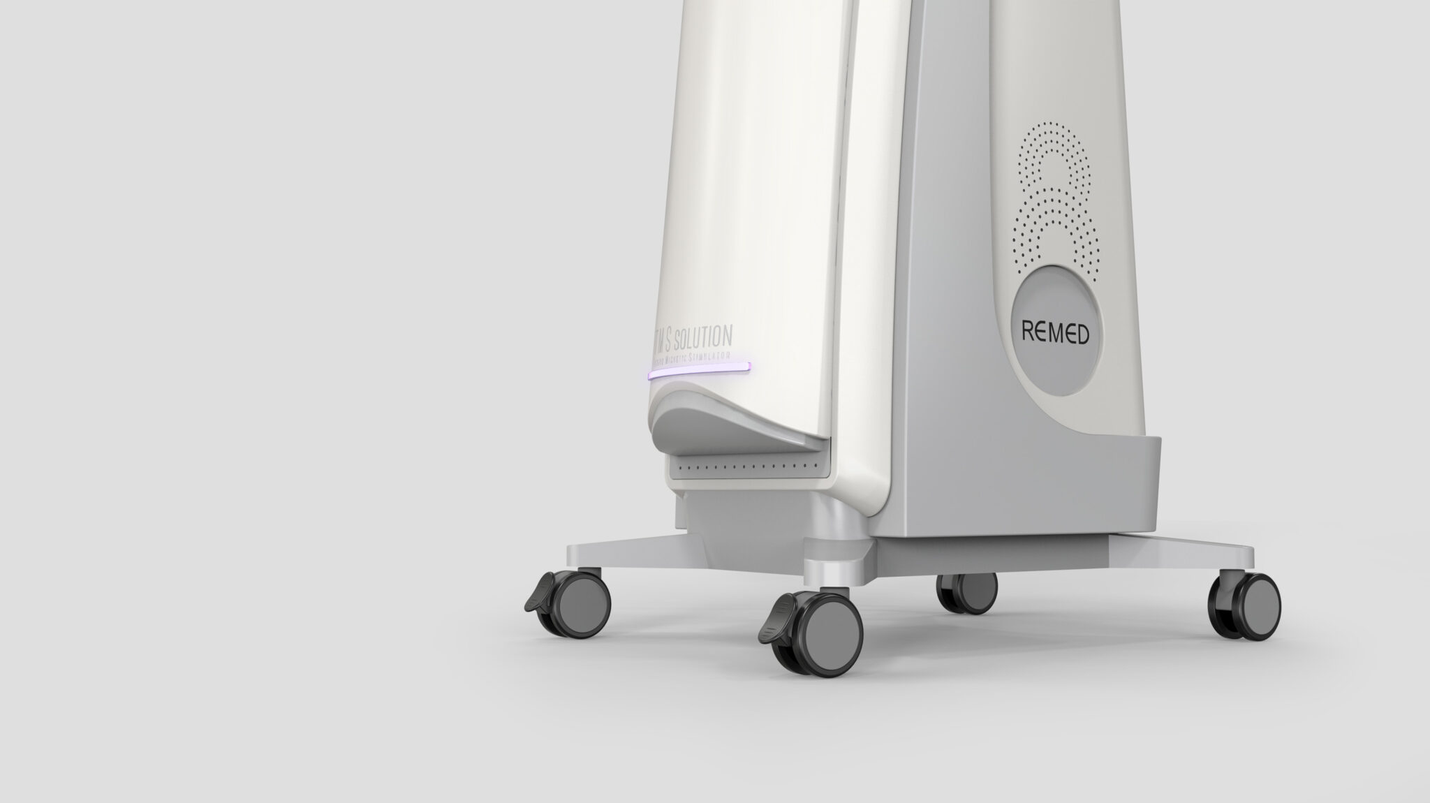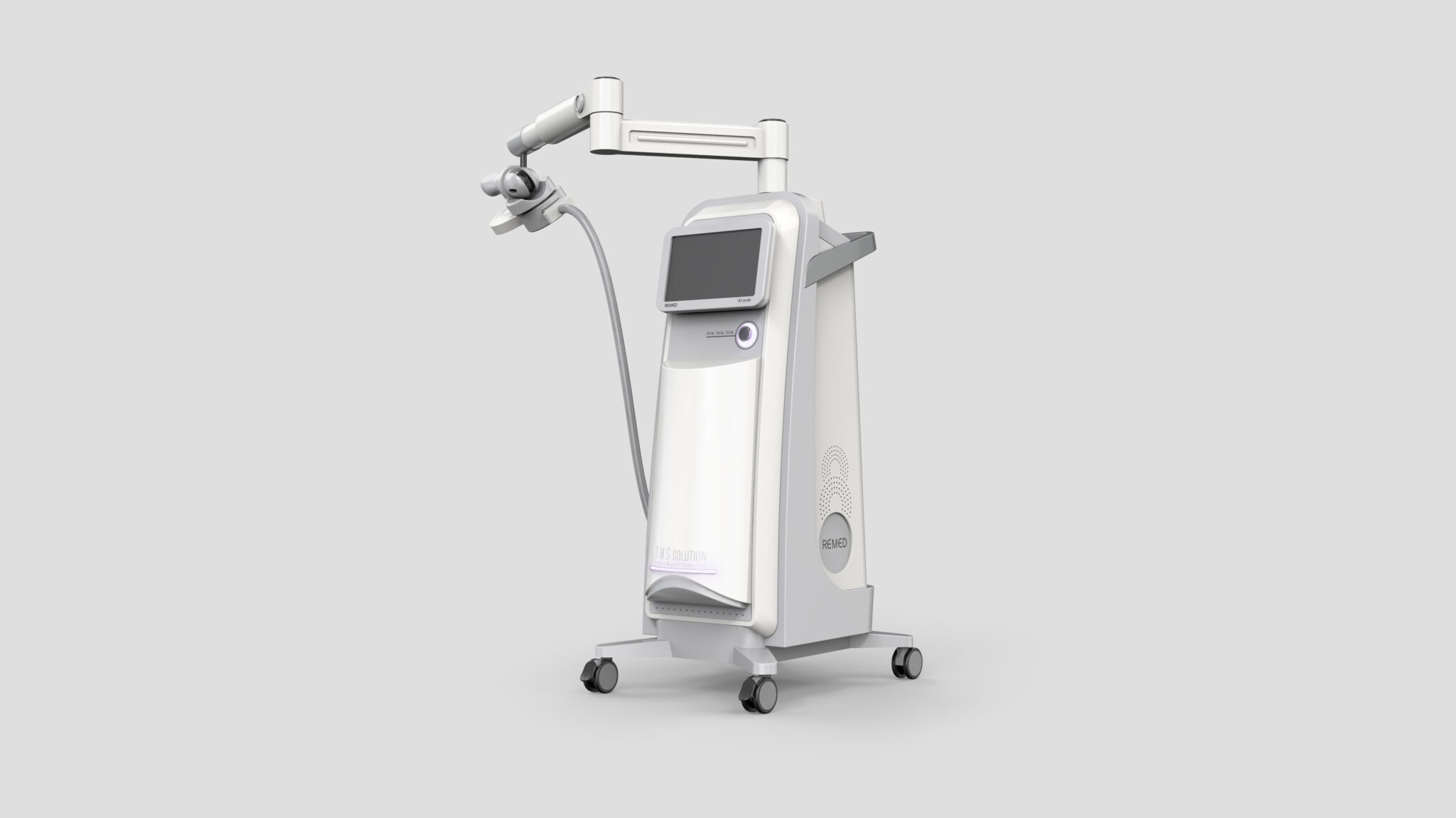 본체는 수직으로 길게 뻗은 심플한 실루엣을 토대로, 중심부에 배치된 조작 패널과 은은한 라이트 요소가 정밀한 치료 장비로서의 정체성을 부각한다. 상단에 설치된 모듈형 회전 암(Arm)은 다양한 치료 포지션을 유연하게 지원하며, 의료진의 동선을 고려한 인체공학적 조작성과 접근성을 제공한다.