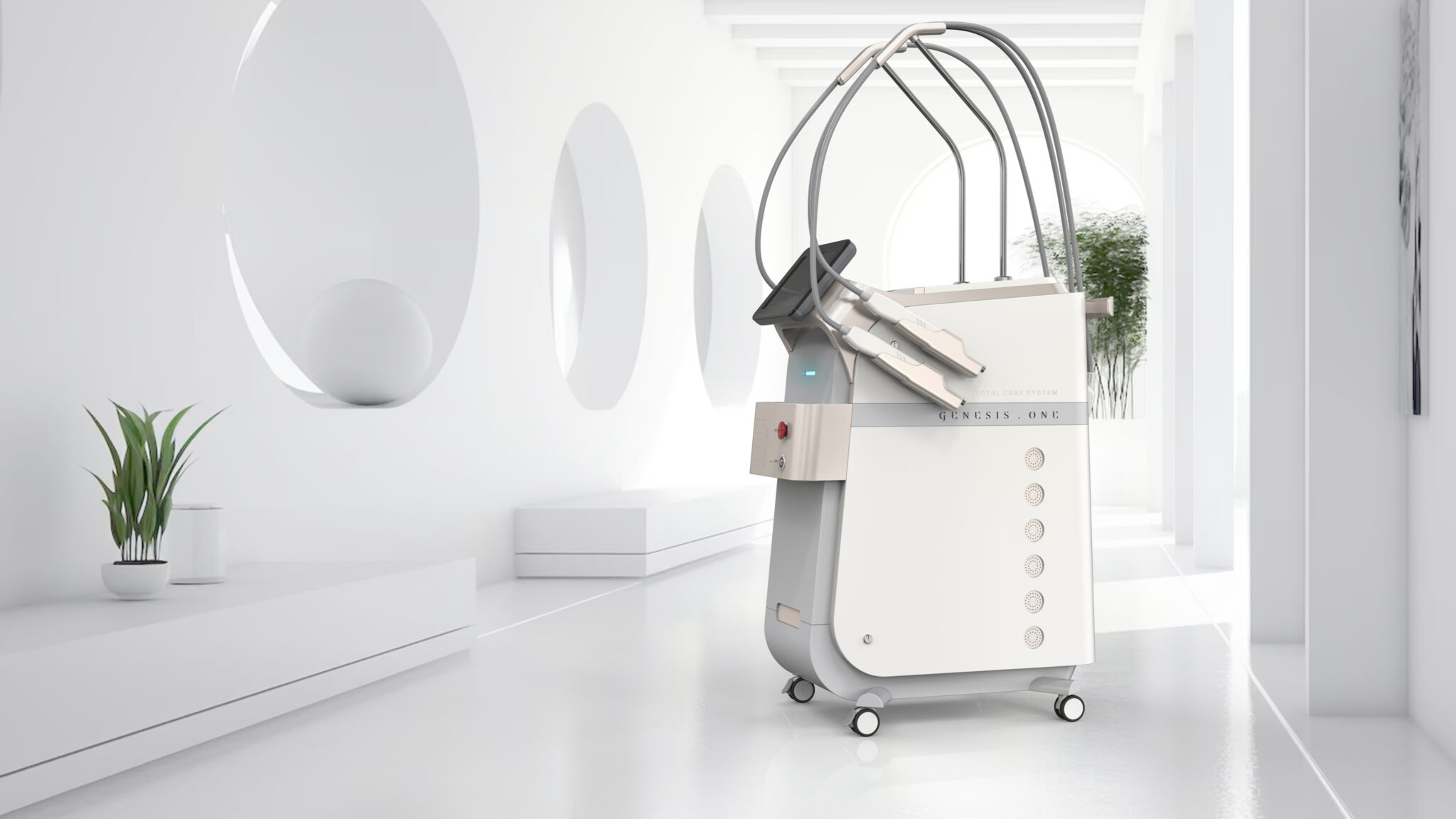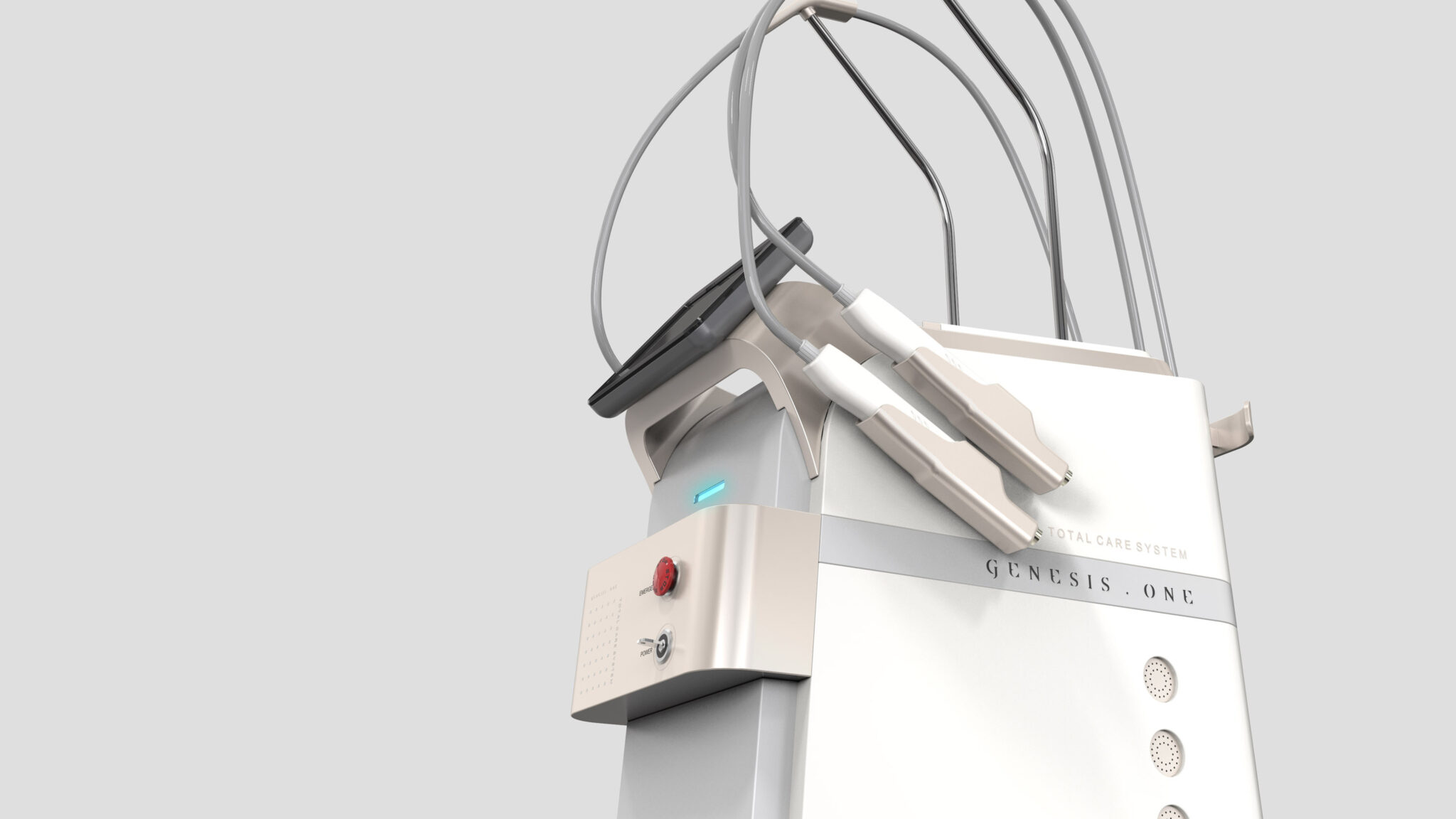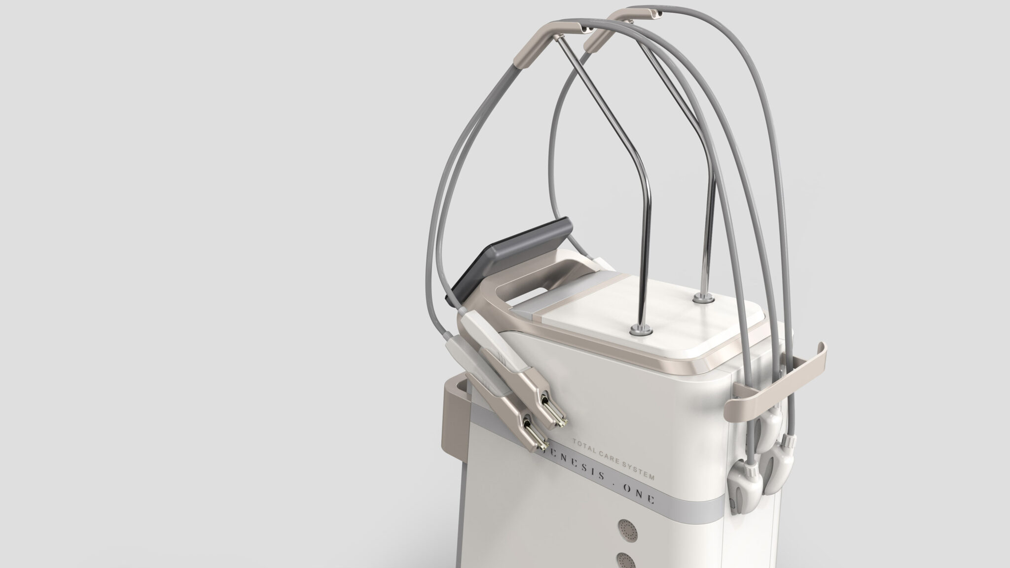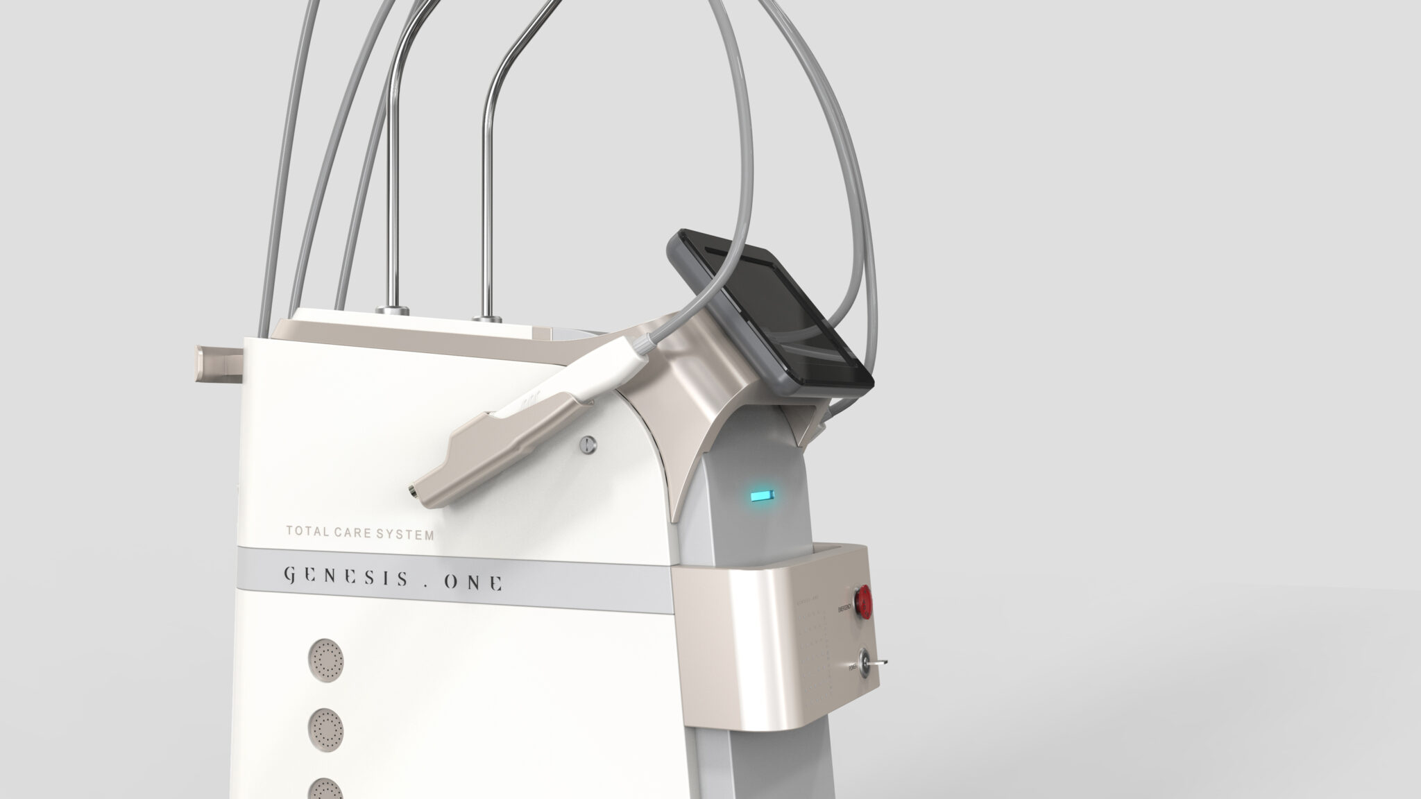 핸드피스와 케이블은 상단 구조물에서 조화로운 곡률로 자연스럽게 흐르도록 설계되어 복잡한 멀티 시술 프로세스를 ‘정리된 경험’으로 재해석한다. 이를 통해 많은 기능을 담고 있으면서도 시각적 혼잡 없이 프리미엄 의료환경에 어울리는 균형감 있는 실루엣을 완성한다.